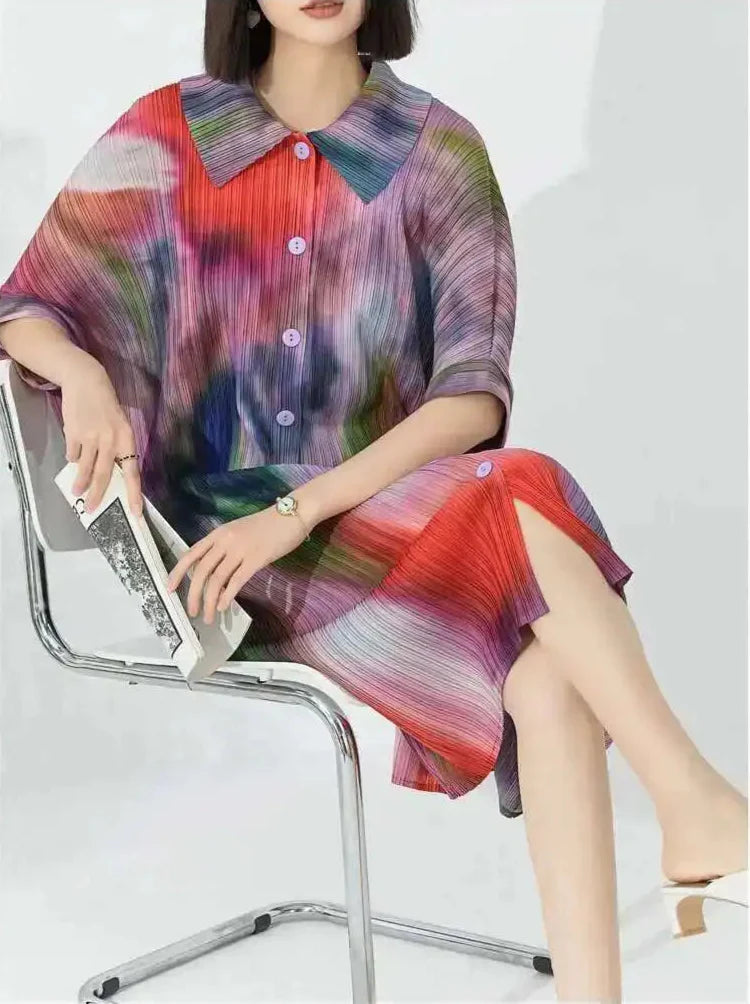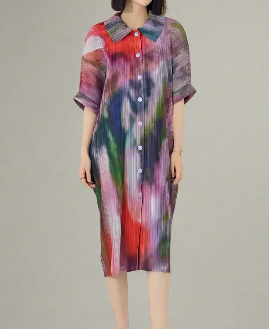 A blouse-style midi dress designed with Japanese plissé pleats and a bold abstract print. Featuring short batwing sleeves and a relaxed fit, it blends sophistication with comfort.