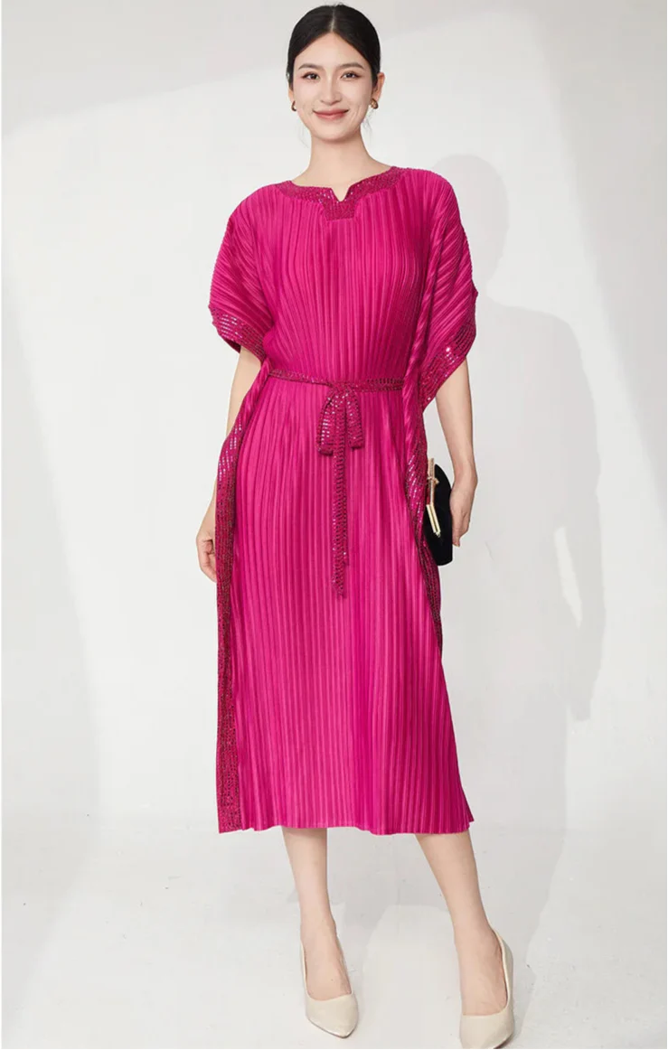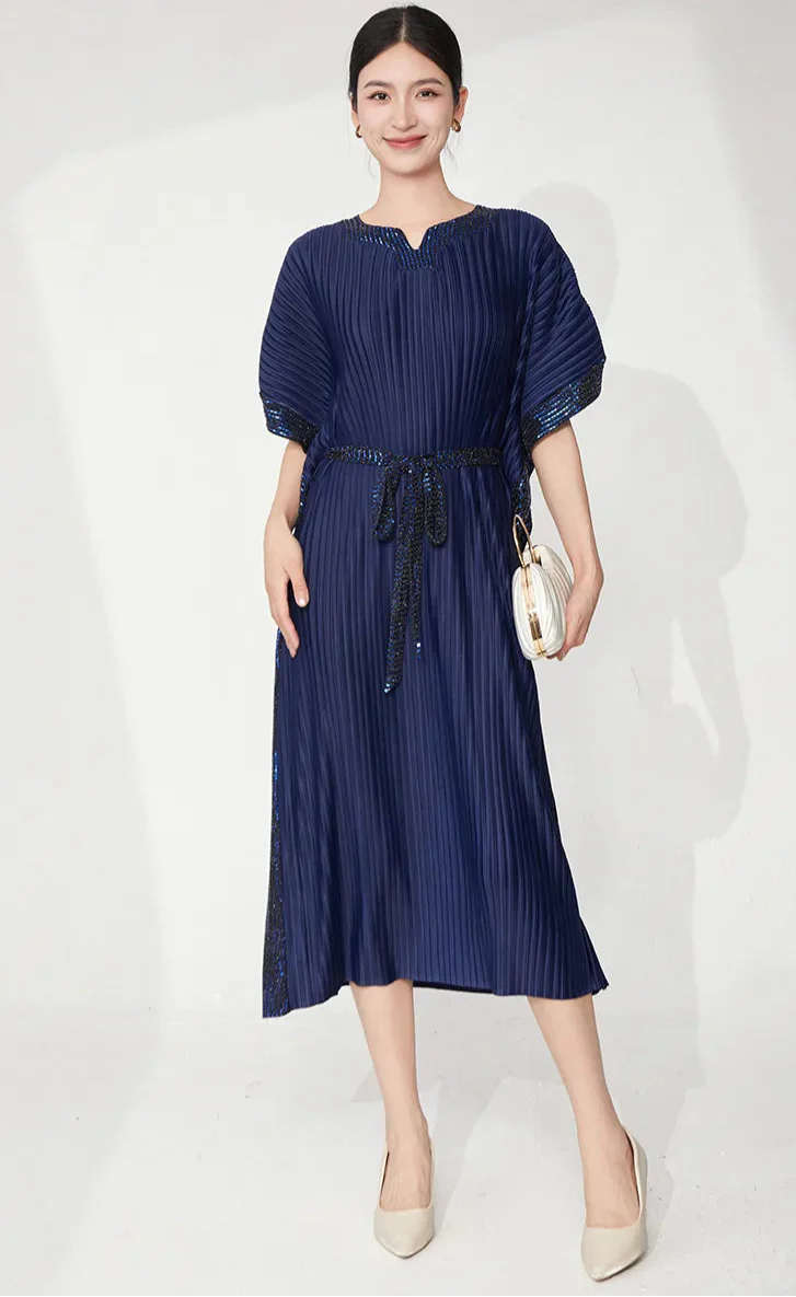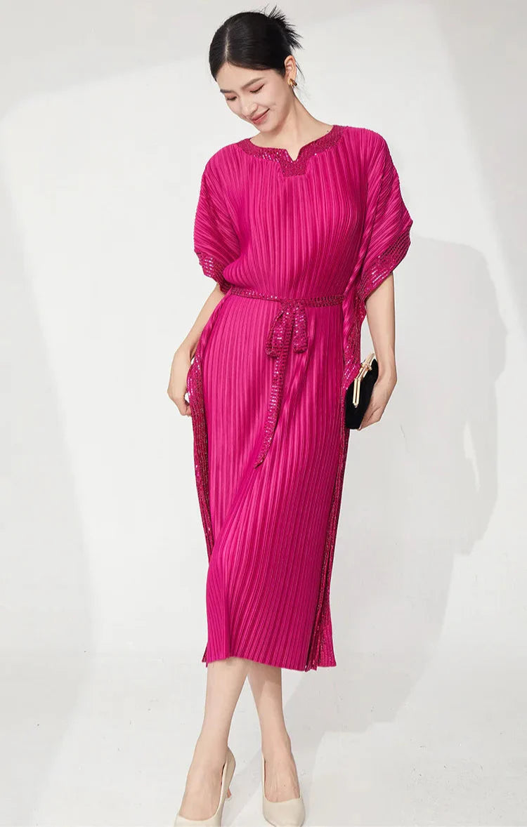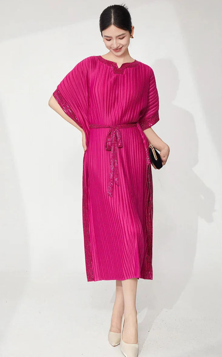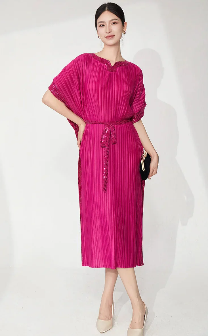 A sophisticated midi dress designed with signature Japanese pleats and flowing batwing sleeves.