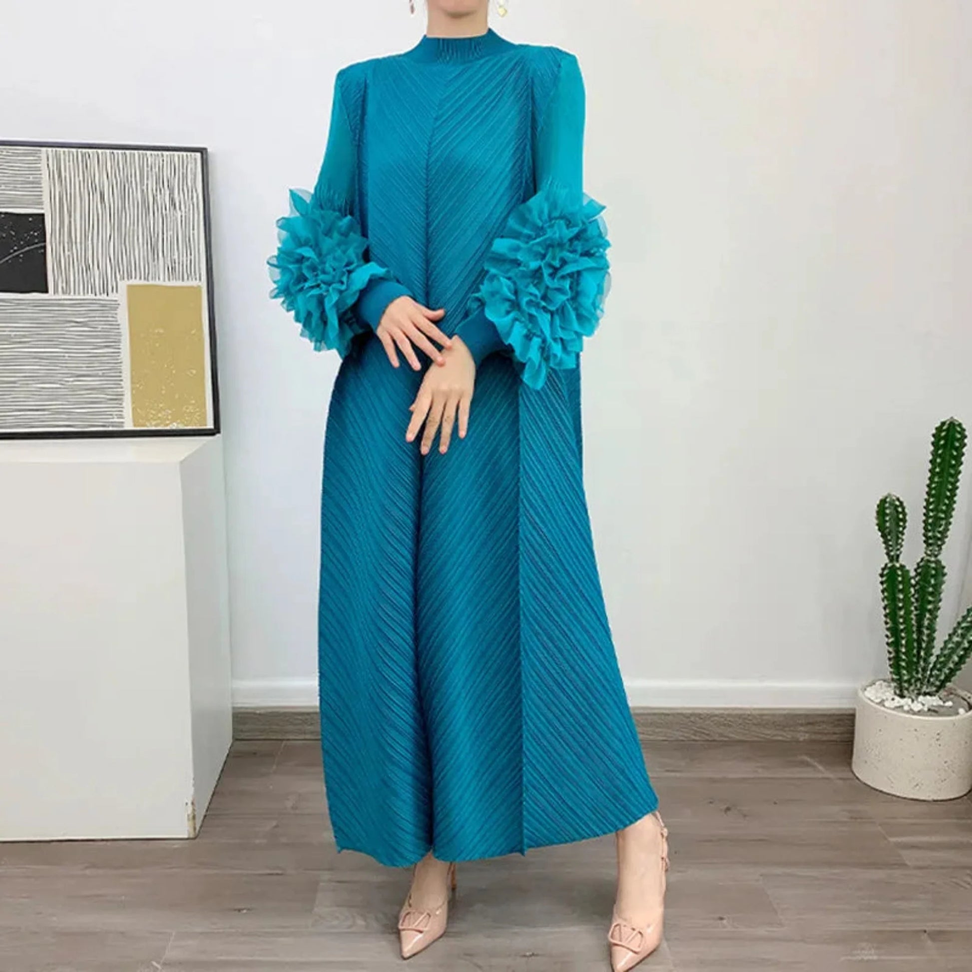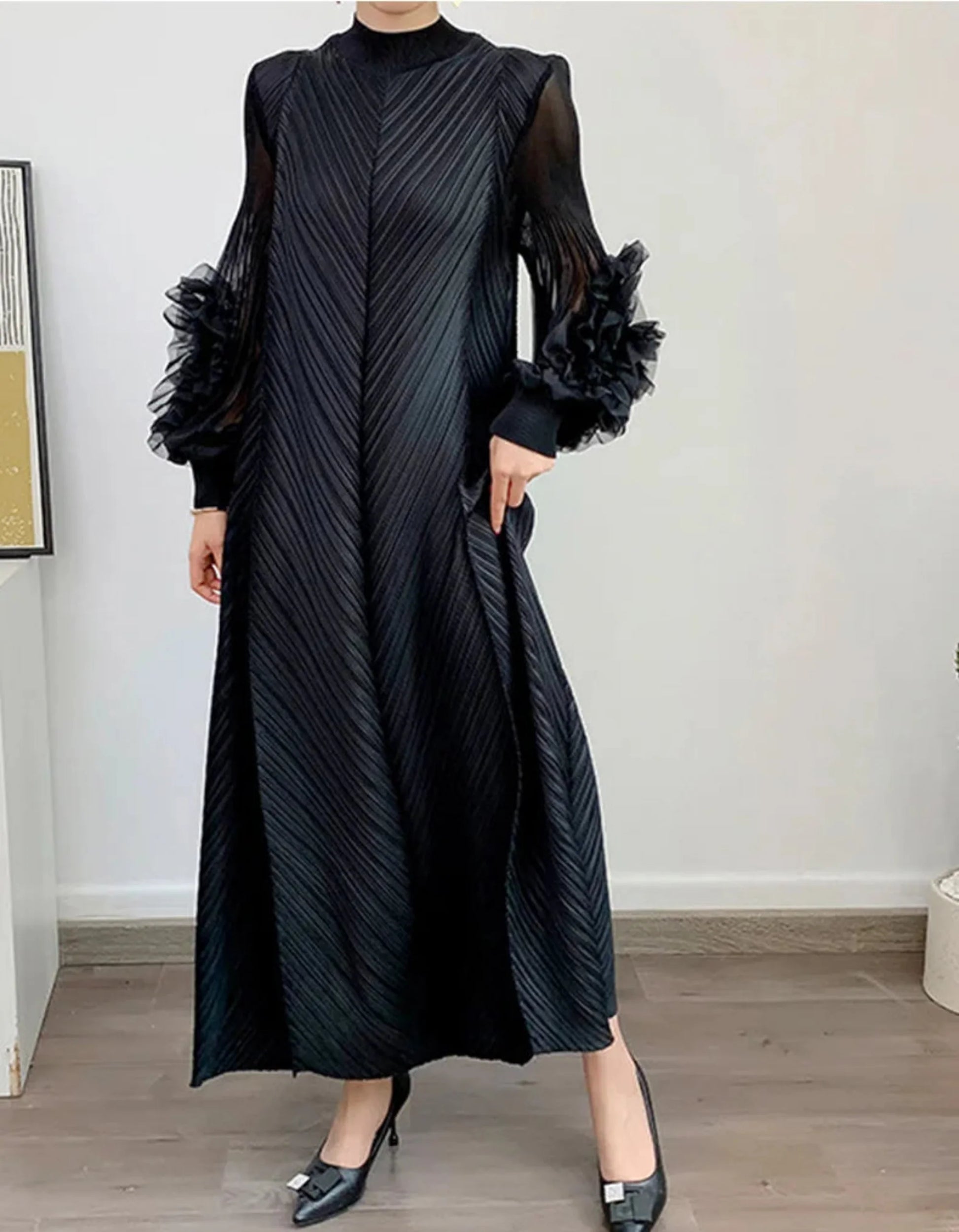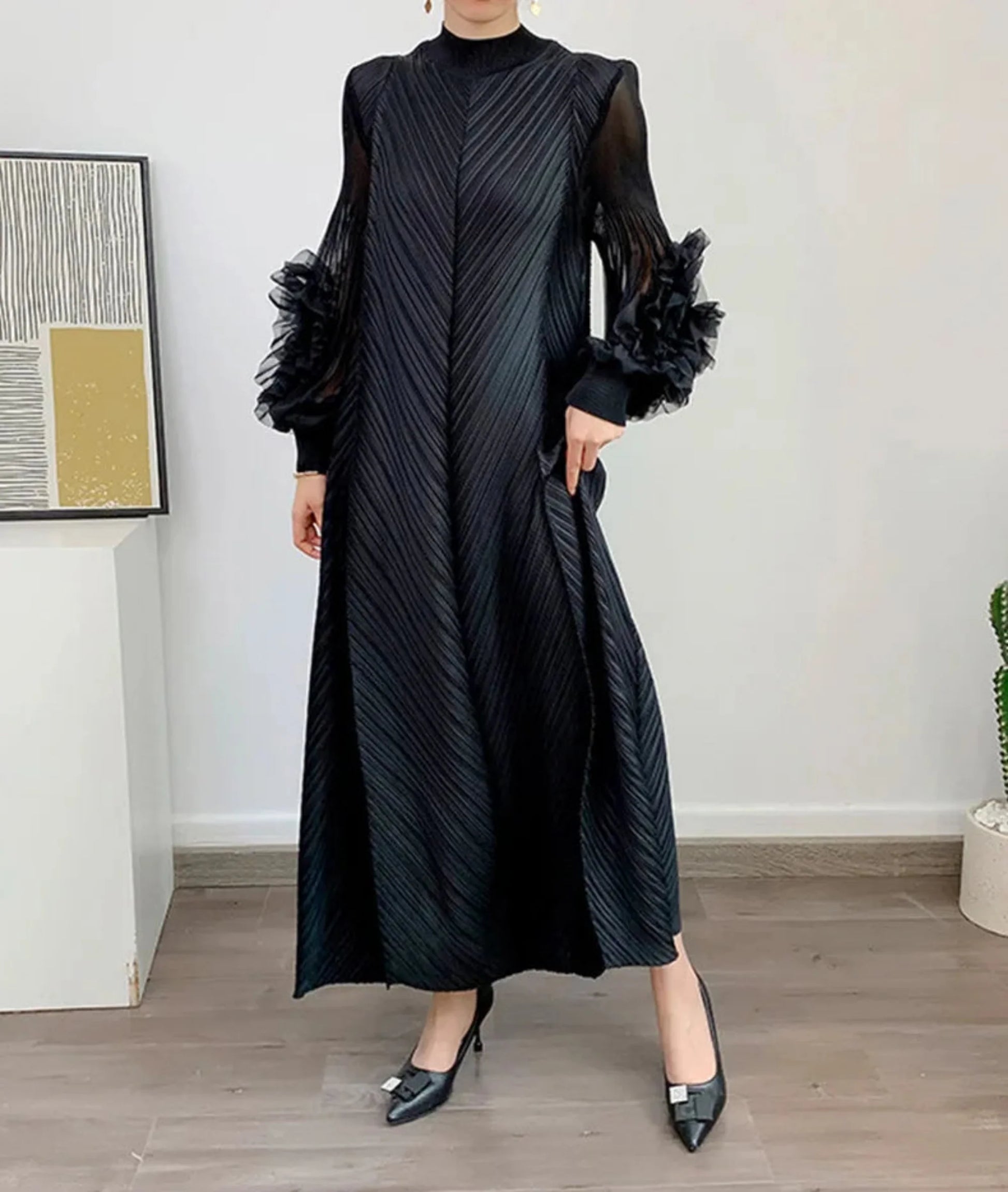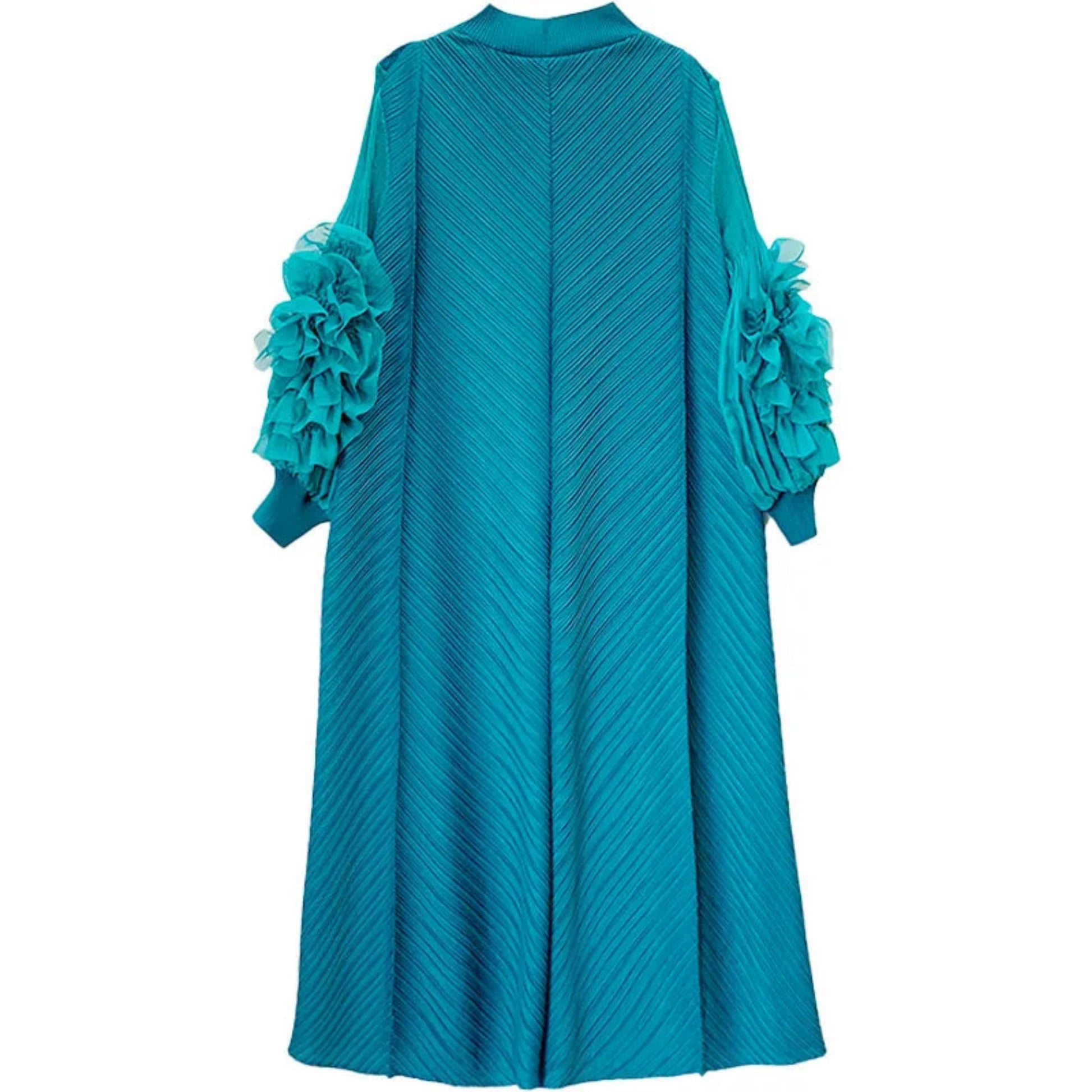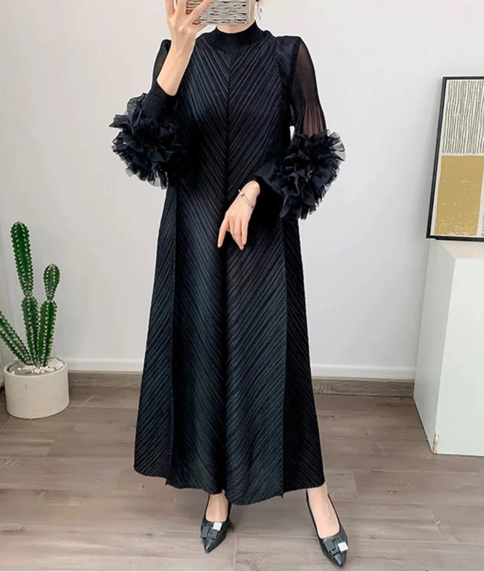 This Japanese Plissé Pleated Midi Dress combines artistry and elegance with delicate pleats and ruffled sleeves shaped like flowers. Designed with long sleeves and a flattering silhouette, it offers a unique, sophisticated style perfect for any refined occasion.