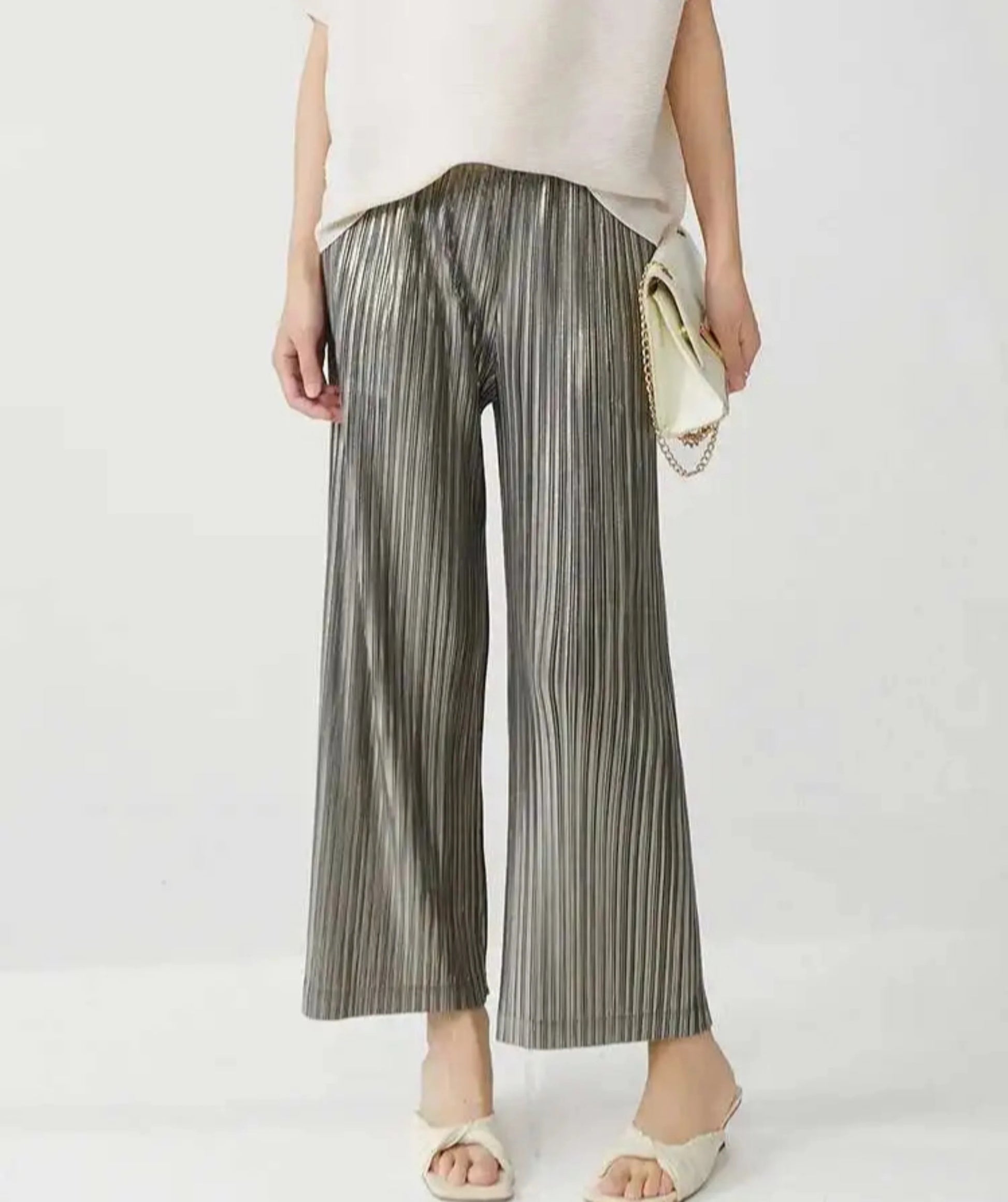 Wide-leg trousers featuring signature Japanese plissé pleats with a flattering high waist.