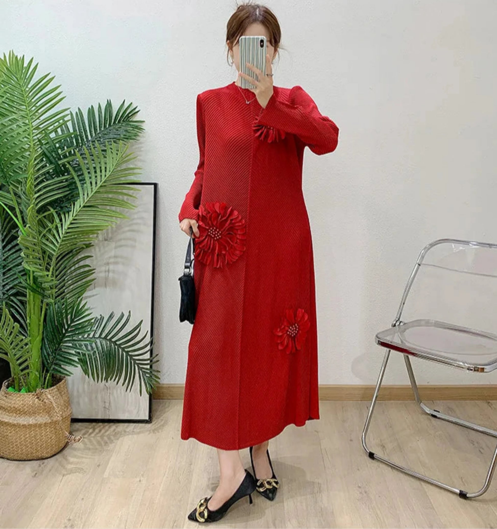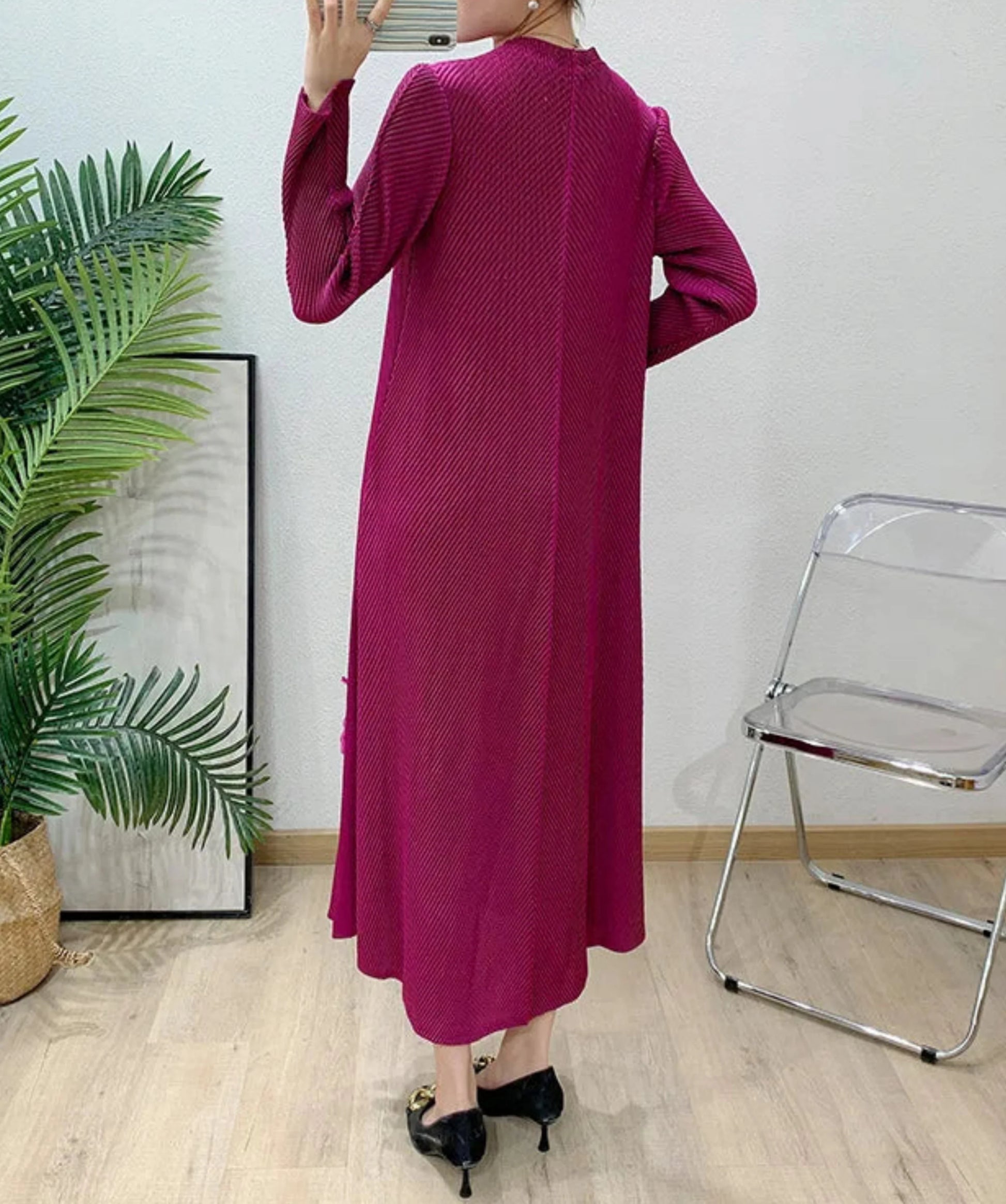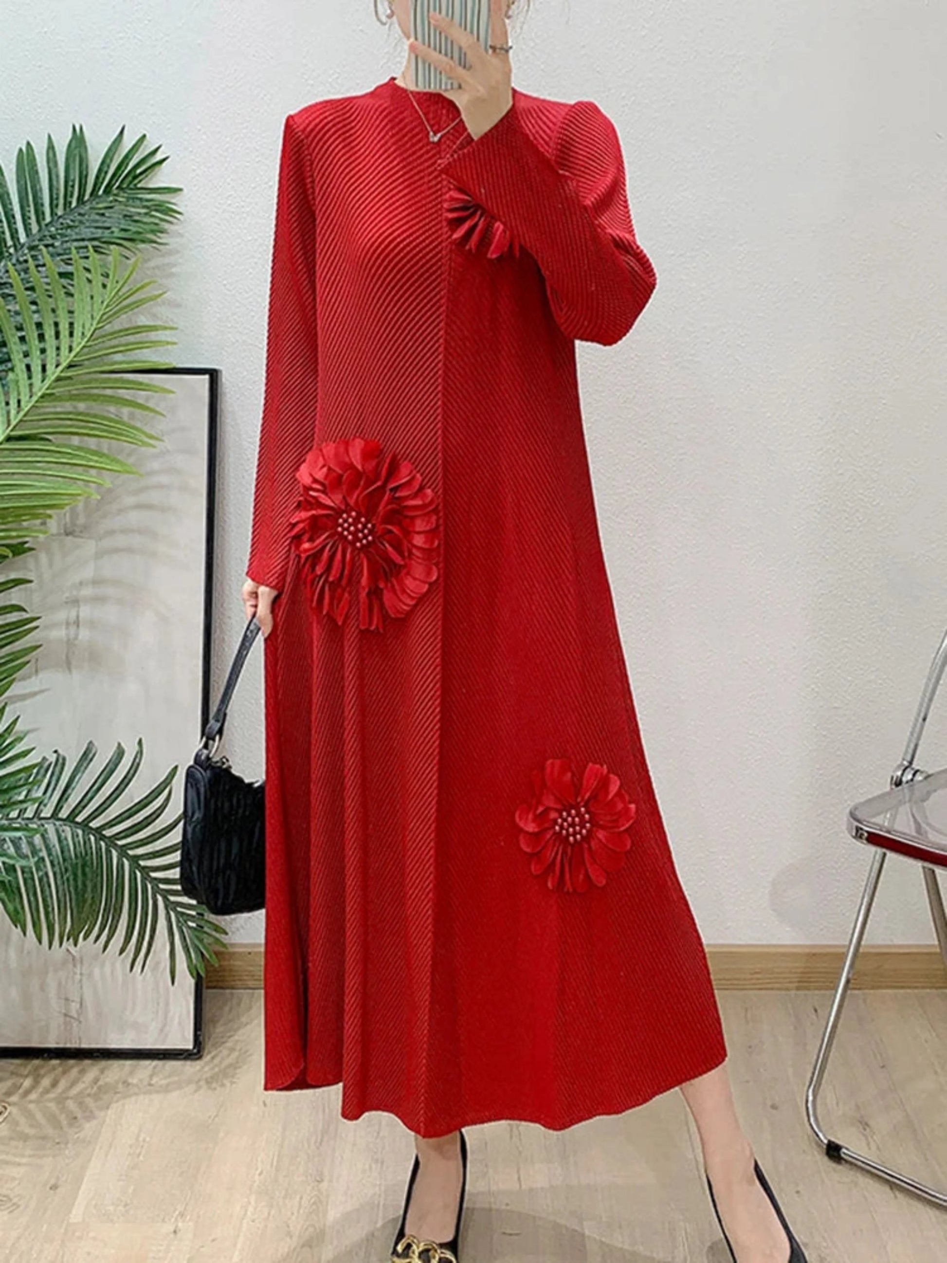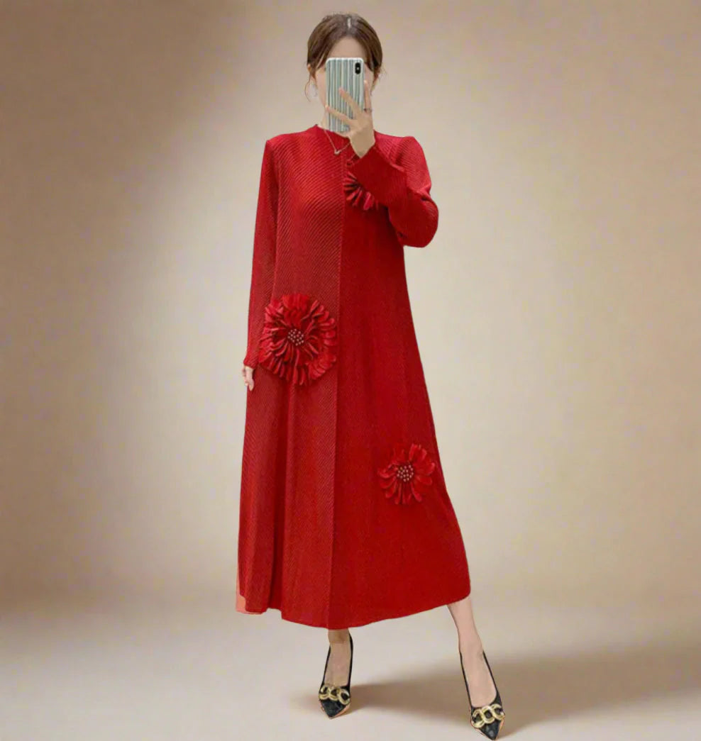 A luxurious long-sleeve tunic dress featuring signature Japanese pleats and delicate floral embellishments for subtle texture and refined detail.