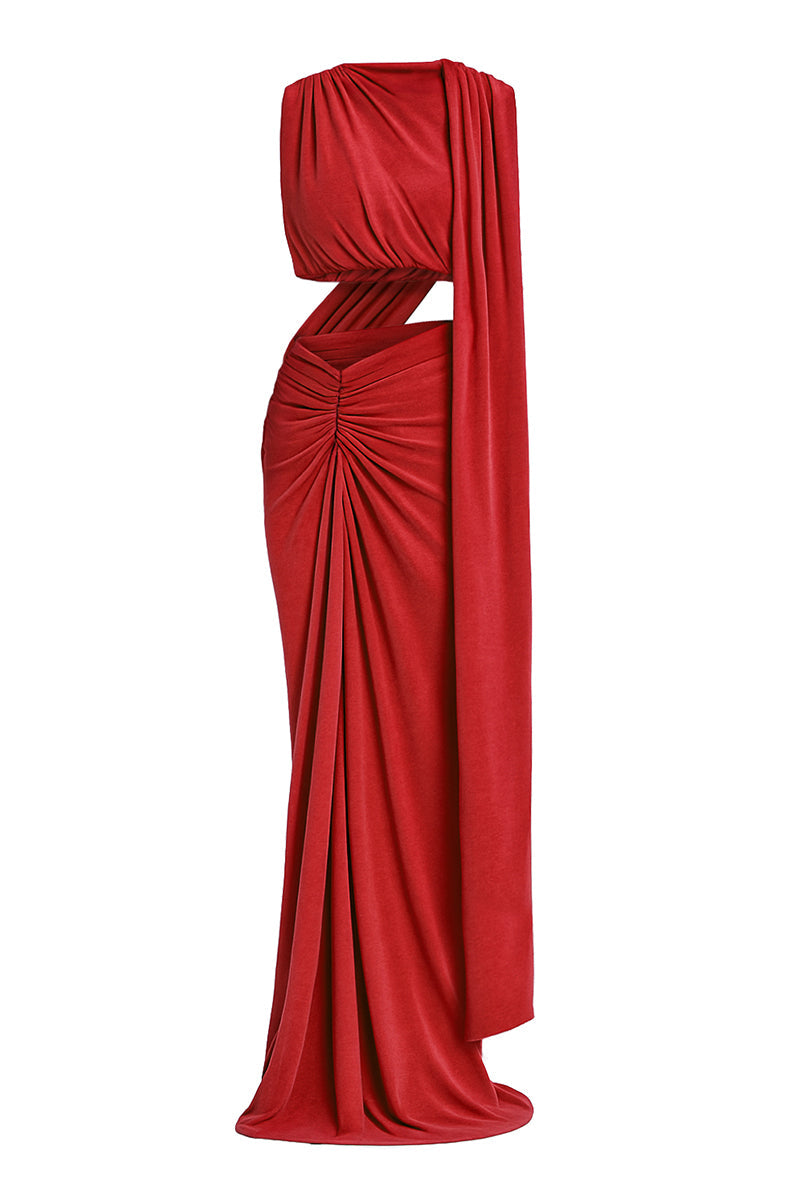 - Ruched top and skirt detail.