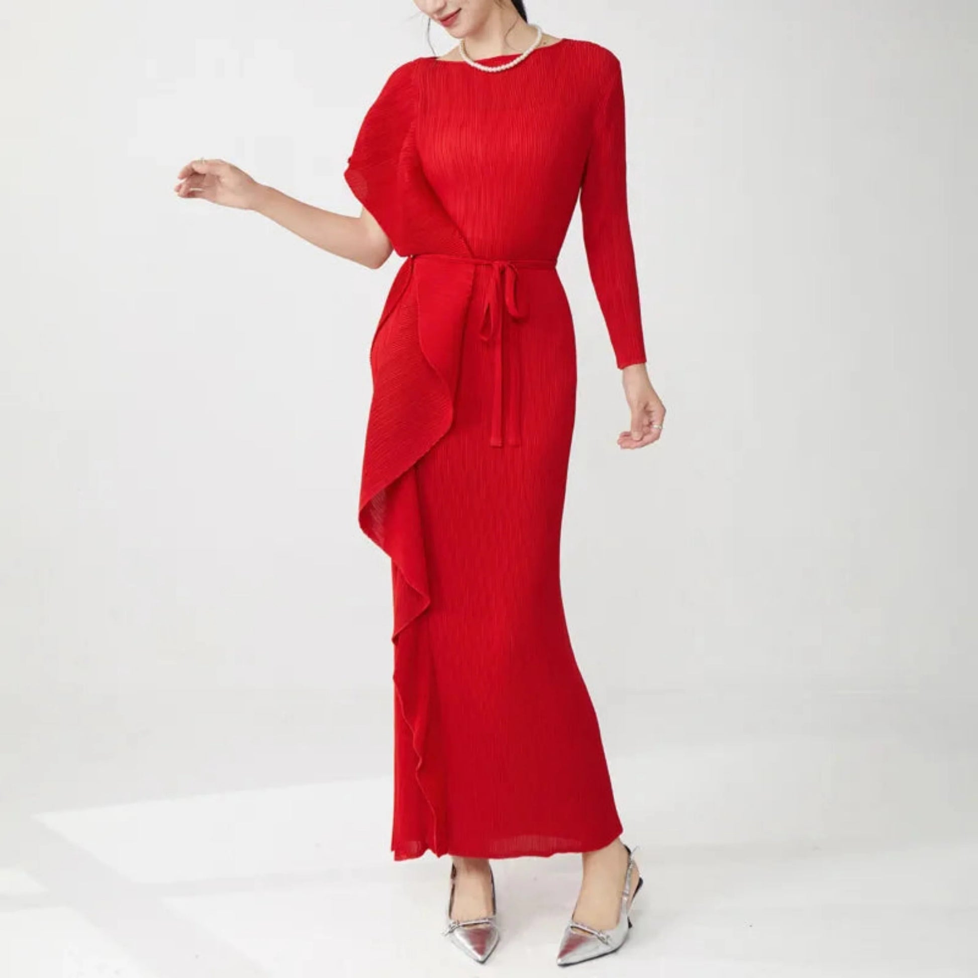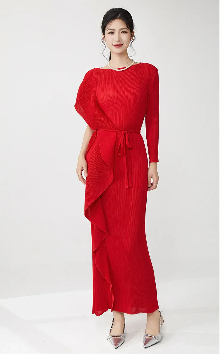 This luxury midi dress features signature Japanese pleats with a unique asymmetric design. One sleeve is long, while the other is a short ruffle sleeve, adding elegant contrast.