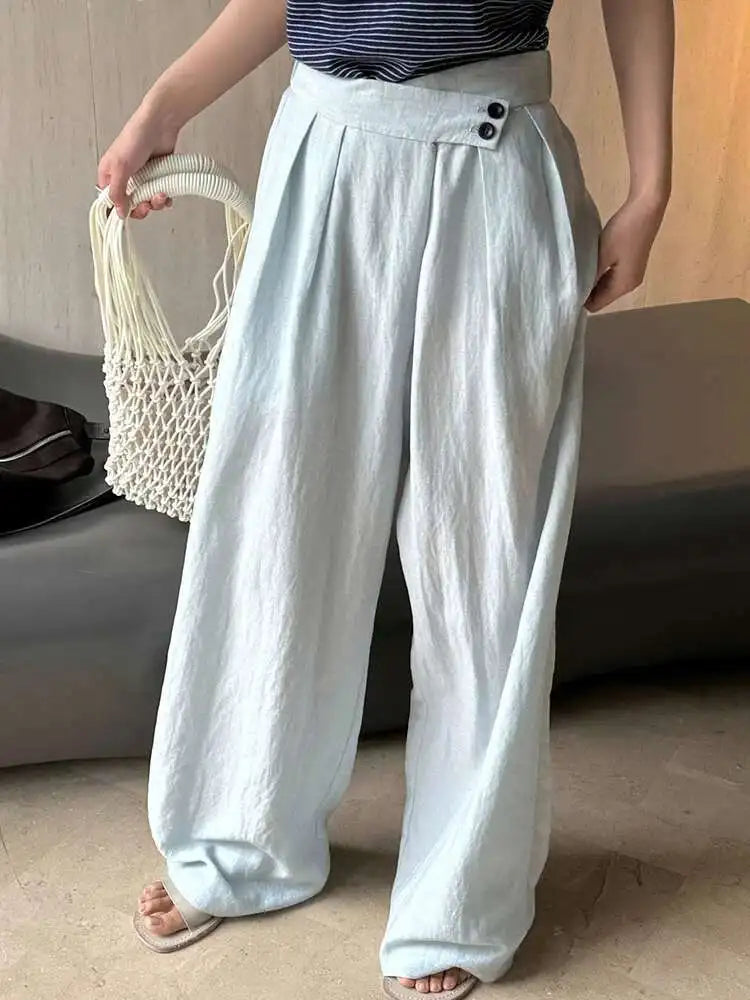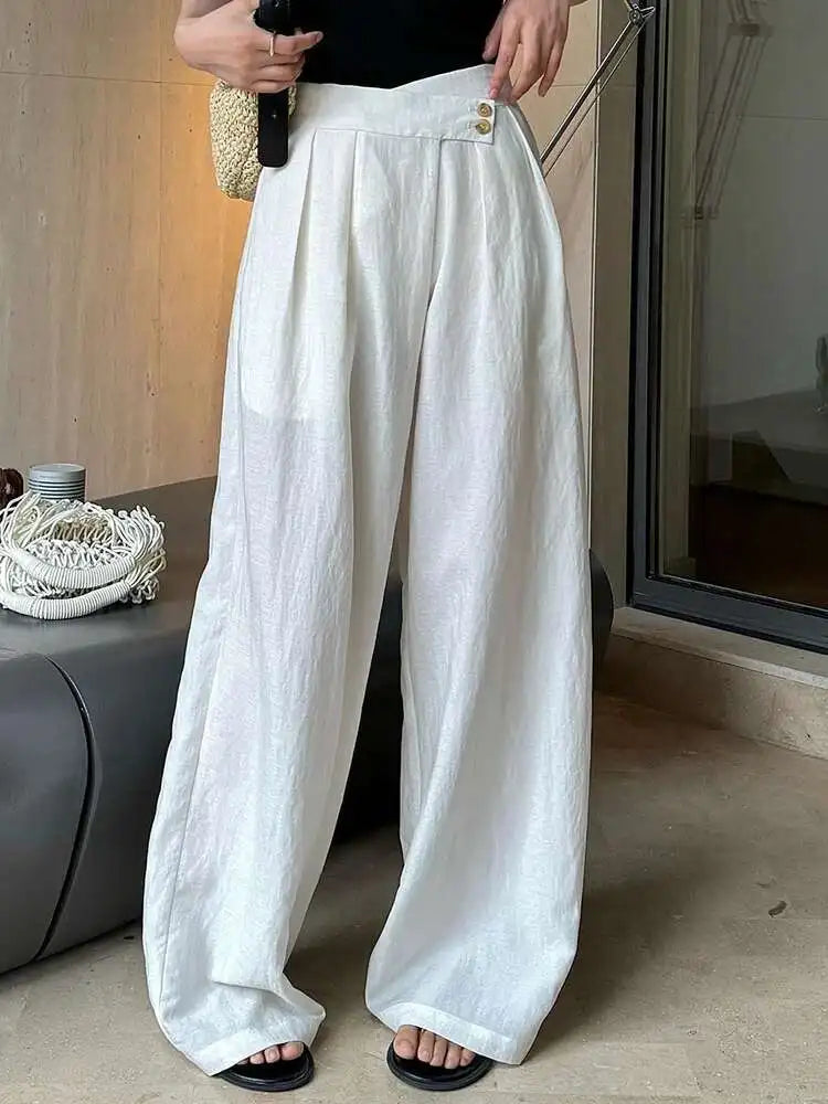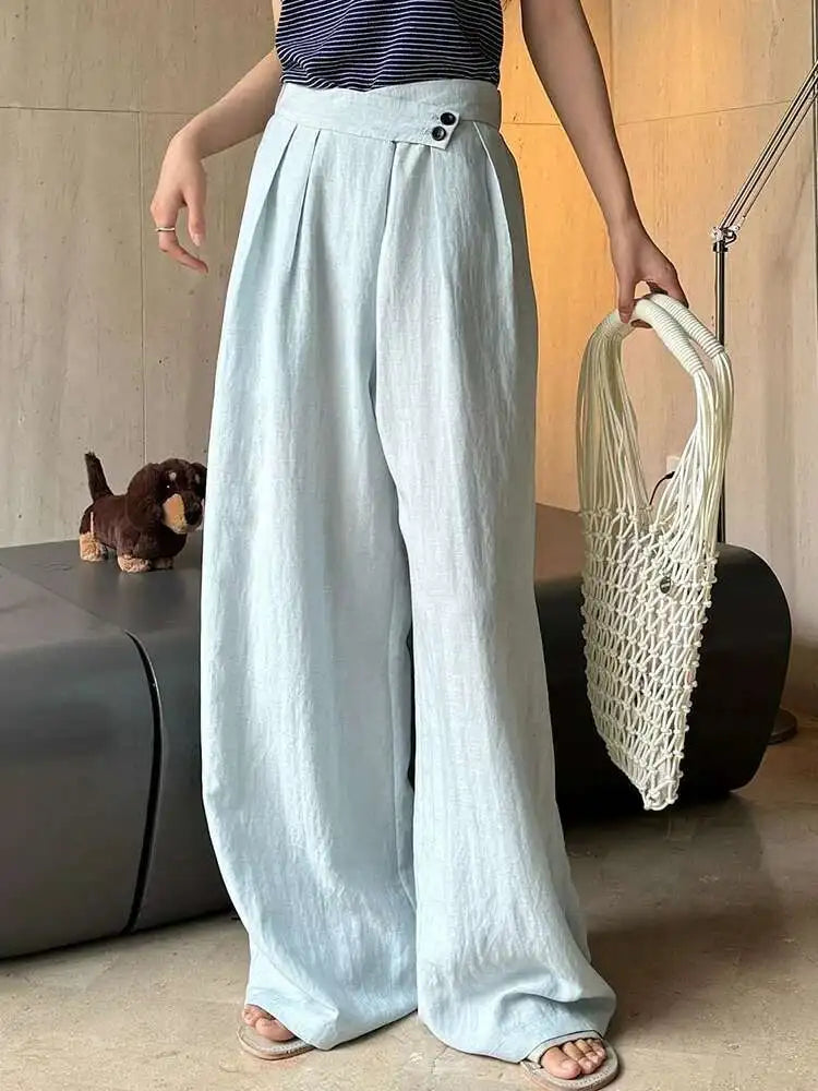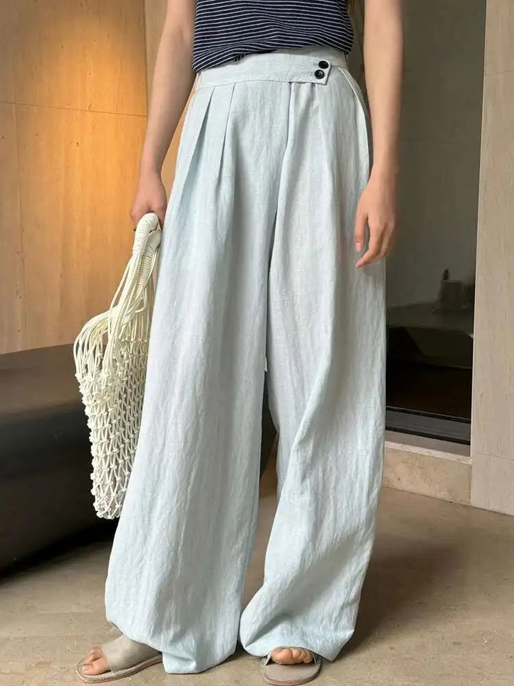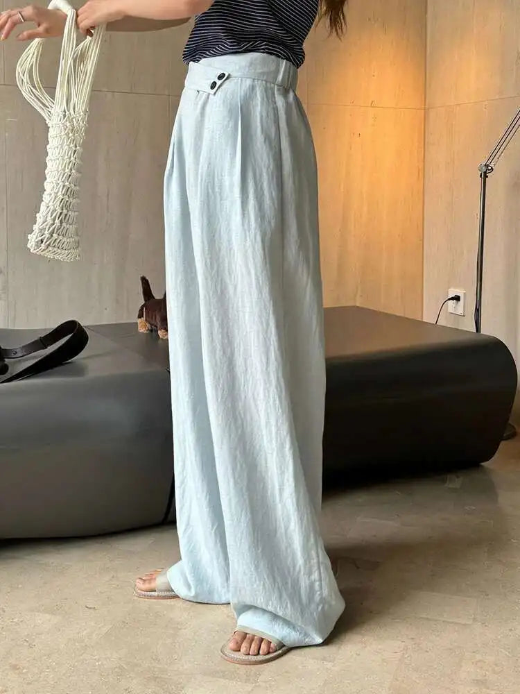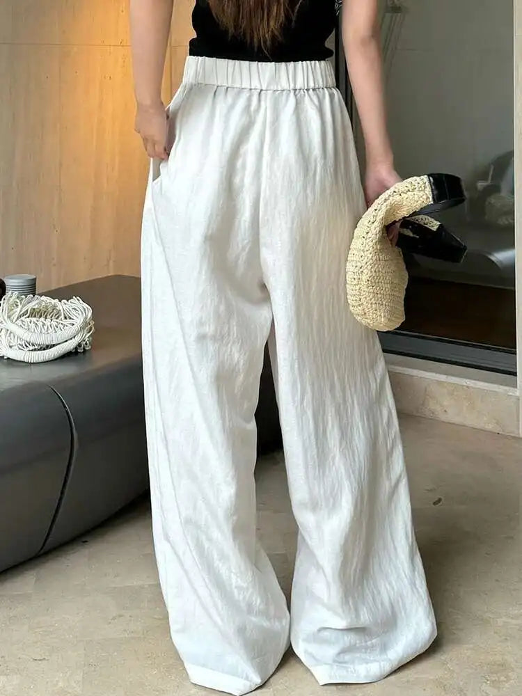These linen wide leg trousers offer a luxurious take on relaxed dressing. With a high waist, soft elastic waistband, and flowy silhouette, they bring breathable comfort and modern elegance to your everyday look.