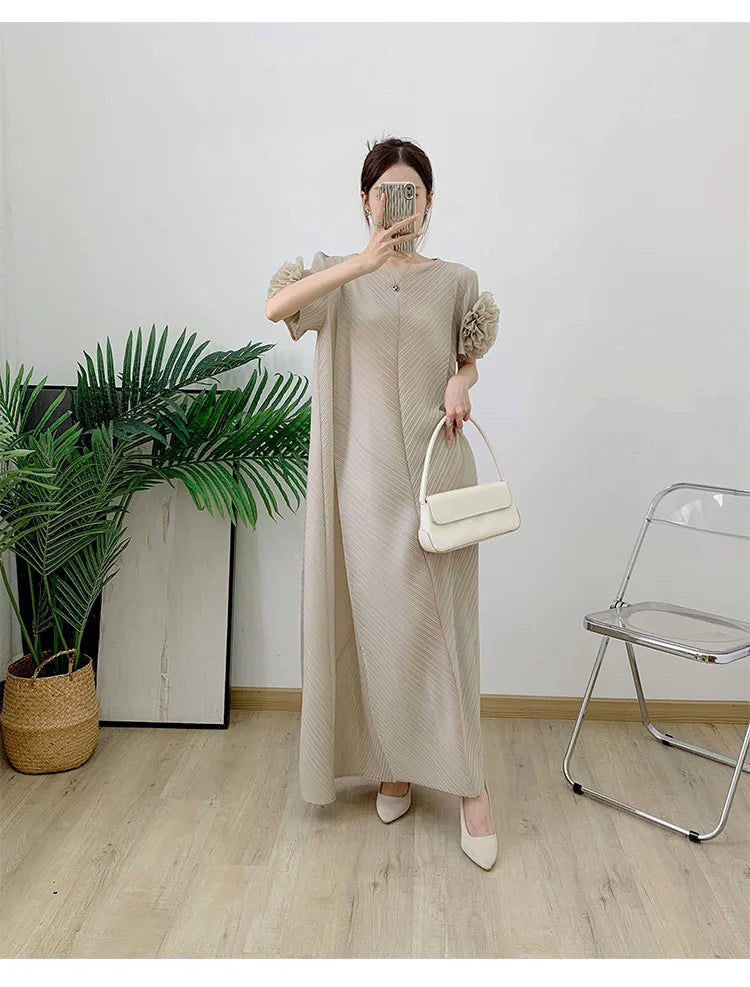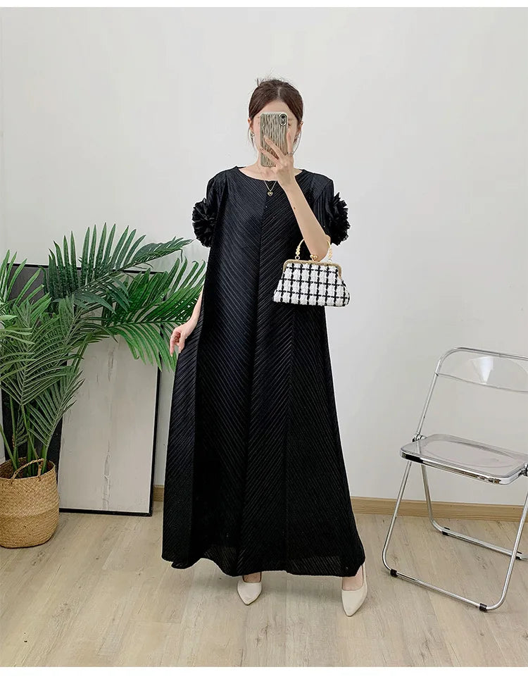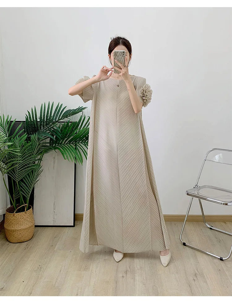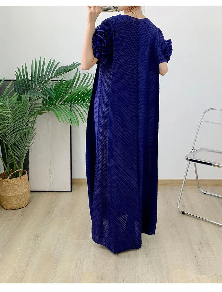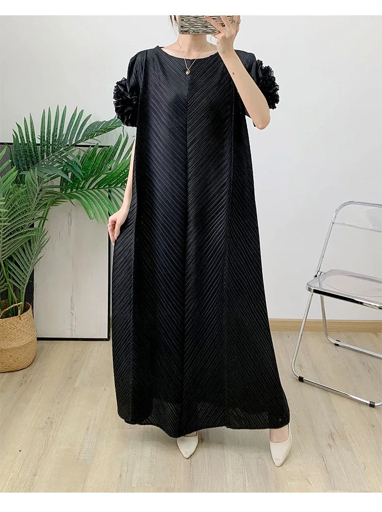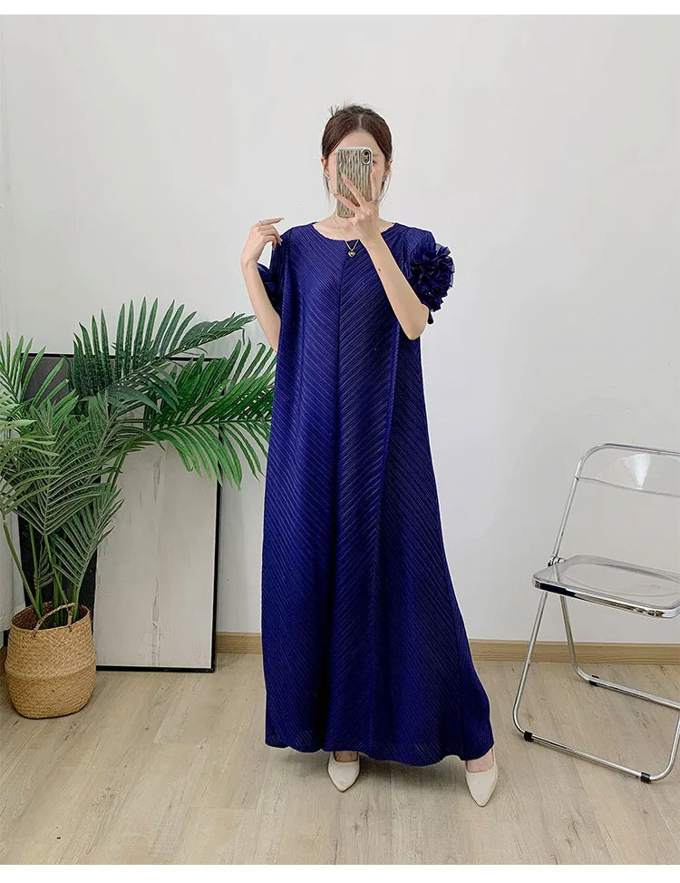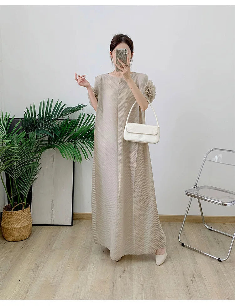 This luxurious maxi dress features an oversized fit, premium pleats, and intricate 3D floral sleeves for an effortlessly elegant look. Flowing and breathable, it’s the perfect blend of comfort and high-end sophistication.