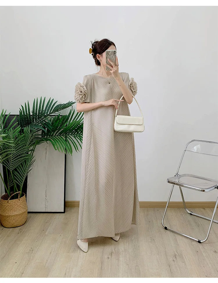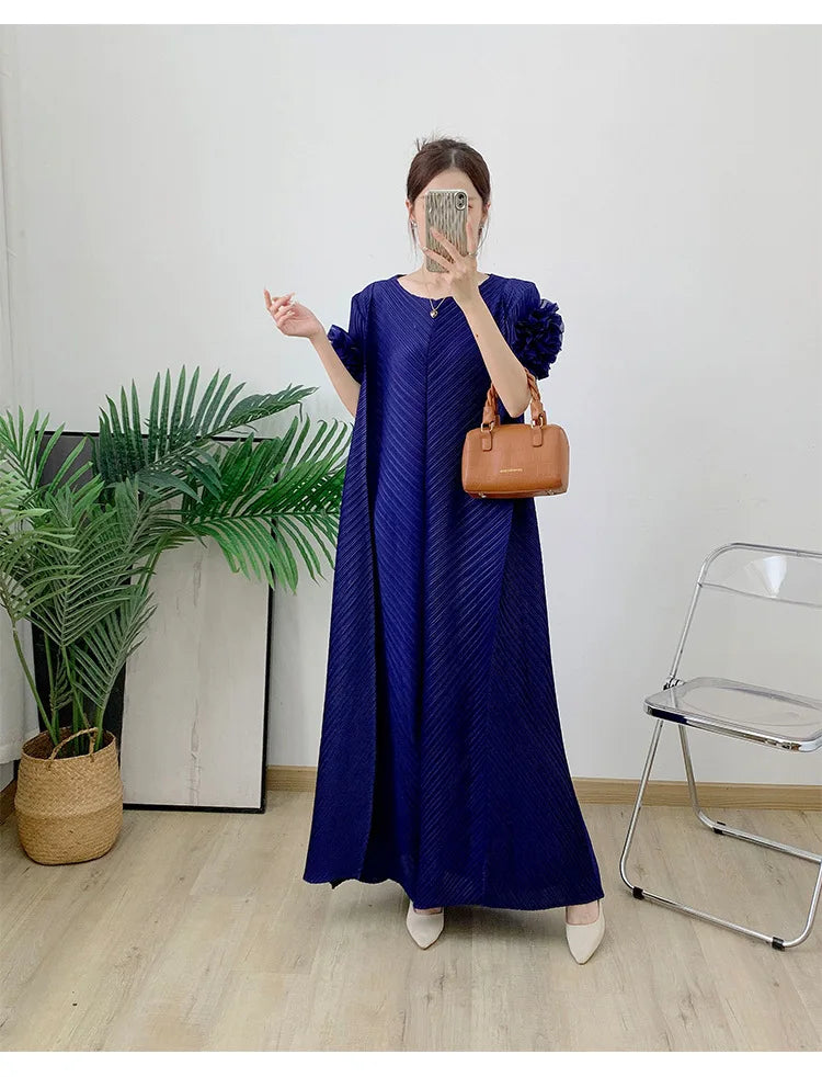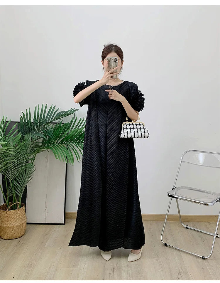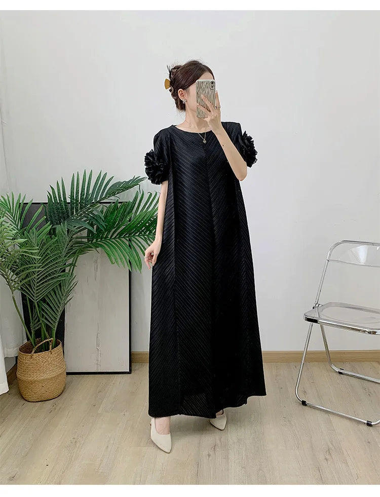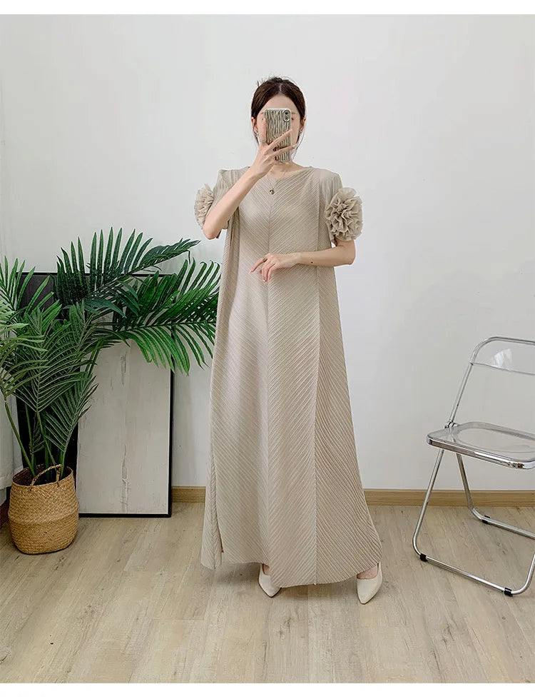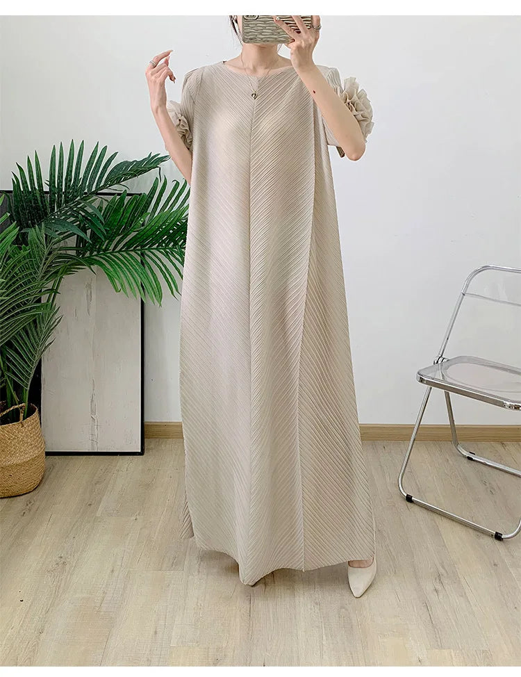 This luxurious maxi dress features an oversized fit, premium pleats, and intricate 3D floral sleeves for an effortlessly elegant look. Flowing and breathable, it’s the perfect blend of comfort and high-end sophistication.