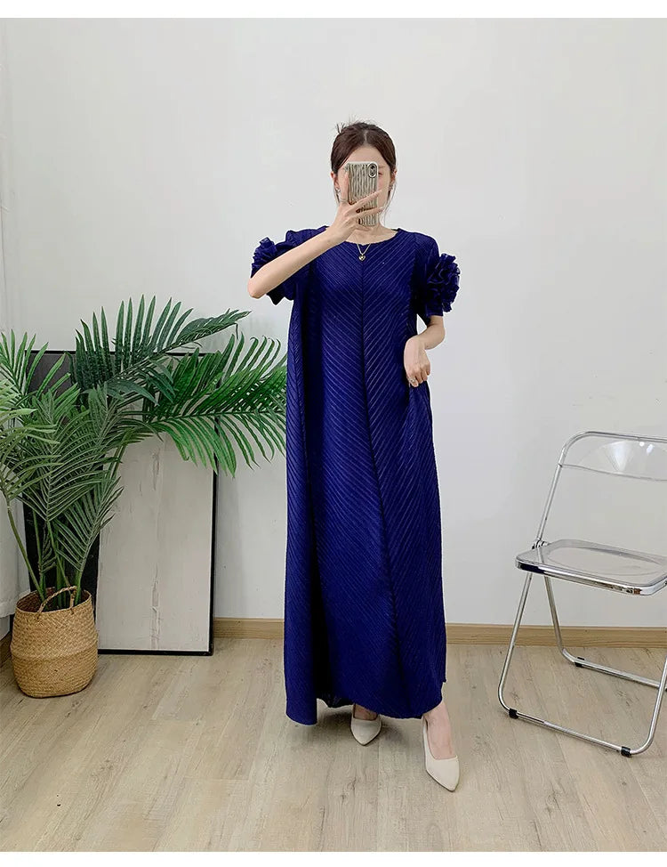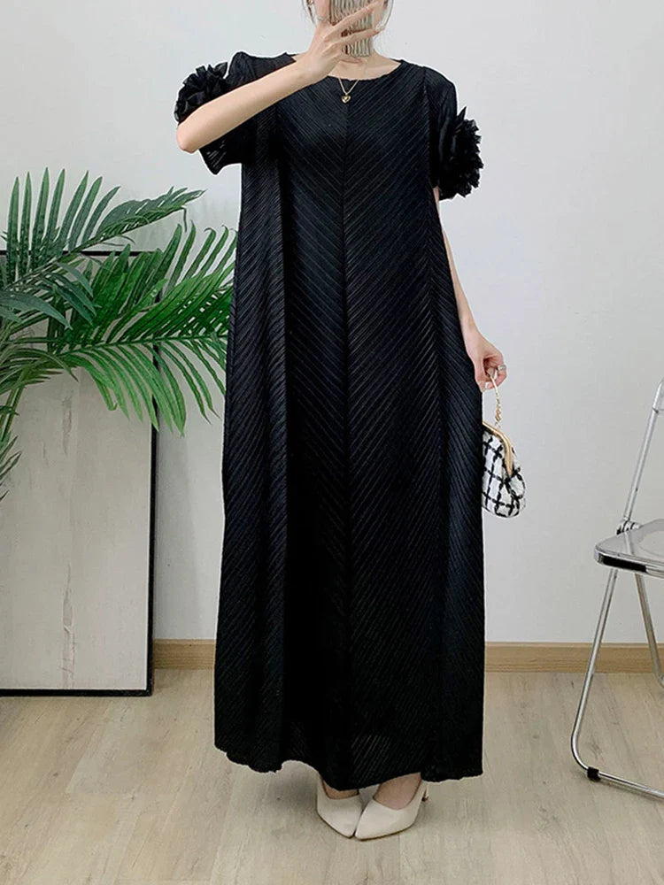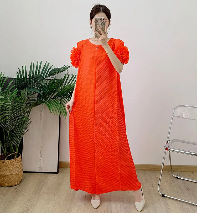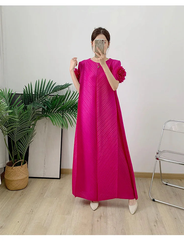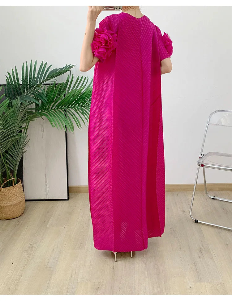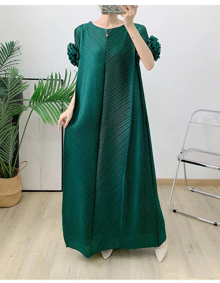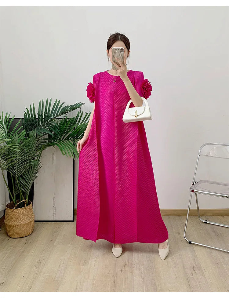This luxurious maxi dress features an oversized fit, premium pleats, and intricate 3D floral sleeves for an effortlessly elegant look. Flowing and breathable, it’s the perfect blend of comfort and high-end sophistication.