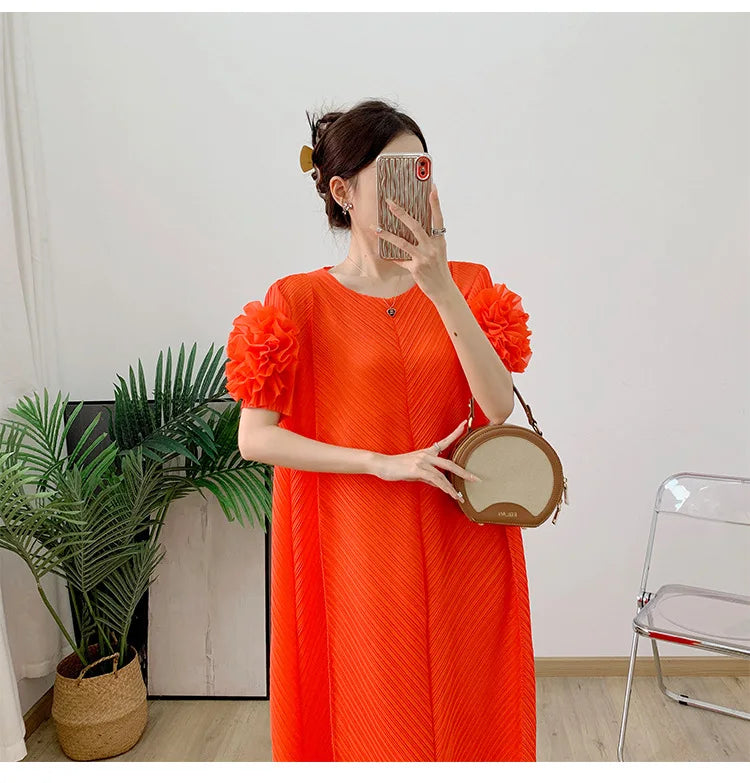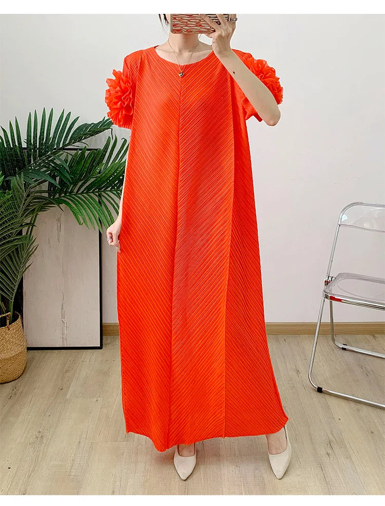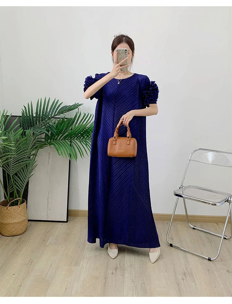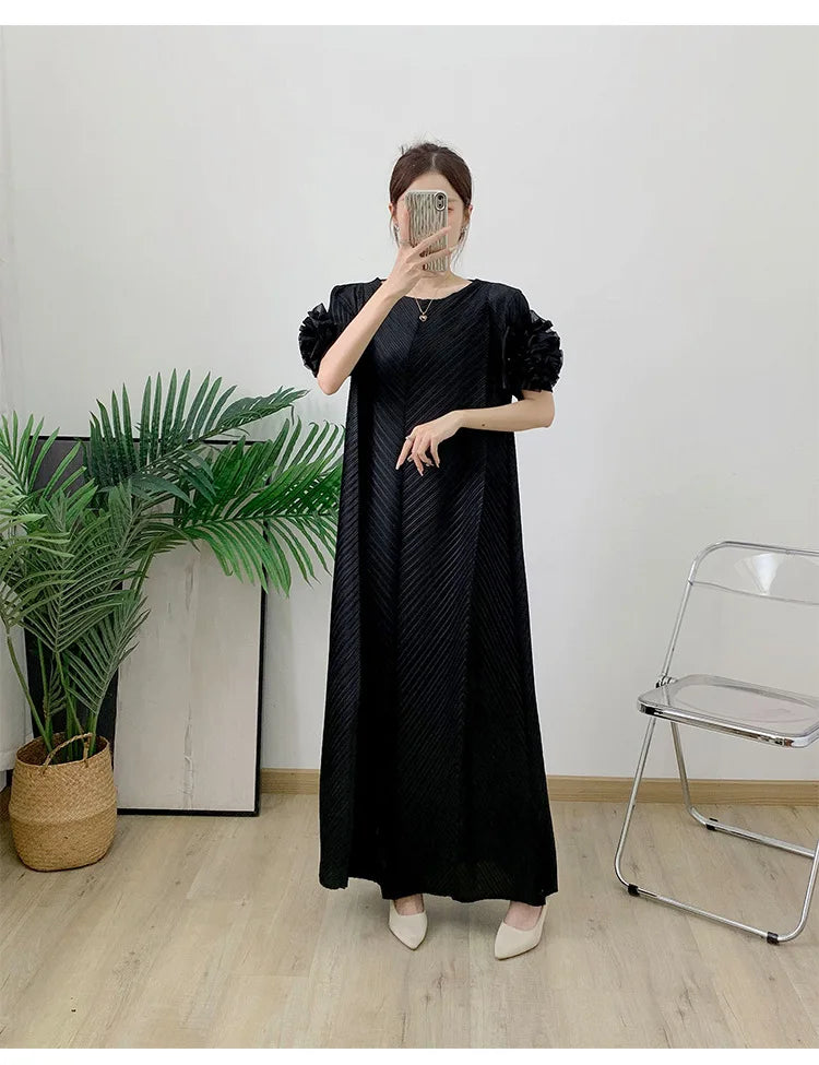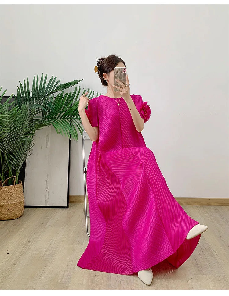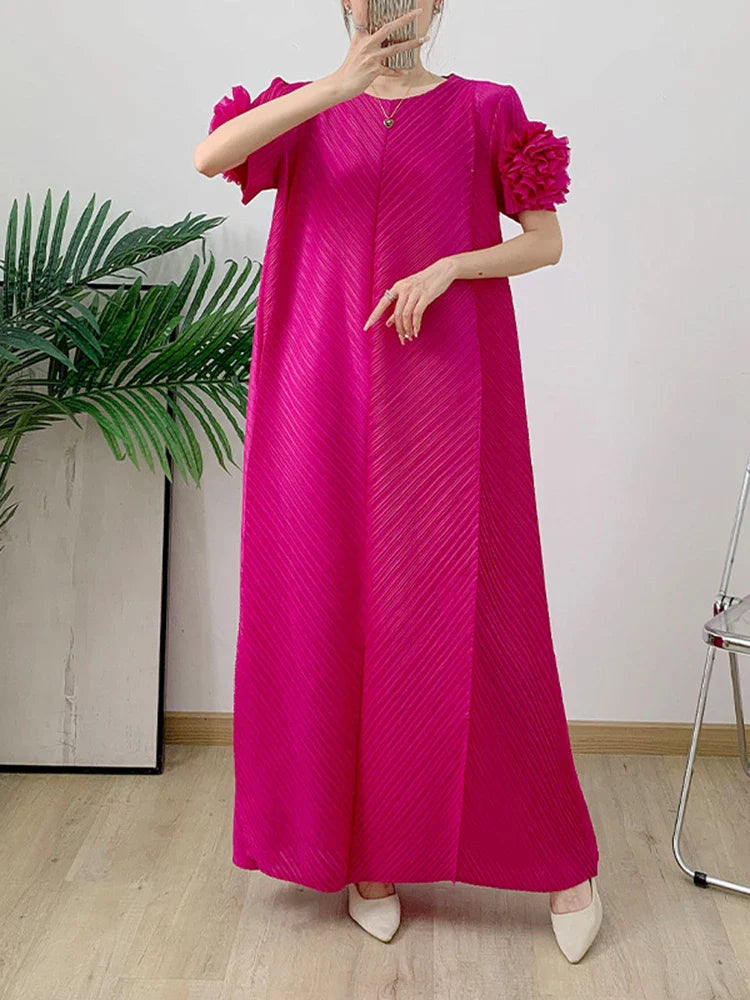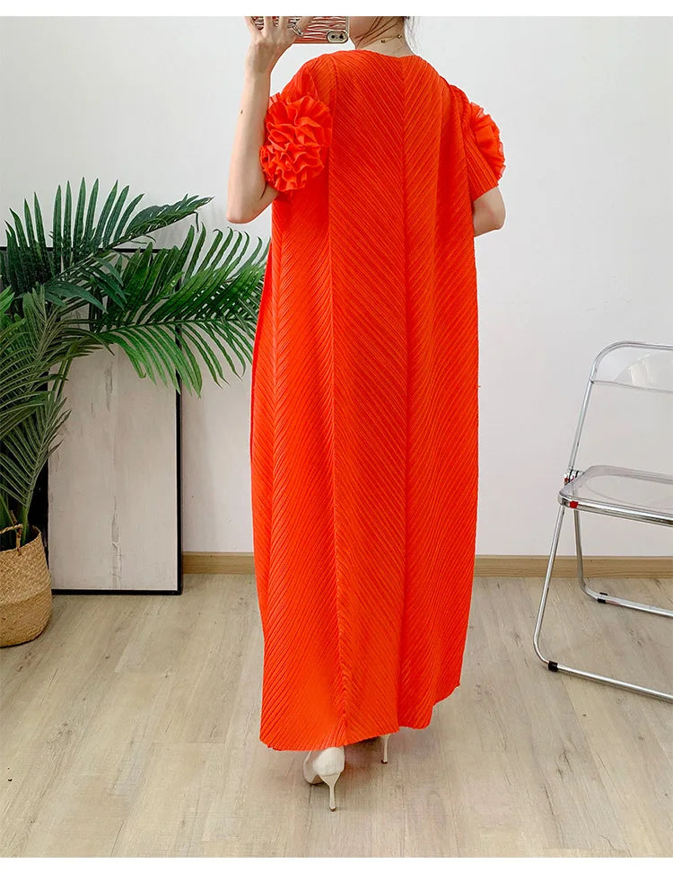 This luxurious maxi dress features an oversized fit, premium pleats, and intricate 3D floral sleeves for an effortlessly elegant look. Flowing and breathable, it’s the perfect blend of comfort and high-end sophistication.