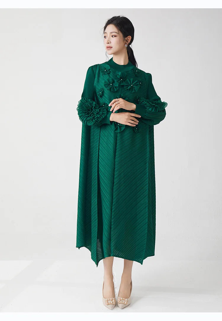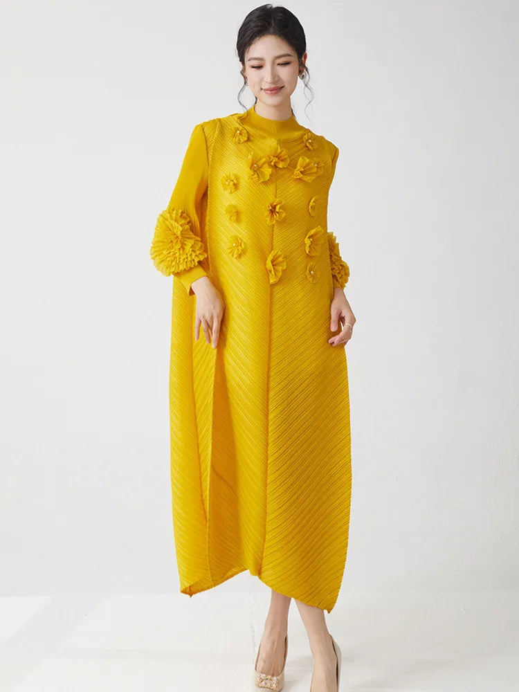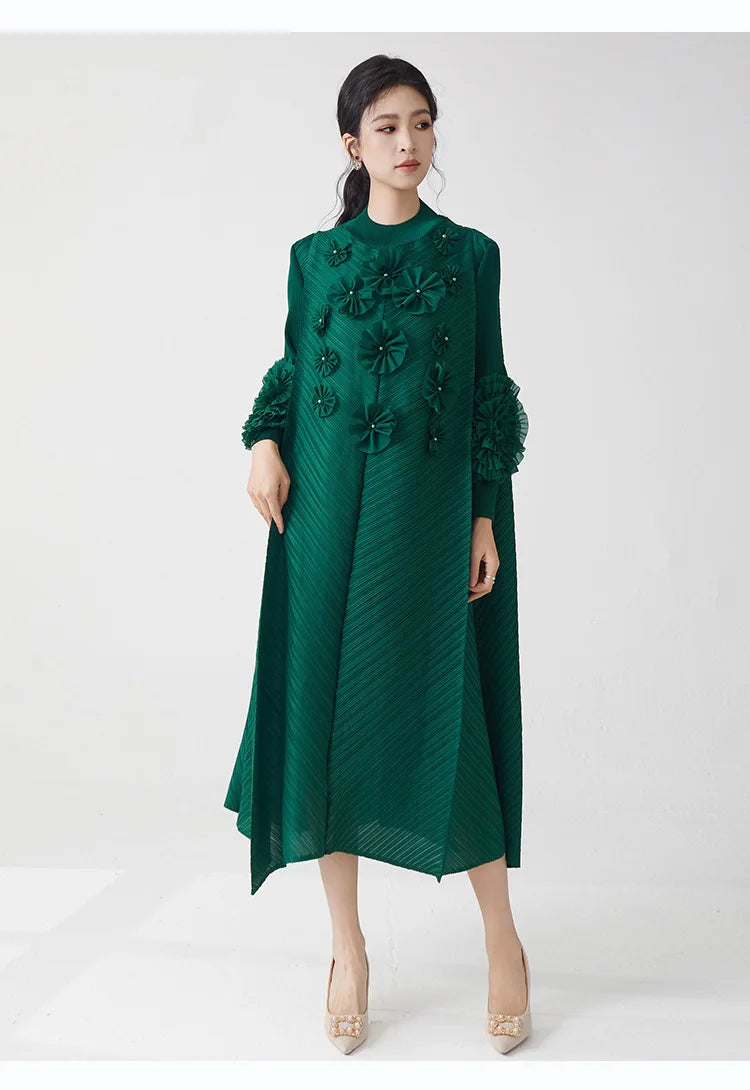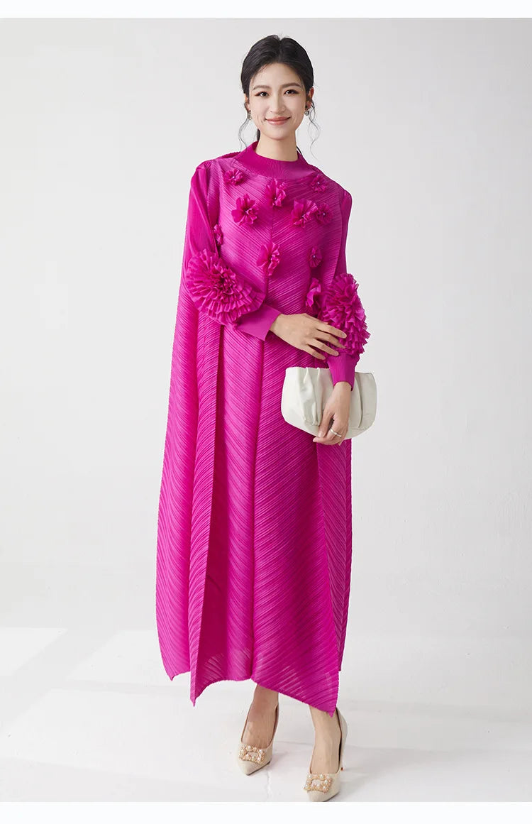 Elegance meets texture in this stunning midi dress, featuring fluid plissé pleats and lifelike 3D floral embellishments. The long sleeves and structured fit create a refined yet modern silhouette, perfect for any occasion.