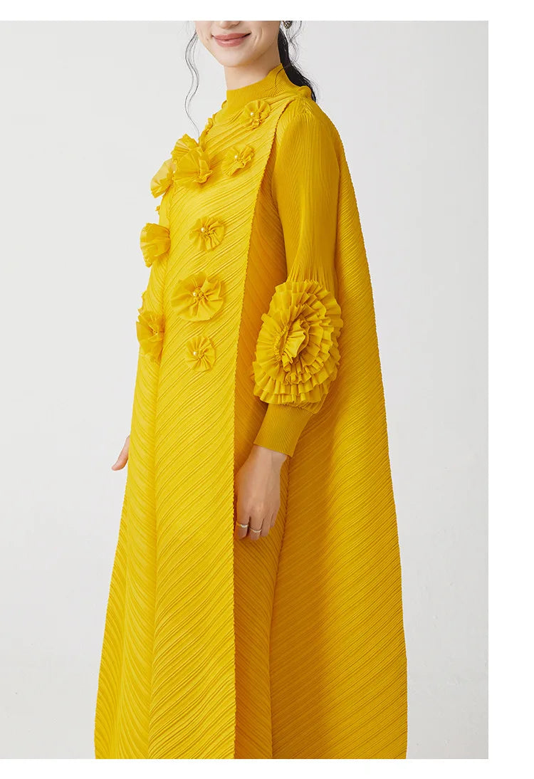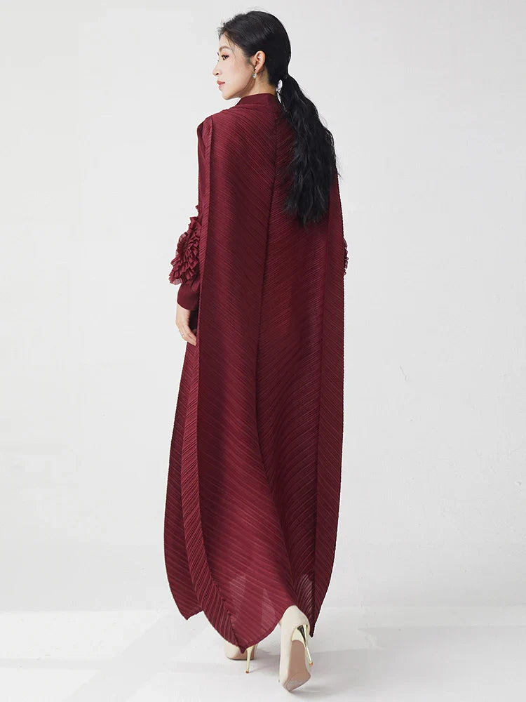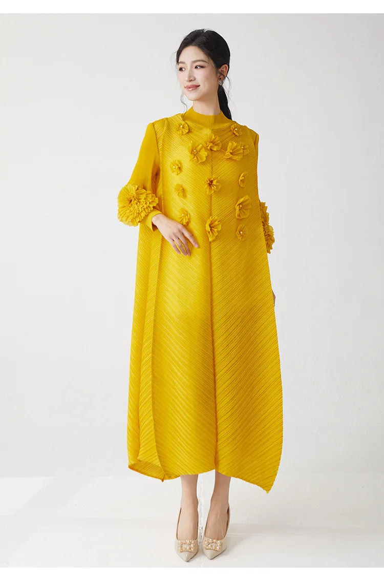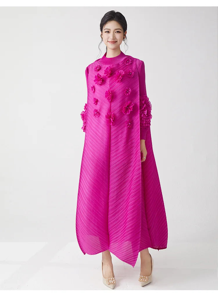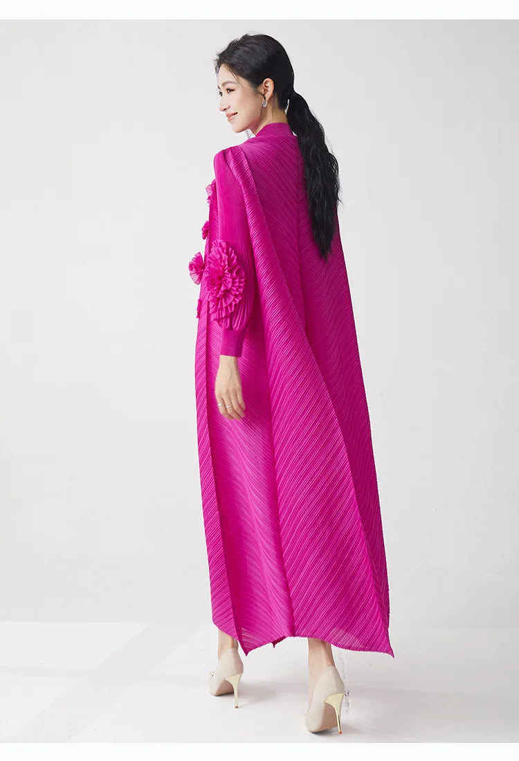 Elegance meets texture in this stunning midi dress, featuring fluid plissé pleats and lifelike 3D floral embellishments. The long sleeves and structured fit create a refined yet modern silhouette, perfect for any occasion.