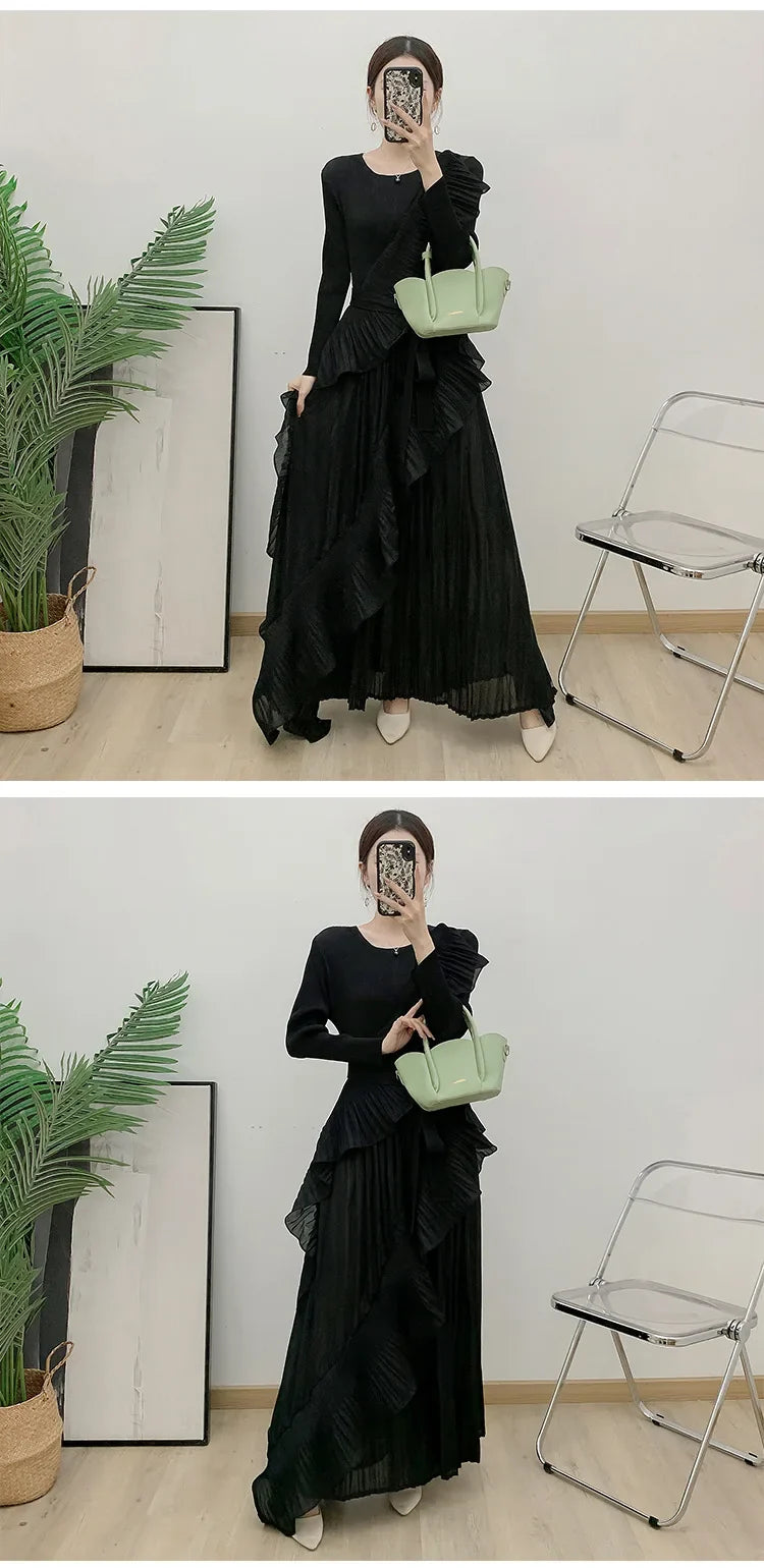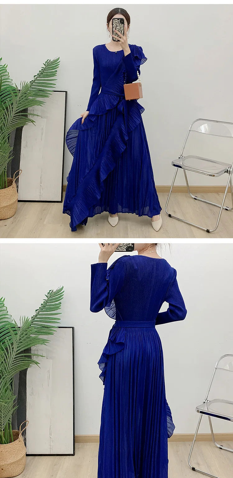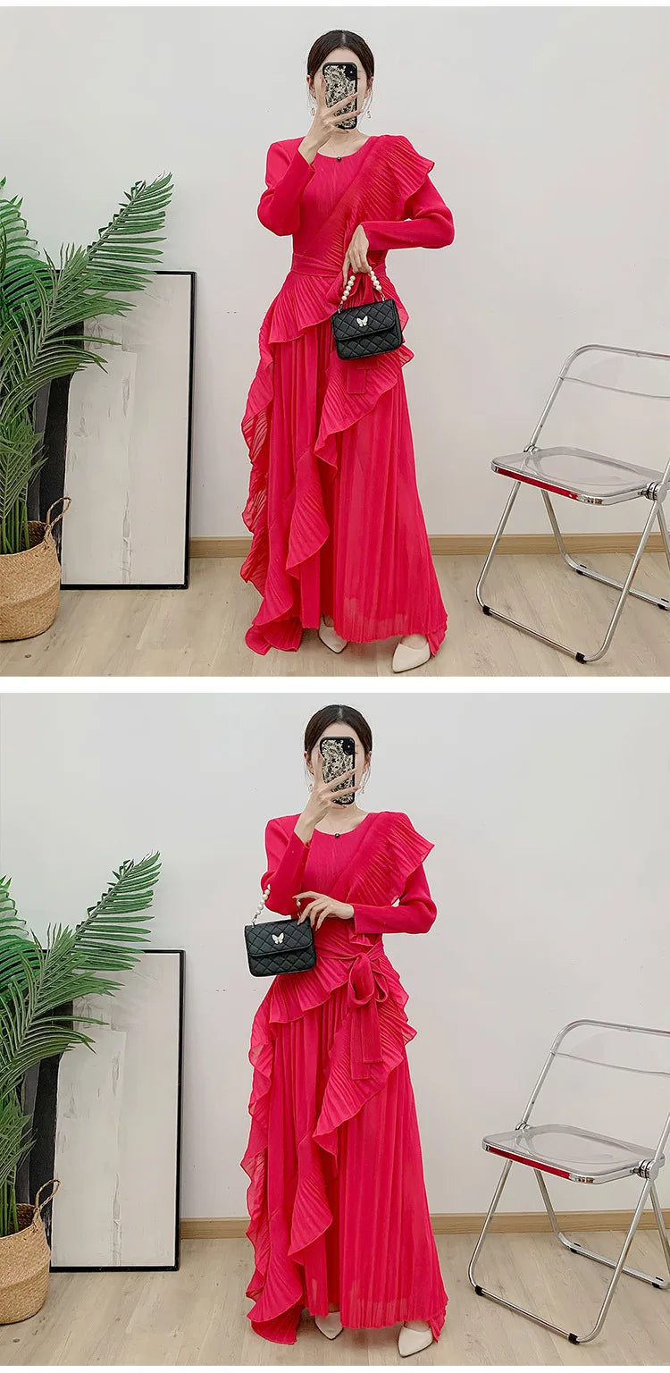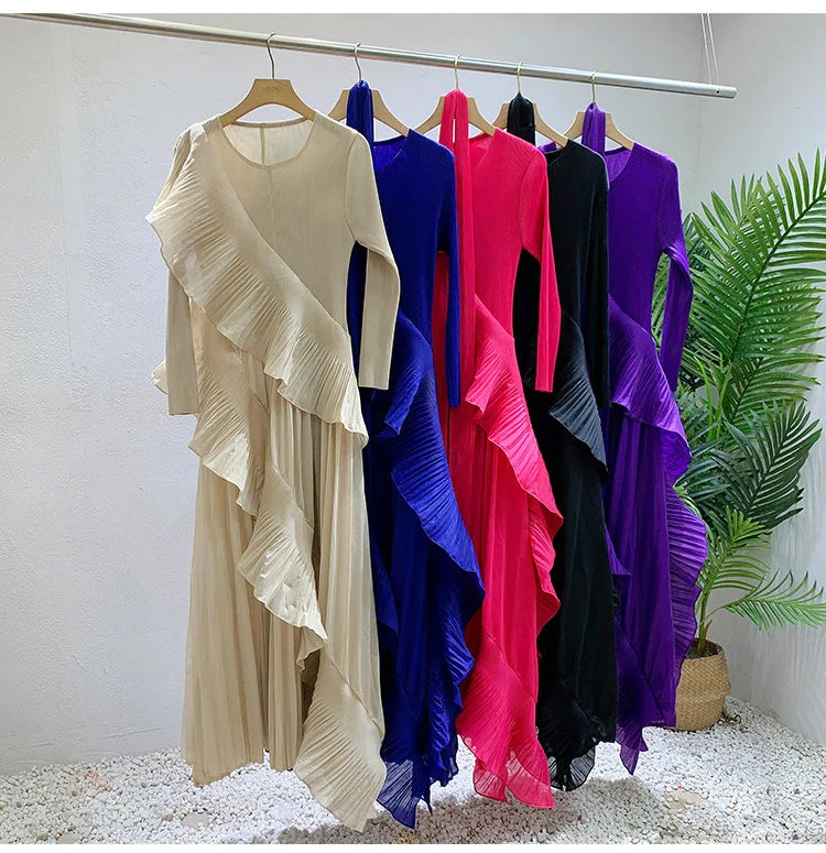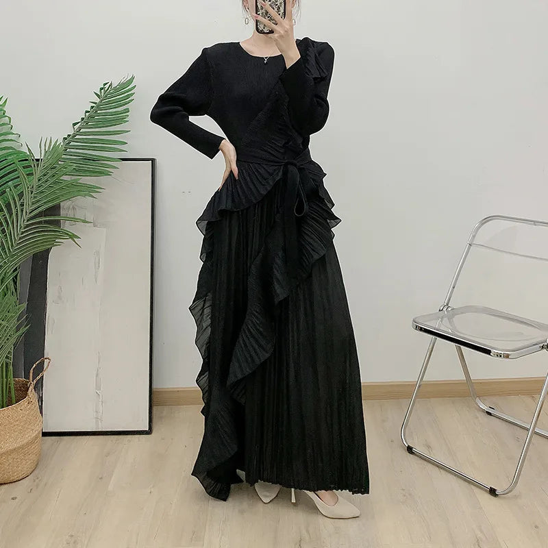 This luxurious maxi dress embodies true Japanese artistry with delicate pleats and romantic ruffled details. Designed with long sleeves and a flowing silhouette, it offers an effortlessly elegant and timeless appeal for any sophisticated wardrobe.