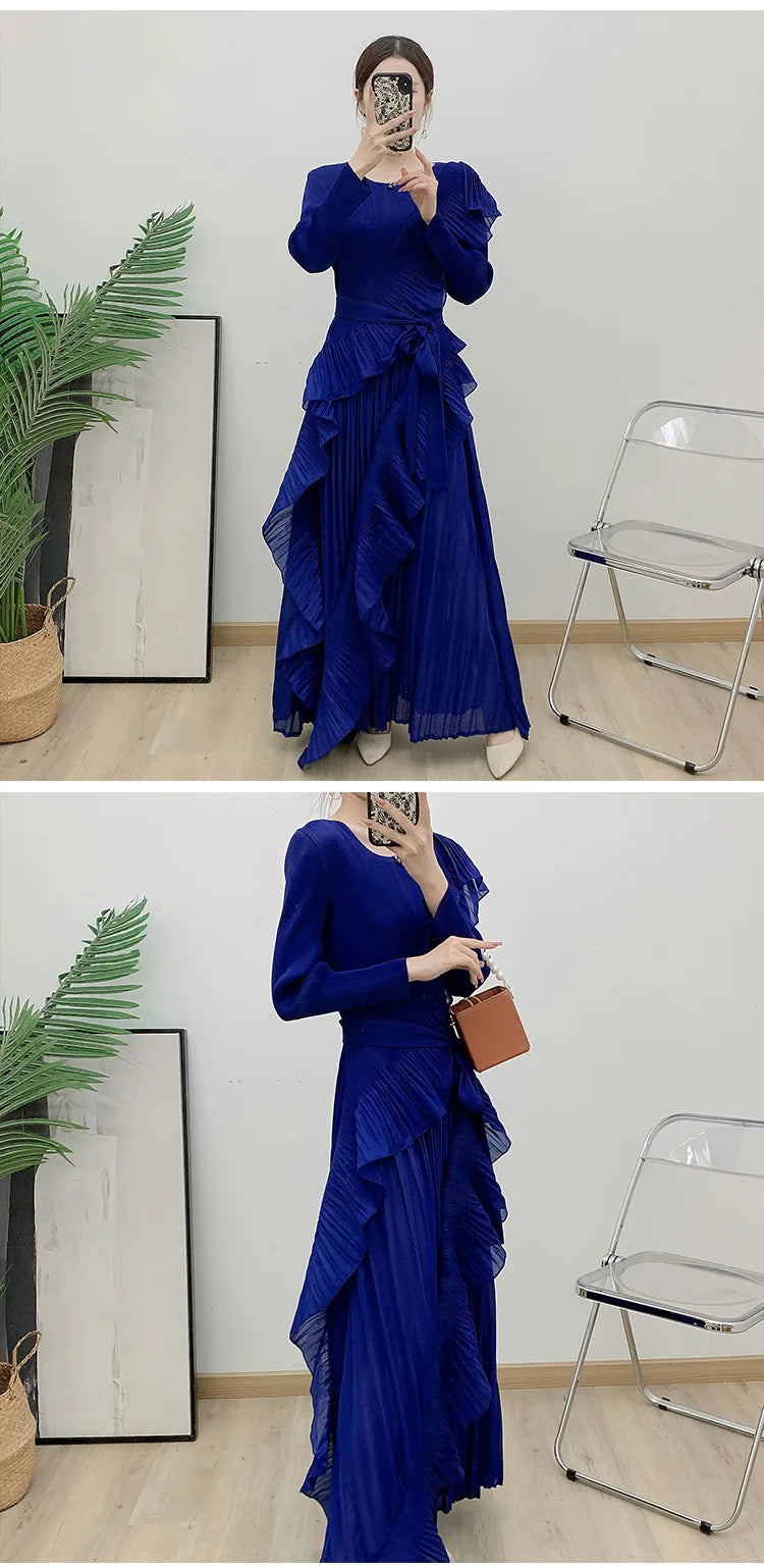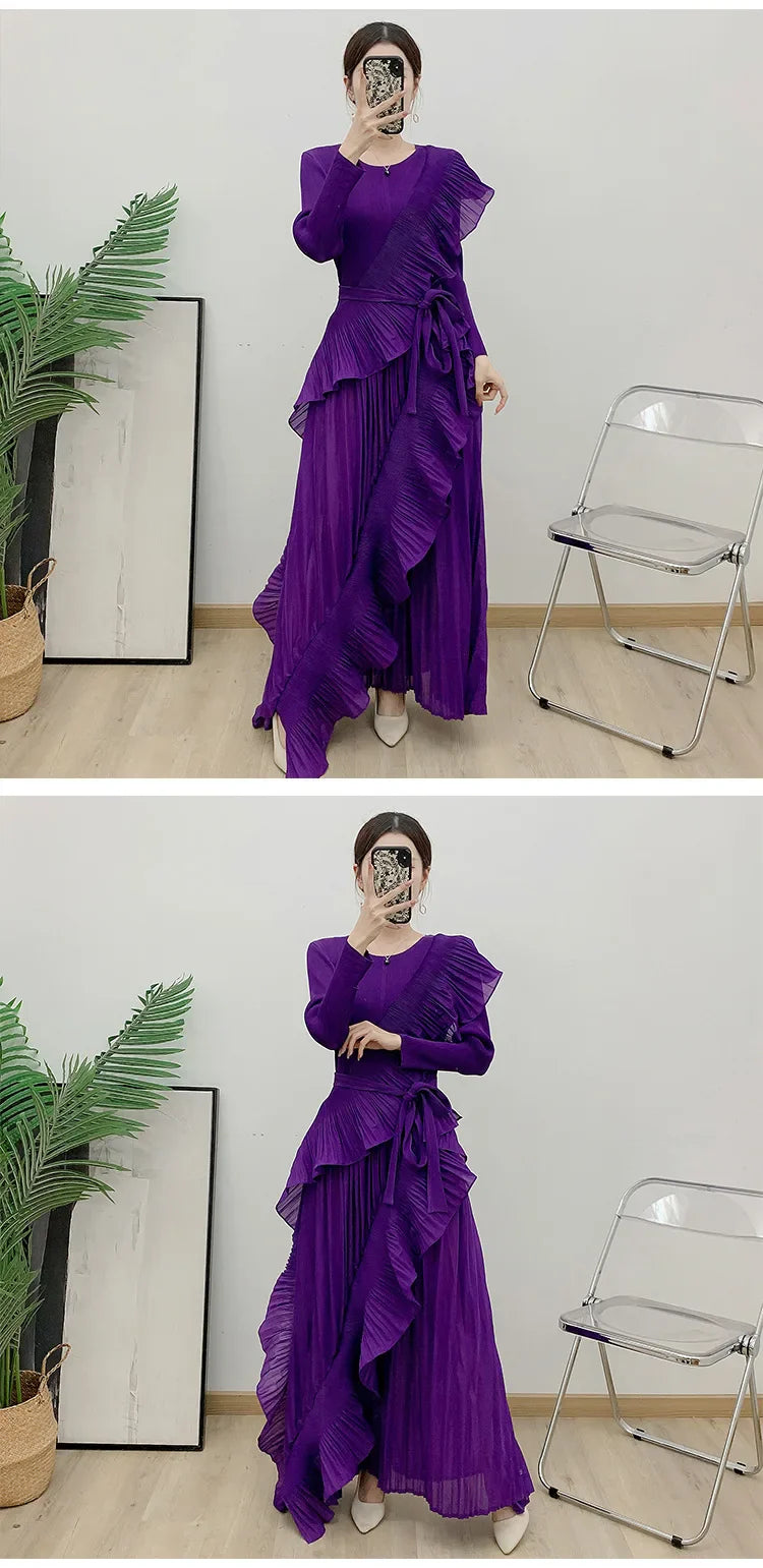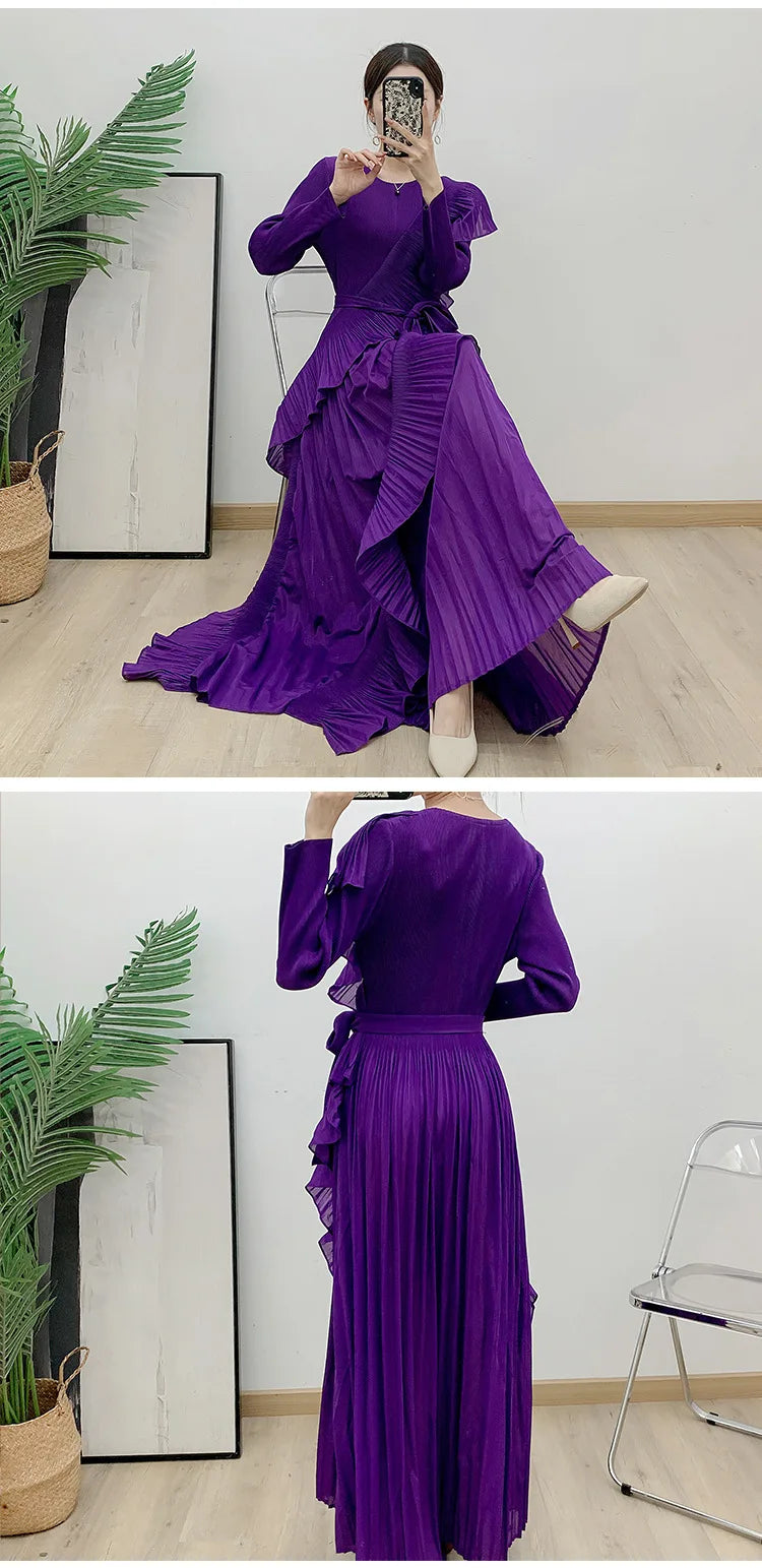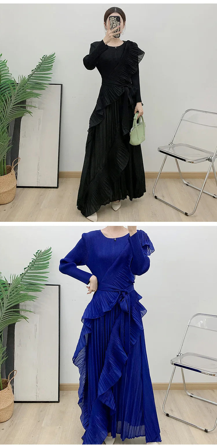 This luxurious maxi dress embodies true Japanese artistry with delicate pleats and romantic ruffled details. Designed with long sleeves and a flowing silhouette, it offers an effortlessly elegant and timeless appeal for any sophisticated wardrobe.