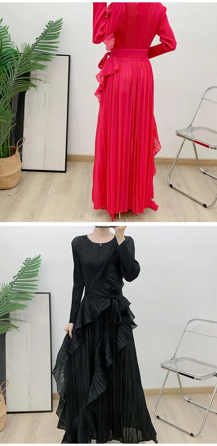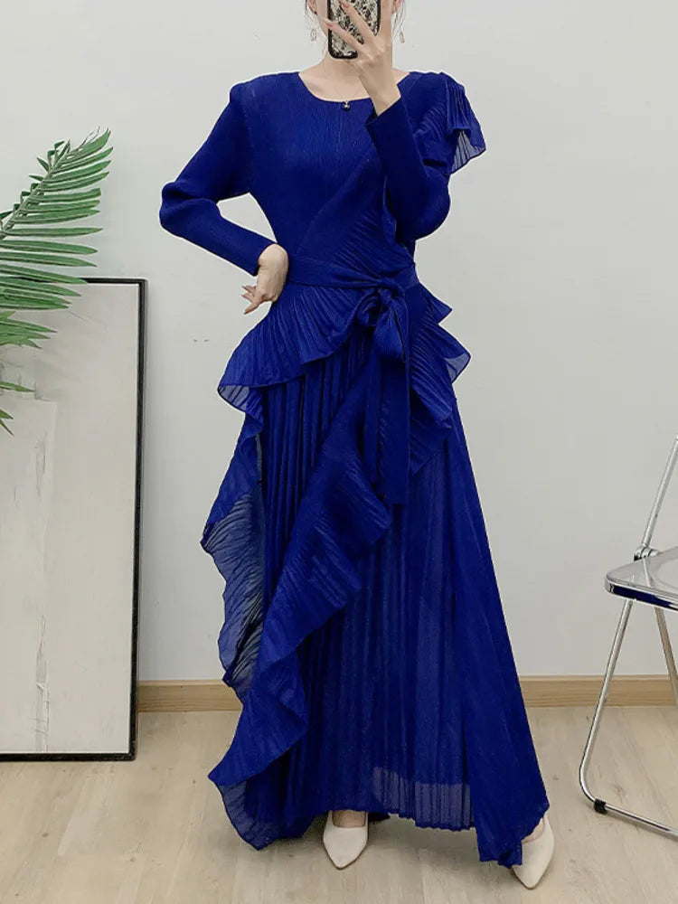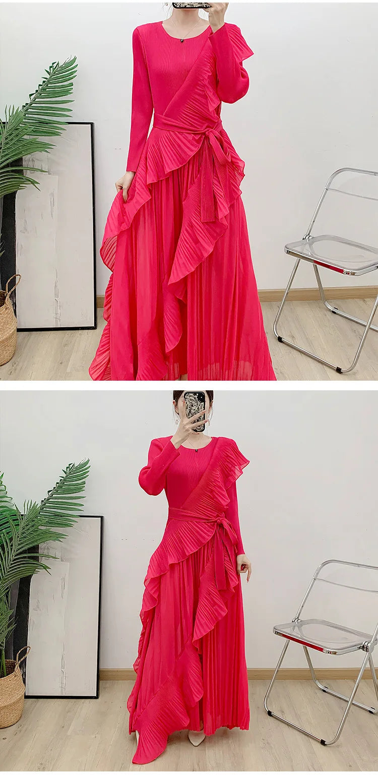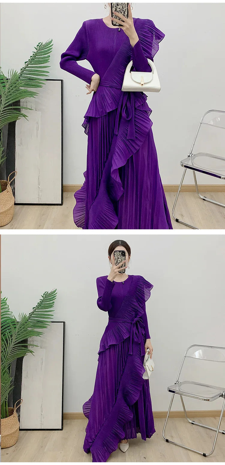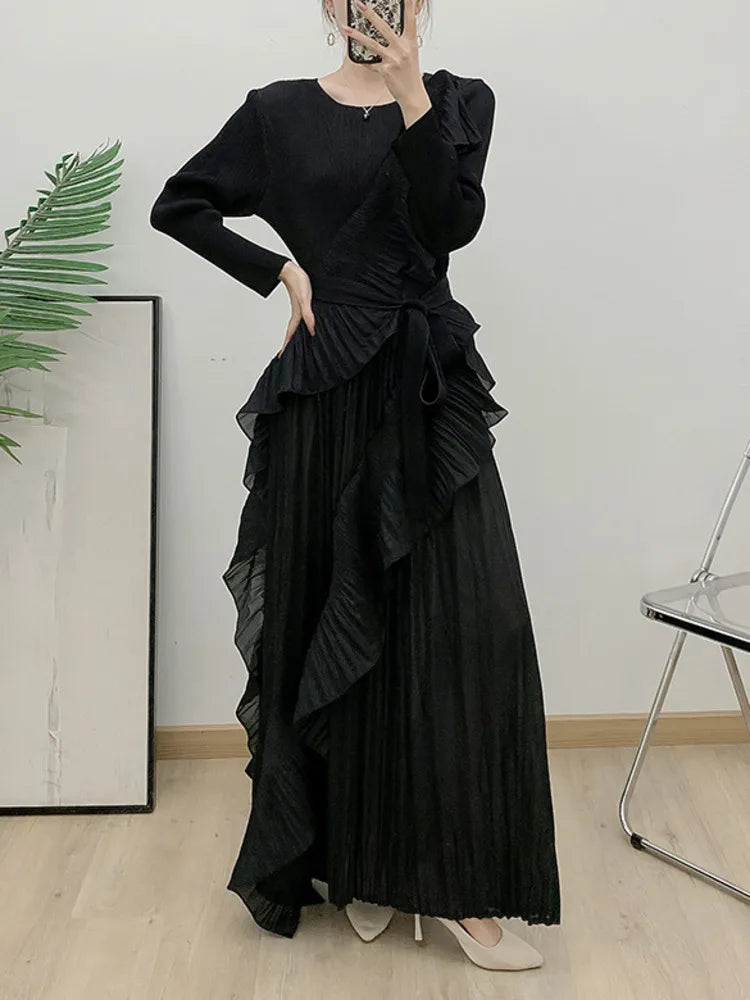 This luxurious maxi dress embodies true Japanese artistry with delicate pleats and romantic ruffled details. Designed with long sleeves and a flowing silhouette, it offers an effortlessly elegant and timeless appeal for any sophisticated wardrobe.