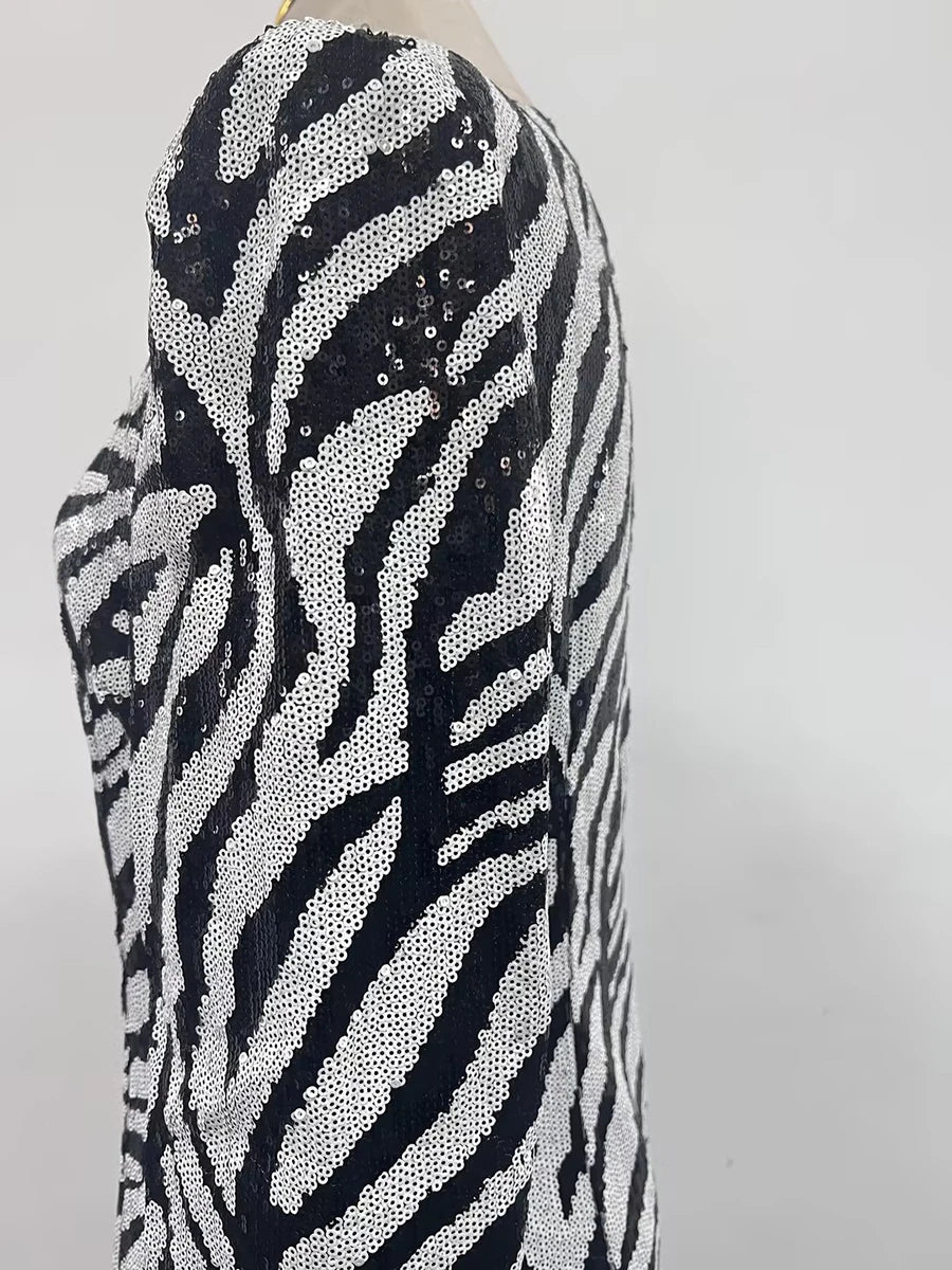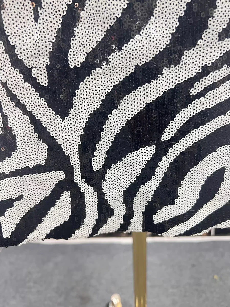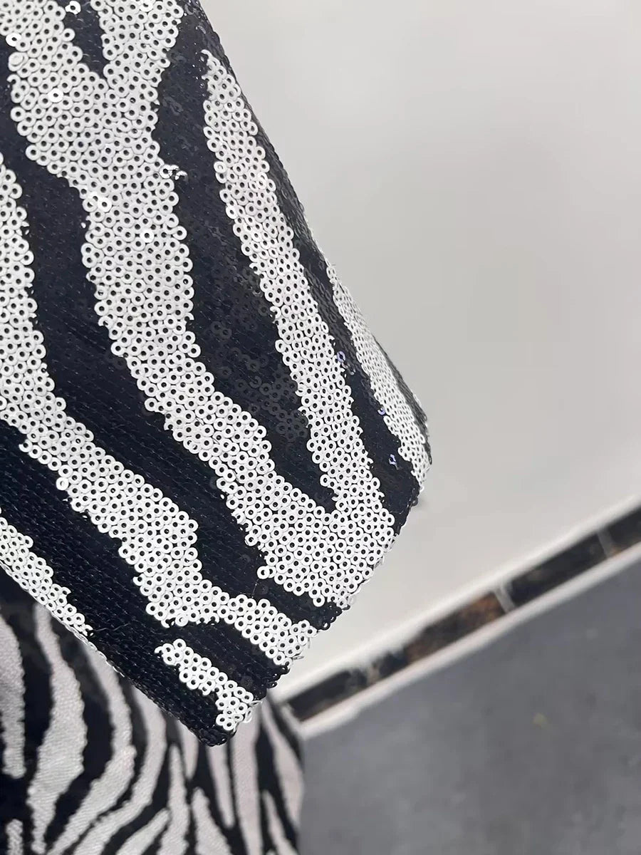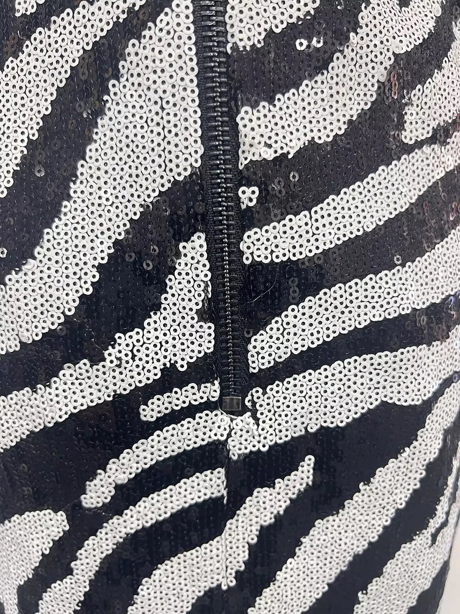 Ready to unleash your inner party animal? This Luxe Zebra Sequin Mini Dress is a total showstopper. Imagine making an entrance in this dazzling zebra-print mini, shimmering from head to toe.