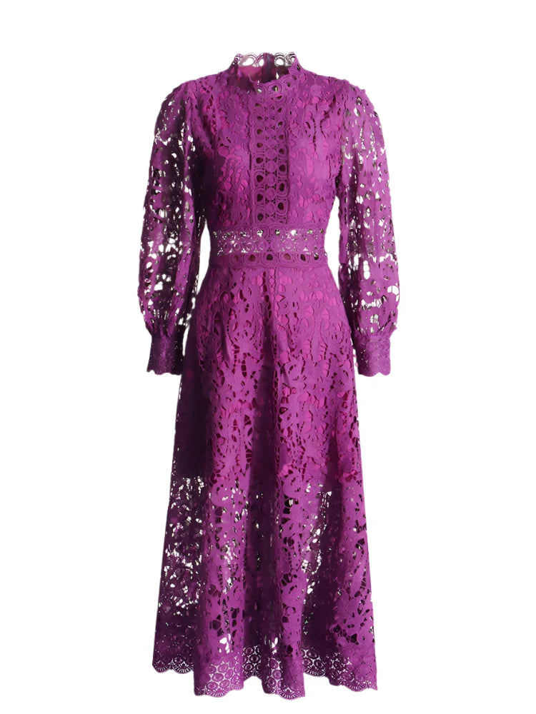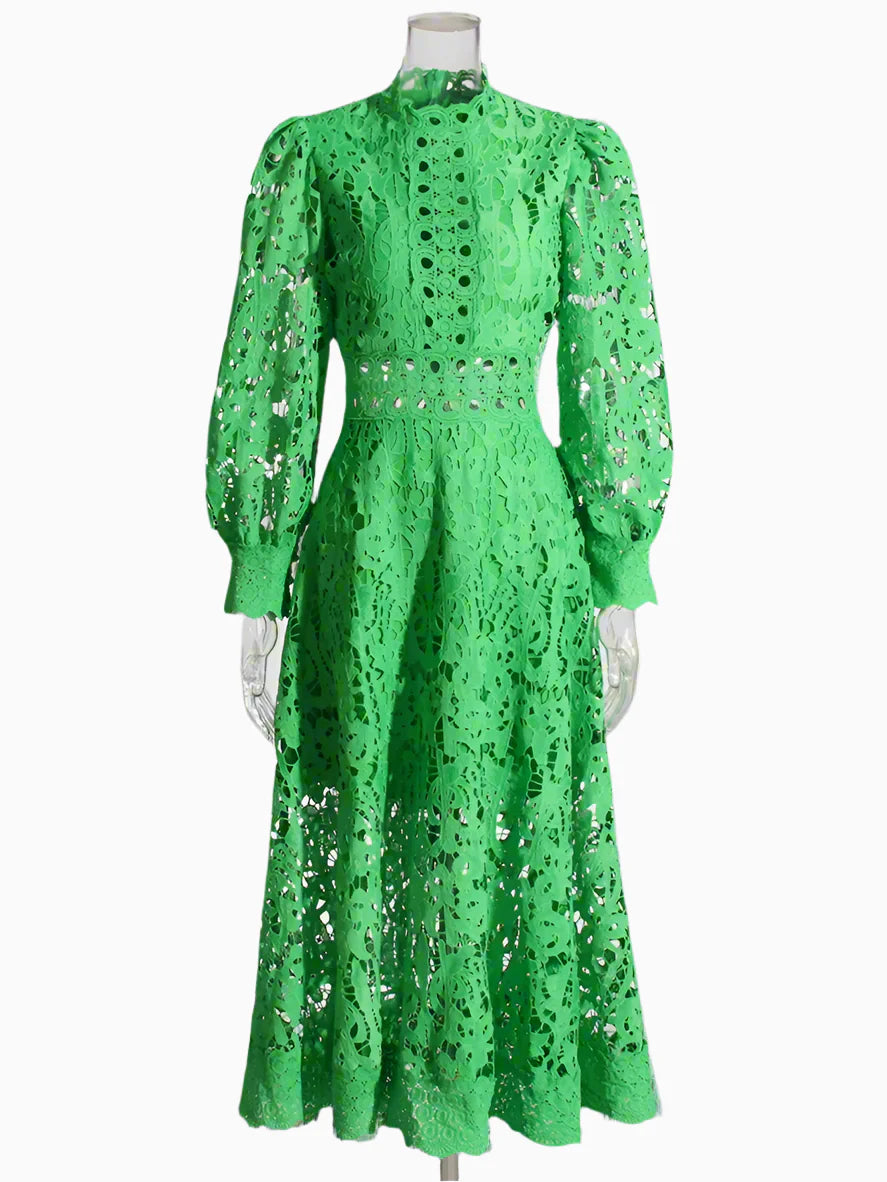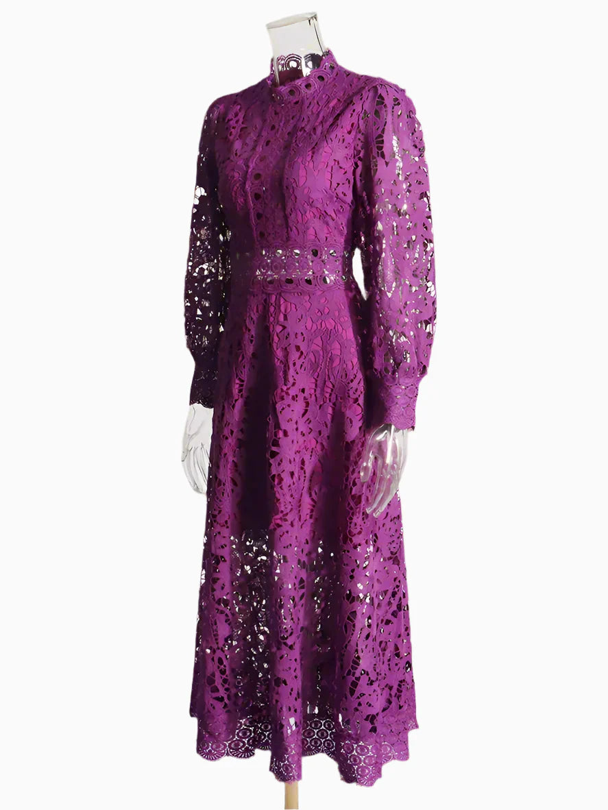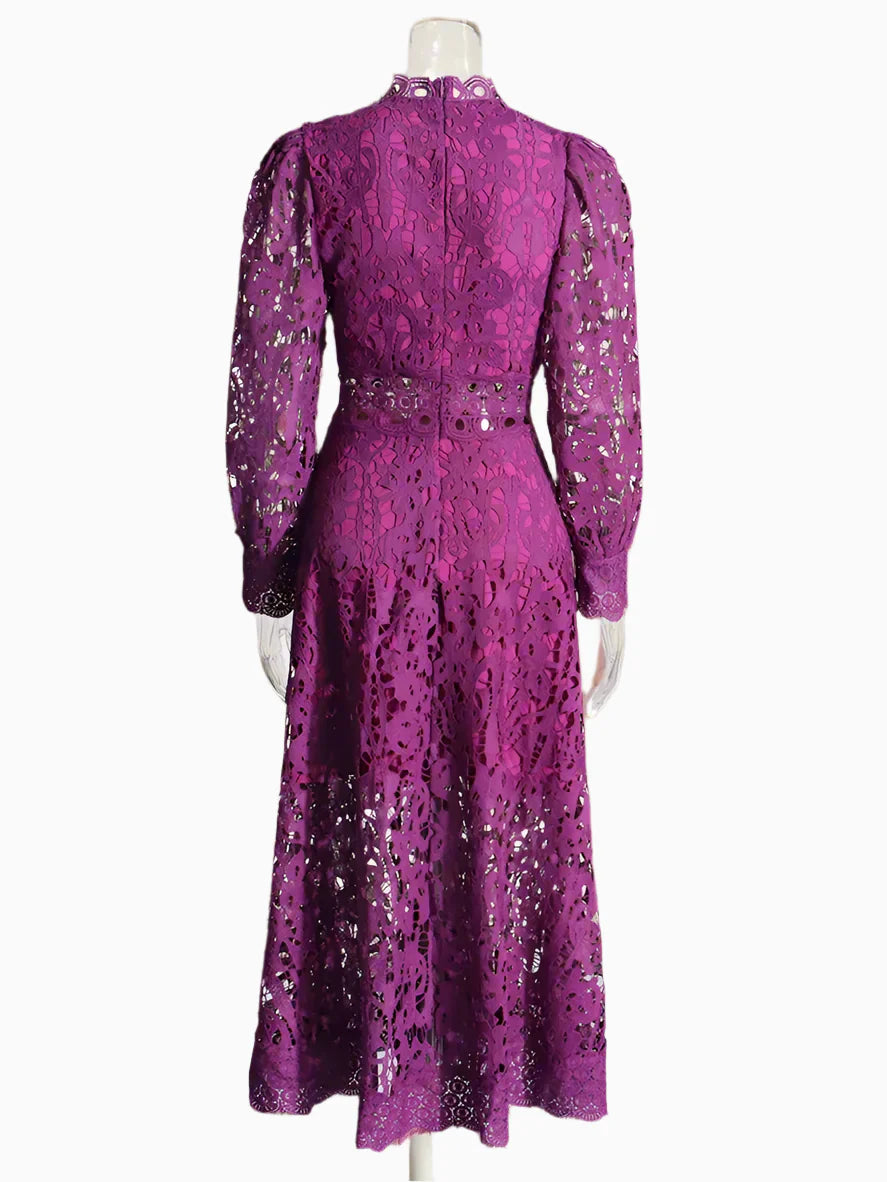 This stunning lace midi dress exudes elegance with a high neckline and intricate cut-out details. The long sleeves add a touch of sophistication, making it perfect for any special occasion. A must-have statement piece.