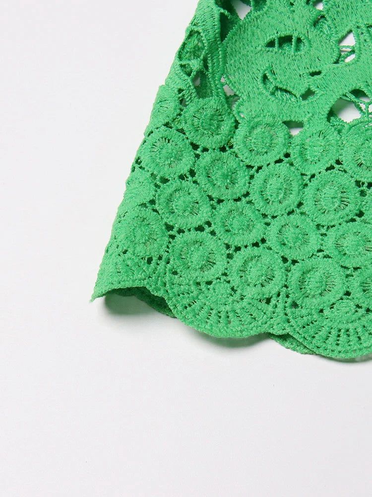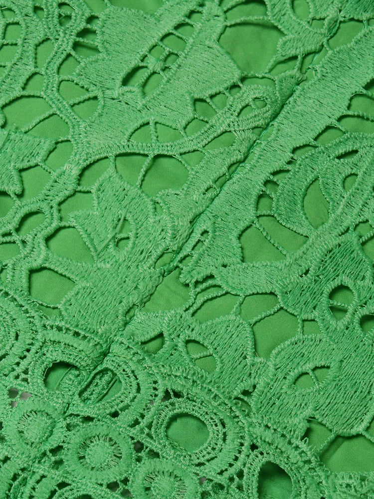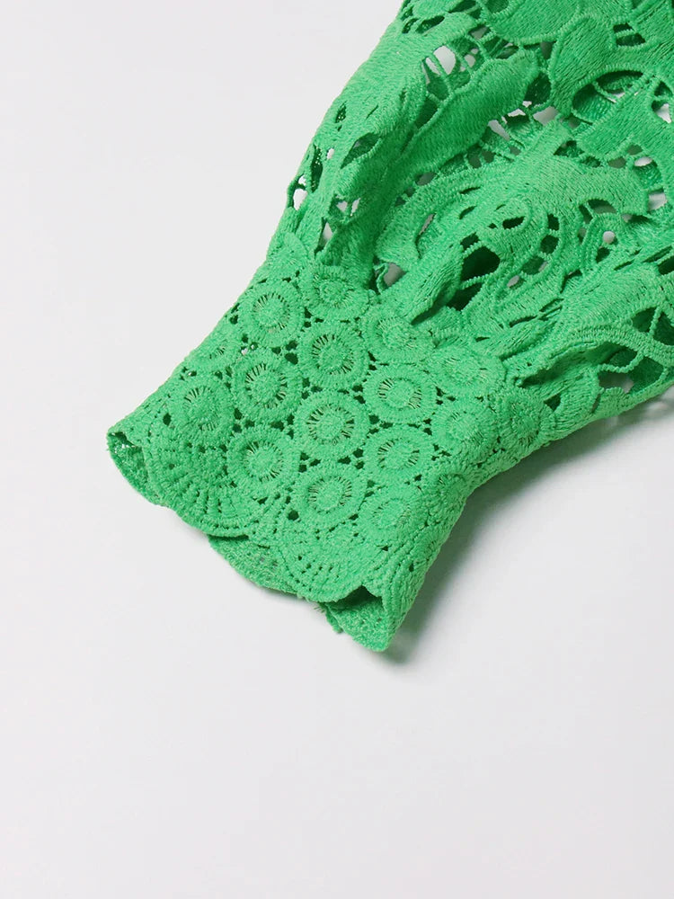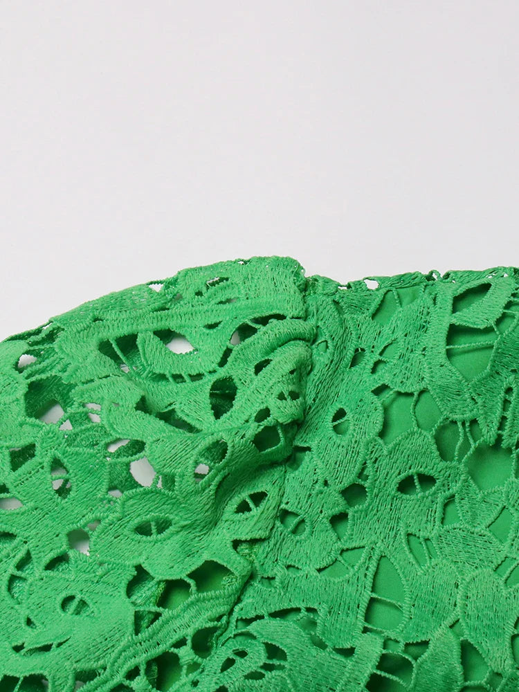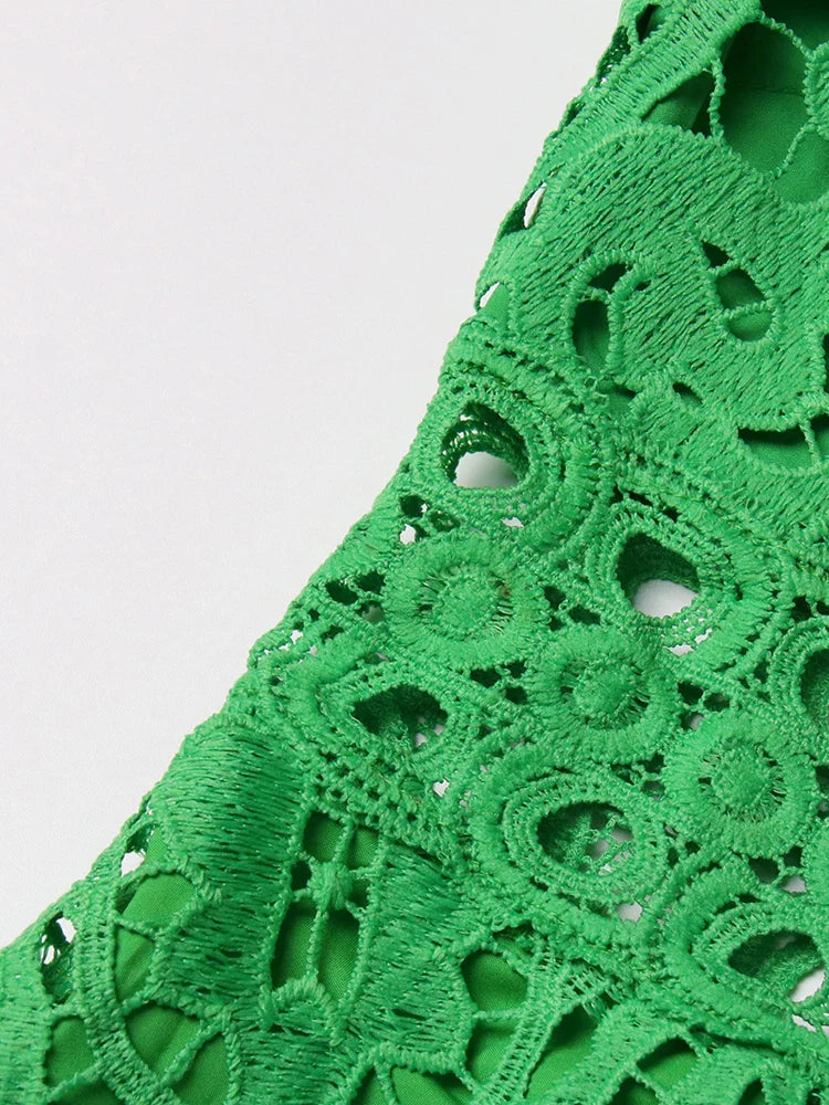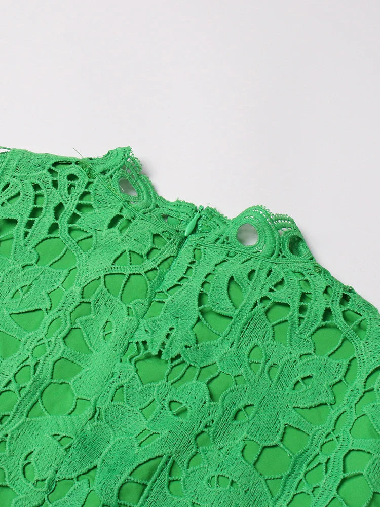 This stunning lace midi dress exudes elegance with a high neckline and intricate cut-out details. The long sleeves add a touch of sophistication, making it perfect for any special occasion. A must-have statement piece.
