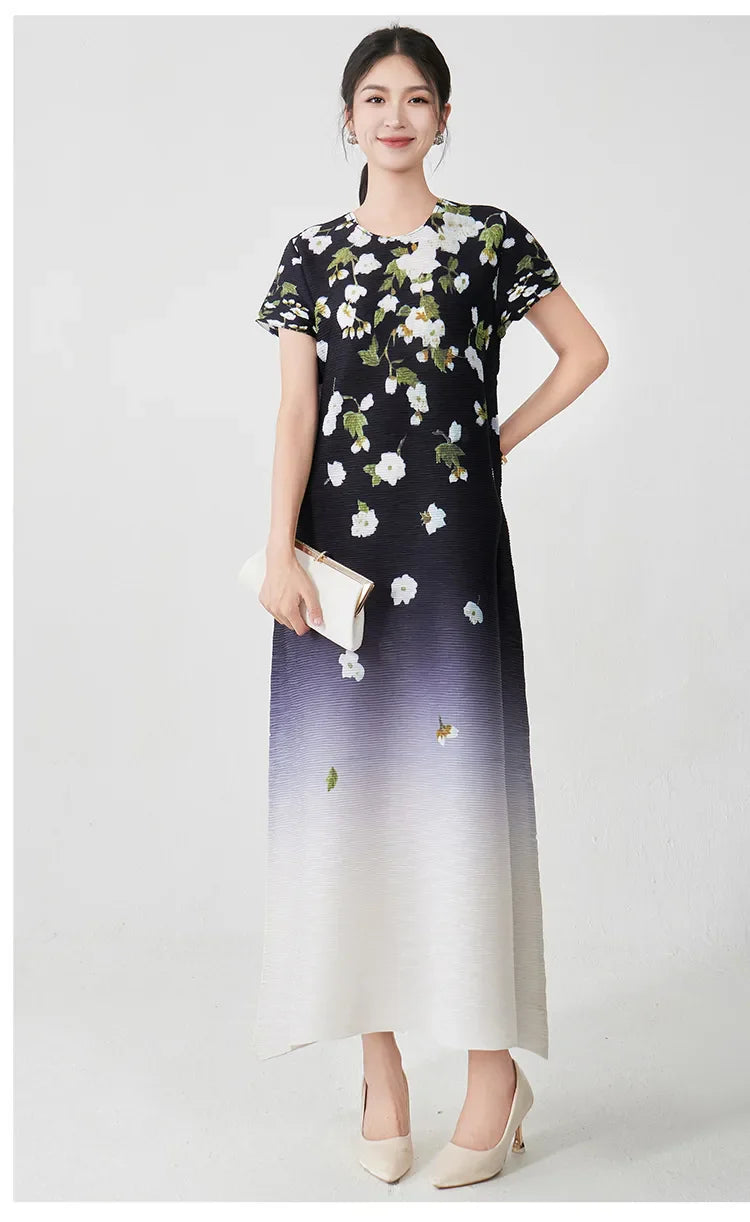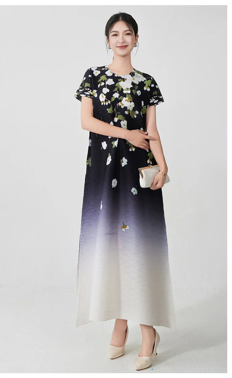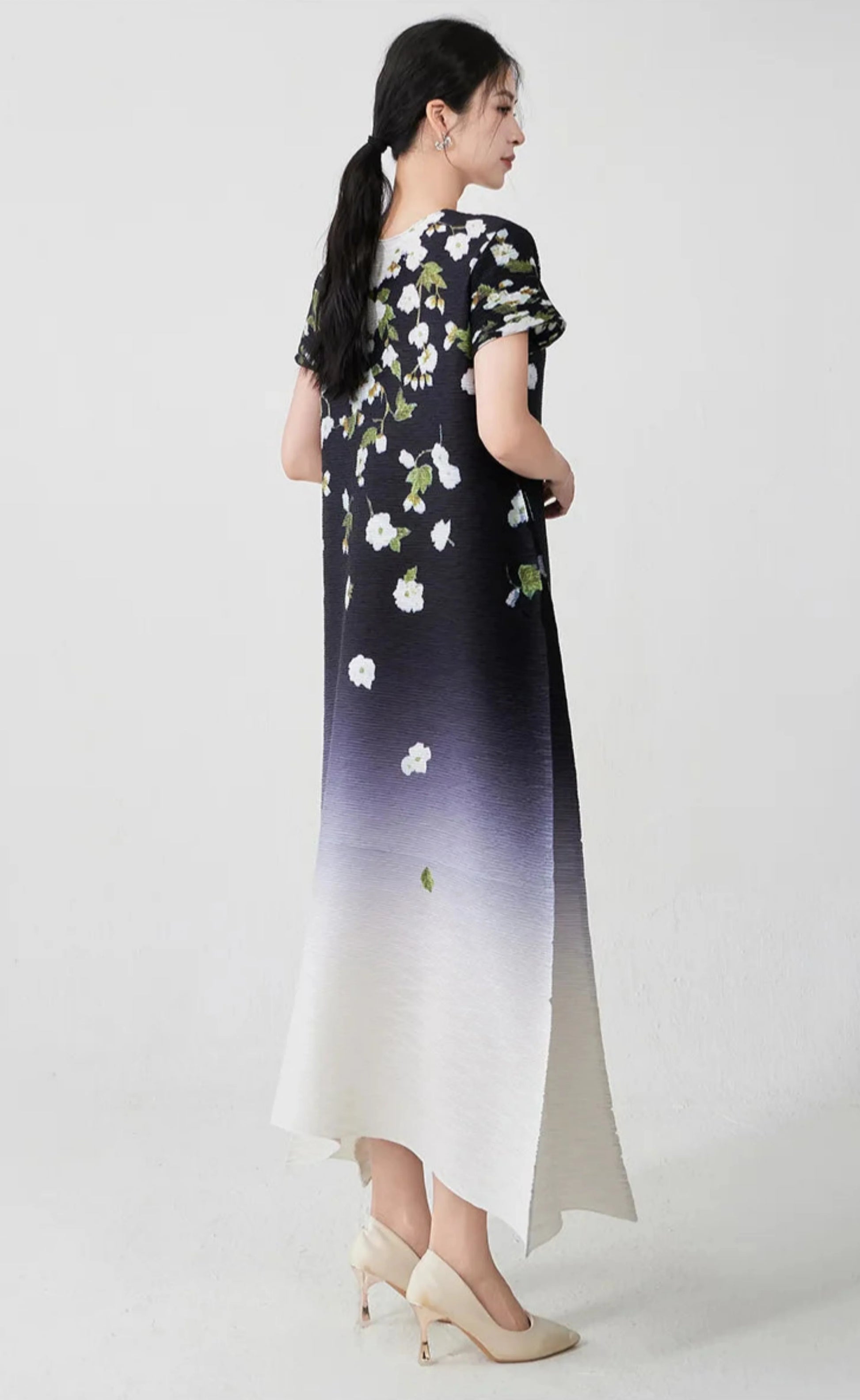 This midi dress blends Japanese pleated design with floral ombré tones. It features a modest neckline, short sleeves, and a flattering A-line shape.