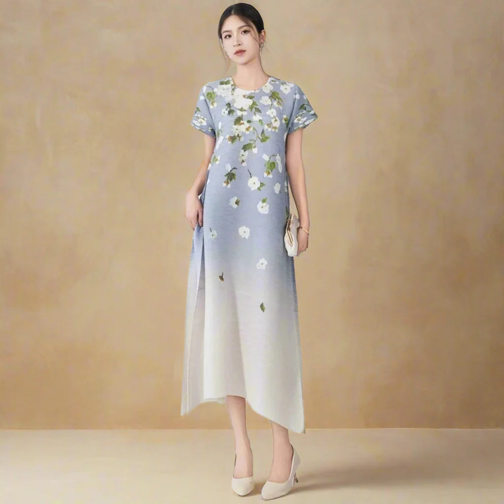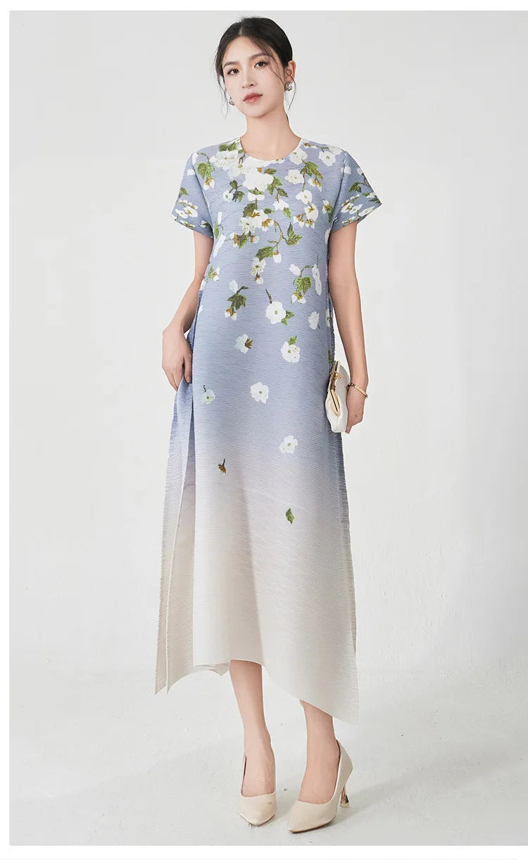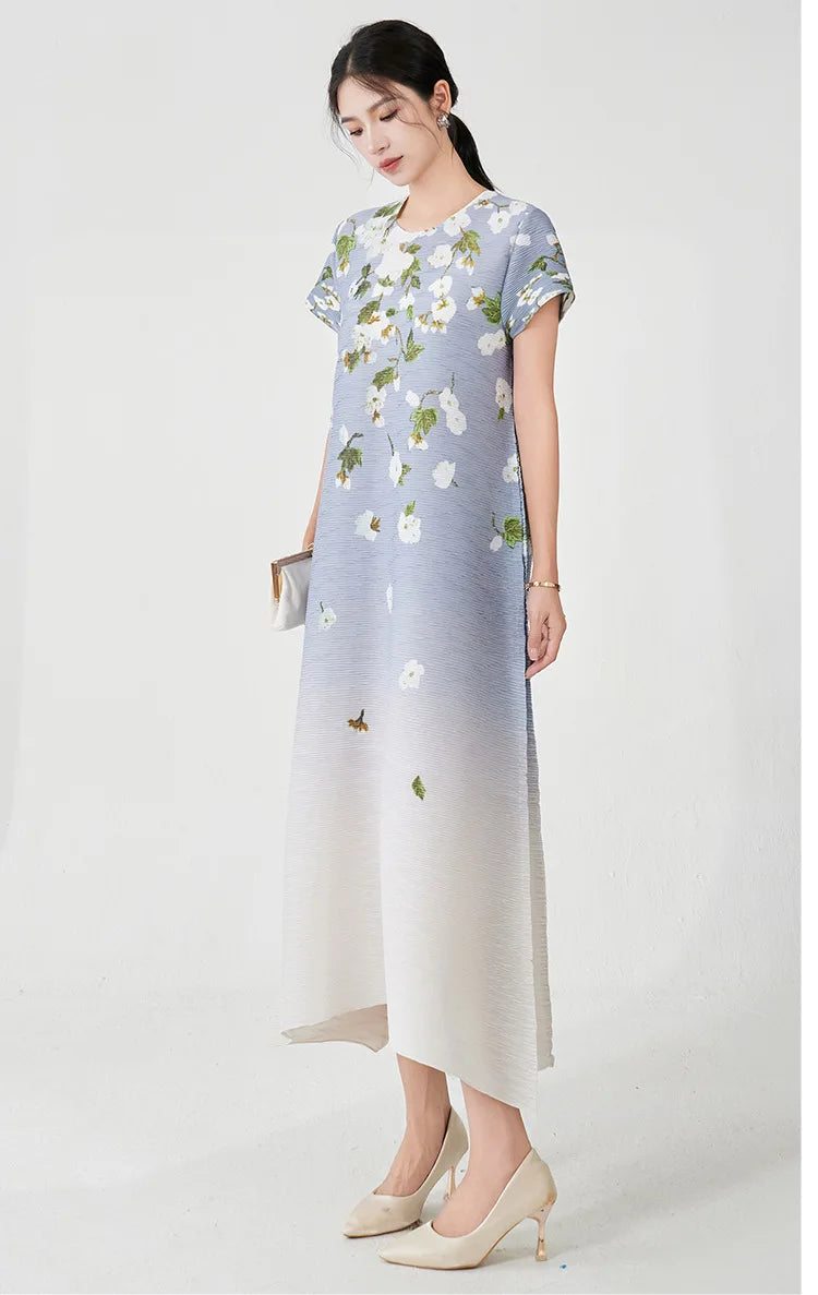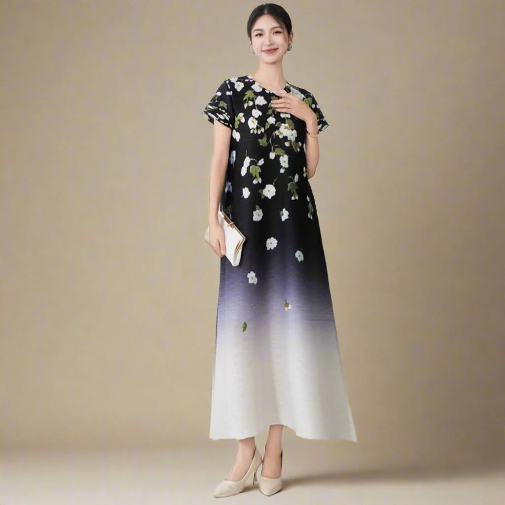 This midi dress blends Japanese pleated design with floral ombré tones. It features a modest neckline, short sleeves, and a flattering A-line shape.