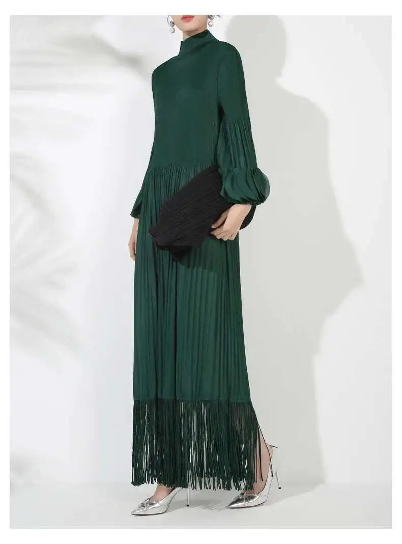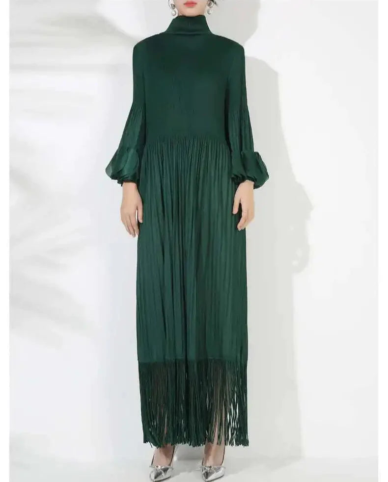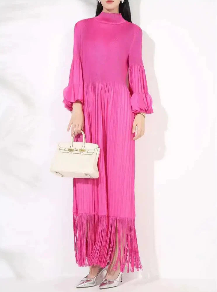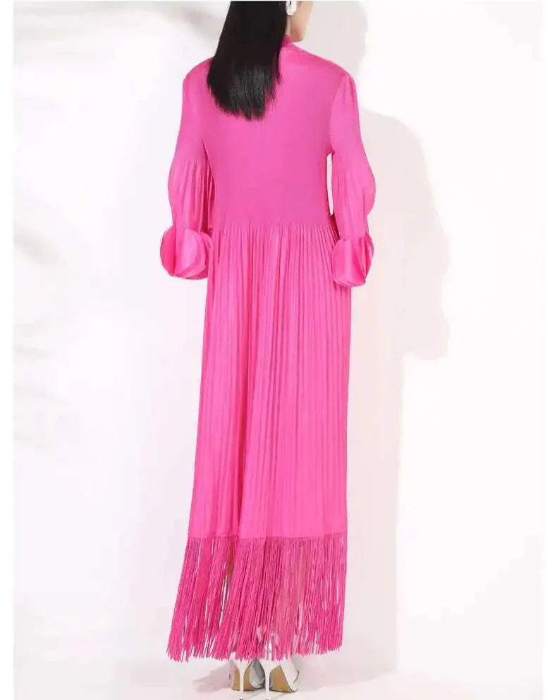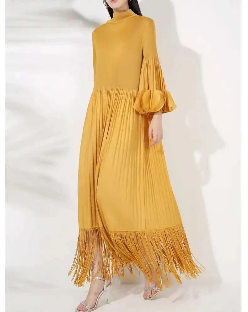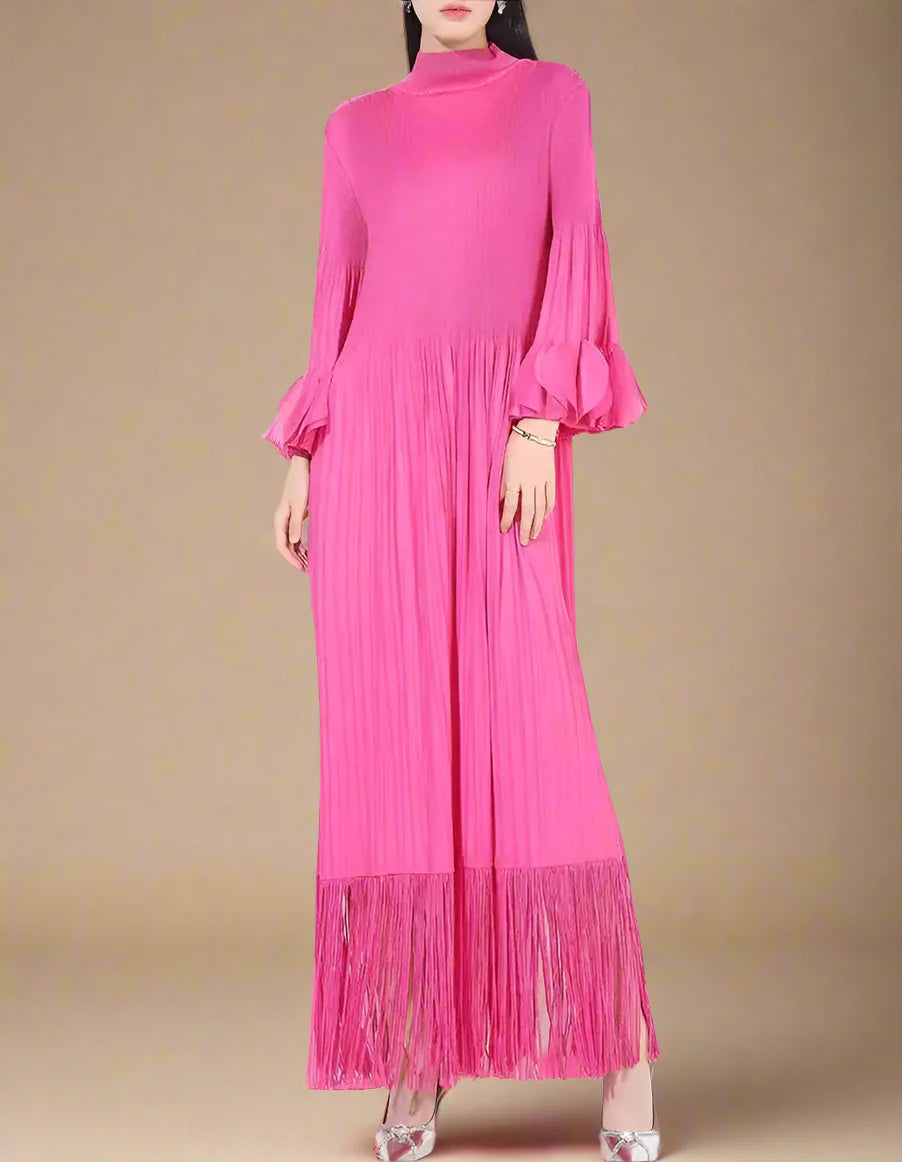 This maxi dress features pleated plissé fabric with elegant ruffle sleeves and subtle tassel fringe details for a standout, luxurious look. The stretchy, flowing design offers all-day comfort, while the lightweight, wrinkle-resistant material keeps it polished.