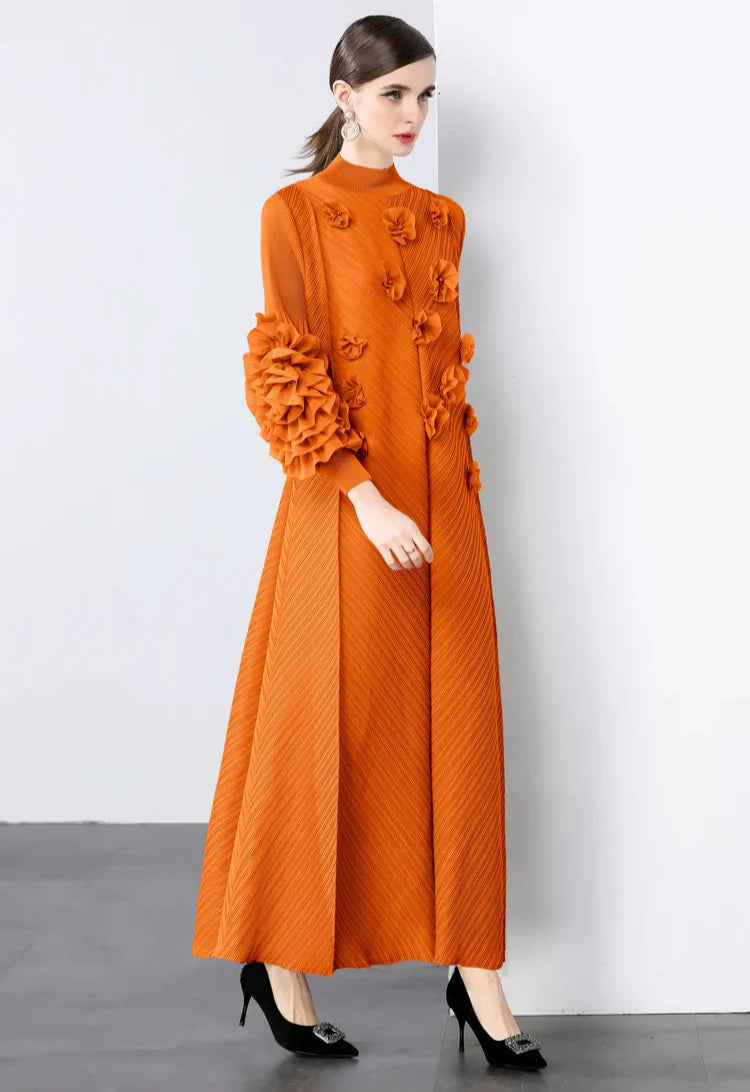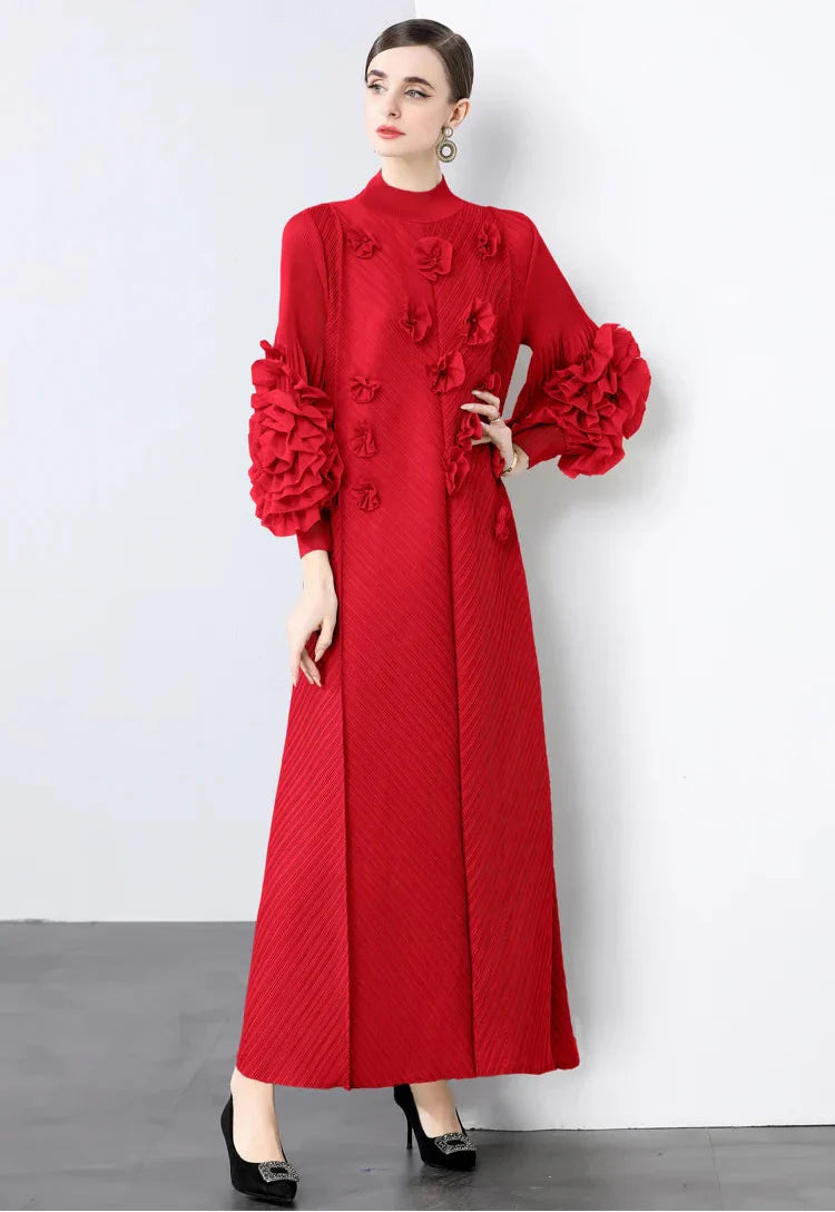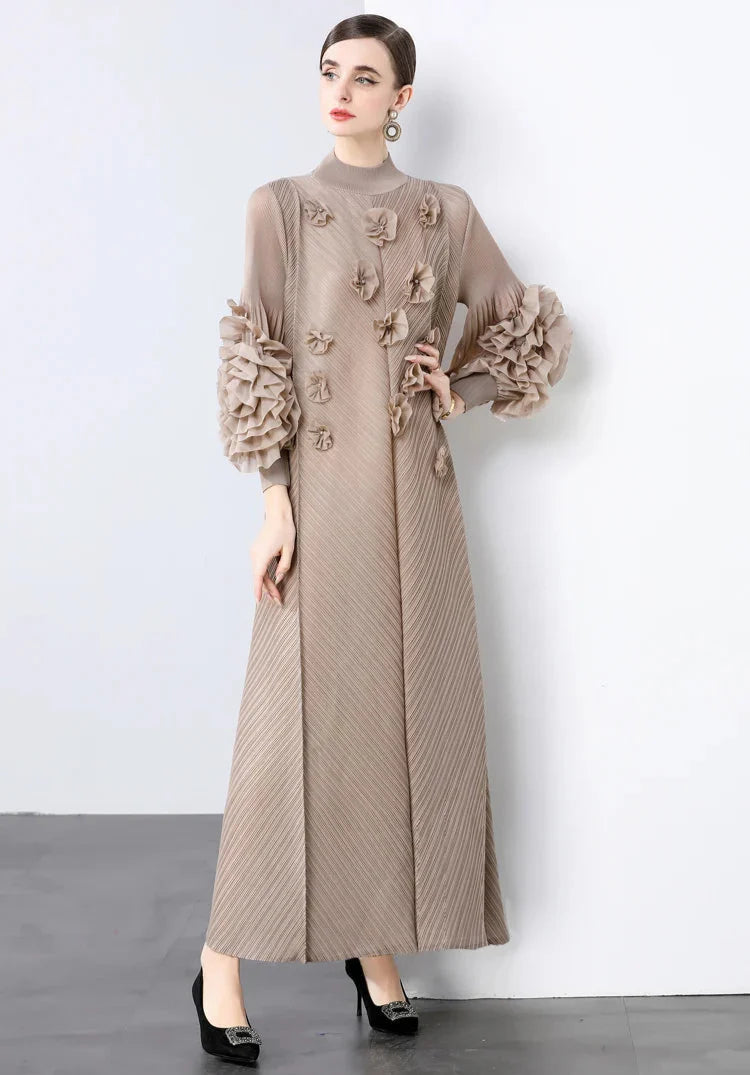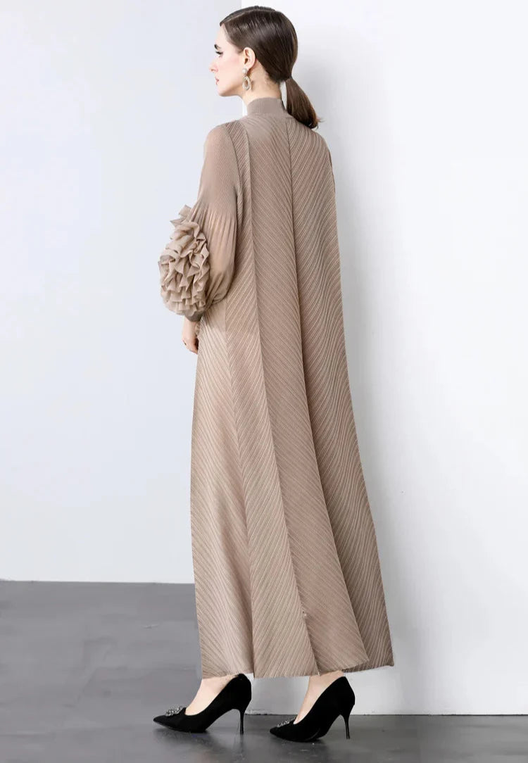 A gorgeous dress designed for unforgettable occasions. Japanese pleats shape a flowing silhouette, while ruffled floral sleeves add striking elegance.