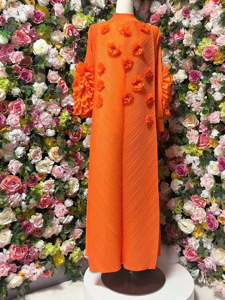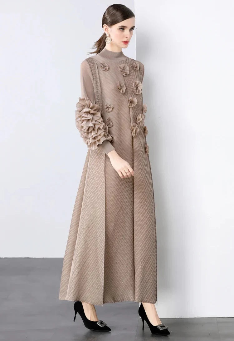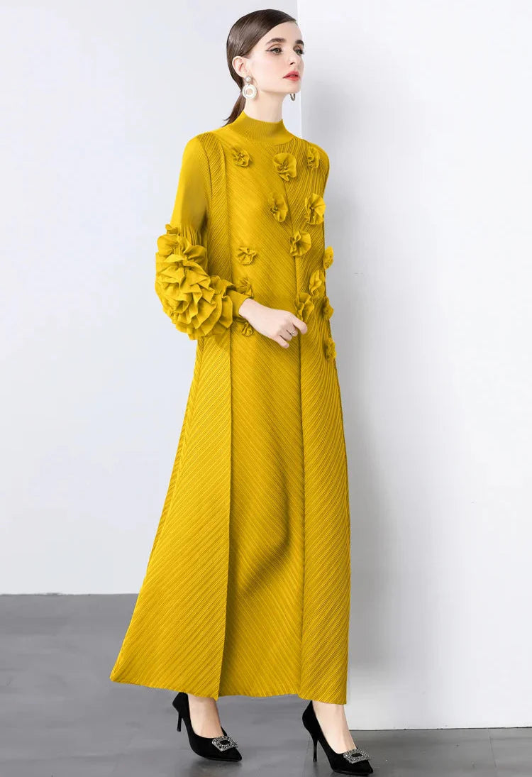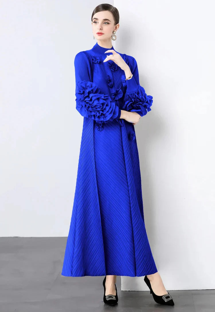 A gorgeous dress designed for unforgettable occasions. Japanese pleats shape a flowing silhouette, while ruffled floral sleeves add striking elegance.