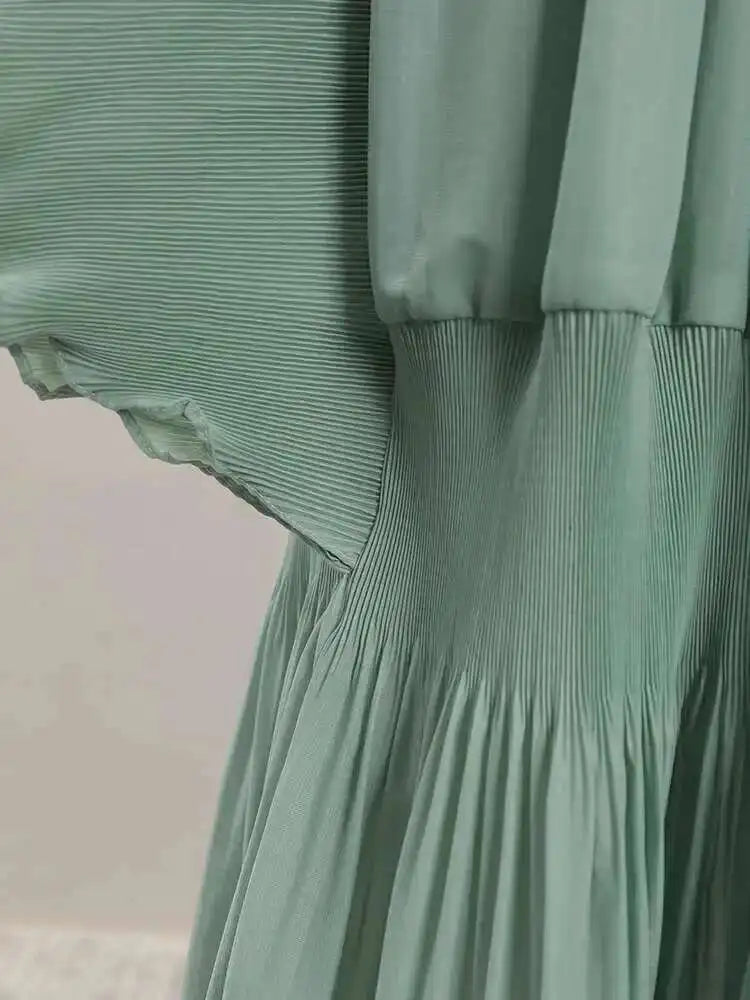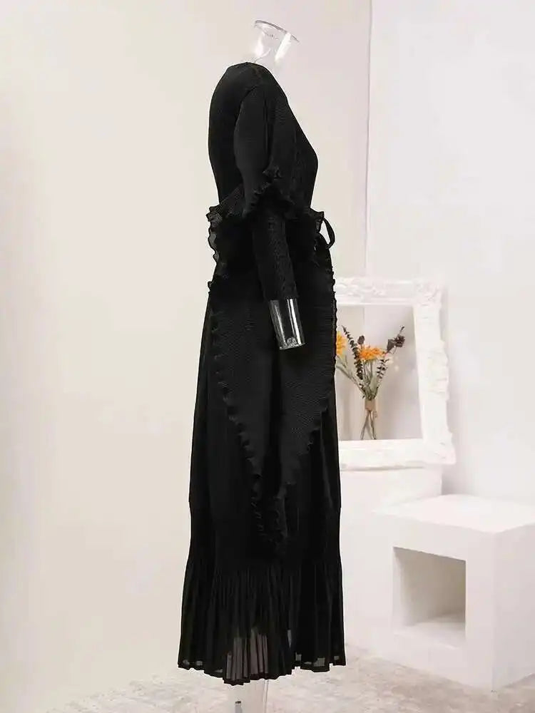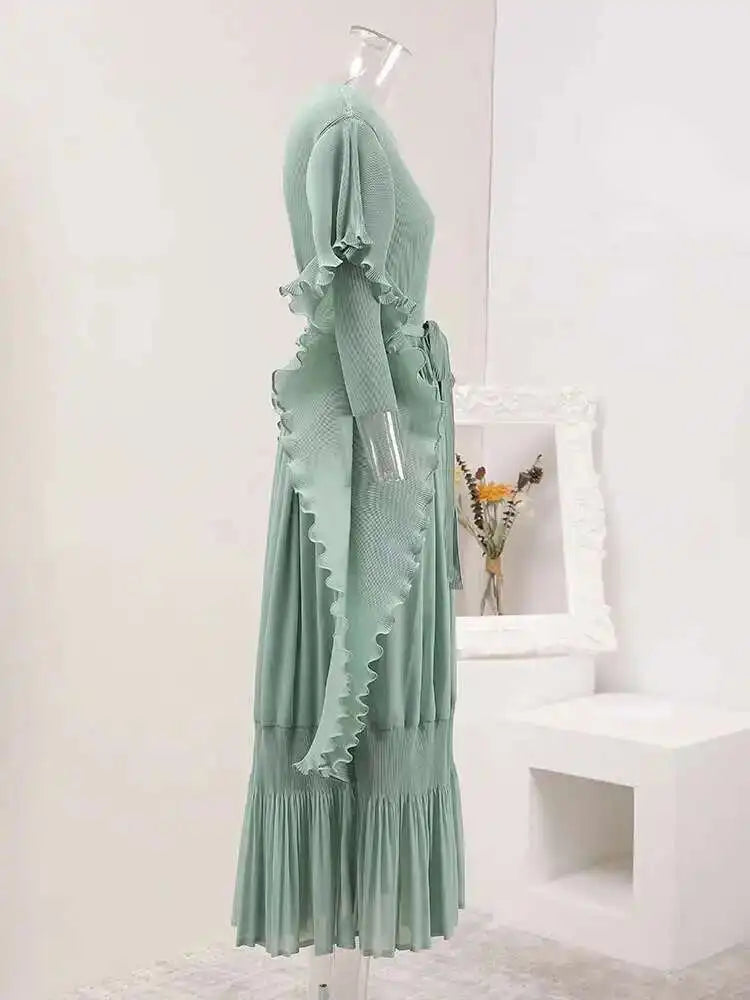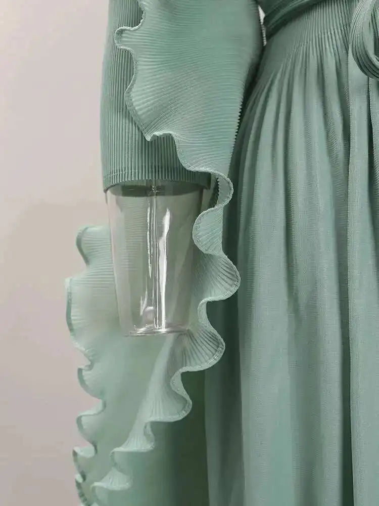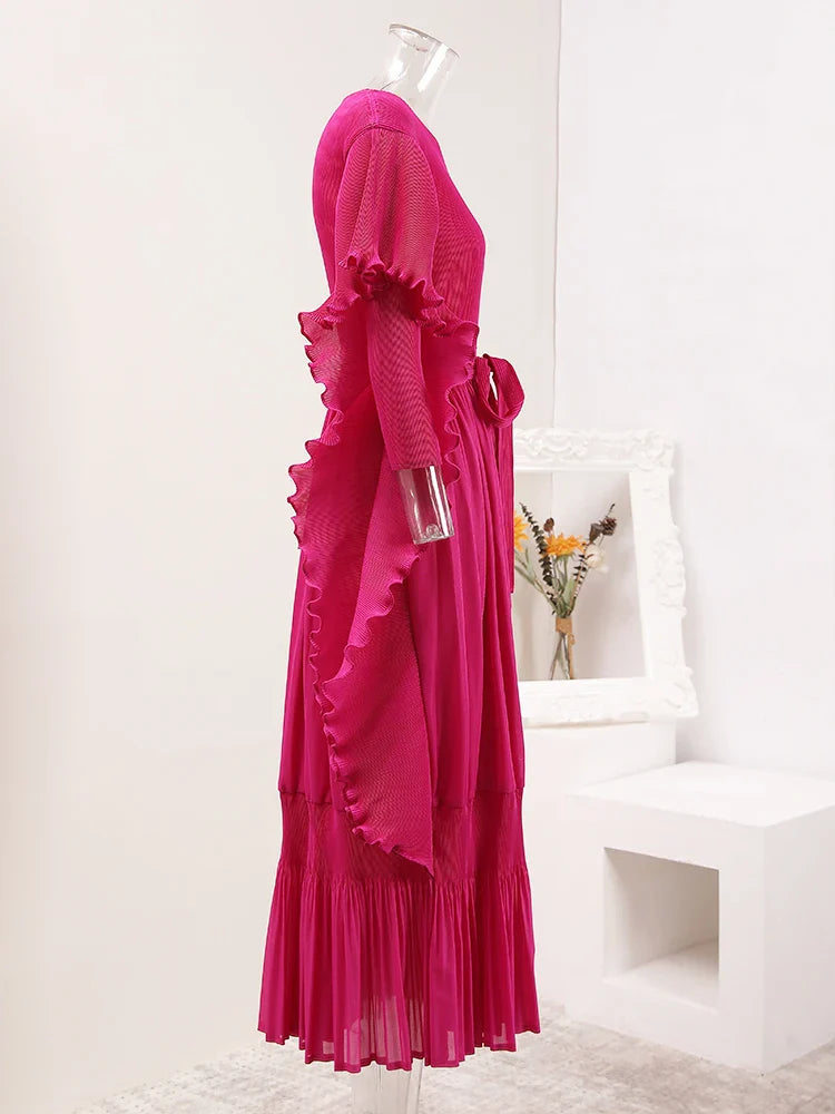 The perfect ruffled maxi dress. Formed in luxury Japanese pleats, its flowing tiers and 3/4 sleeves create a sculpted, elegant shape.