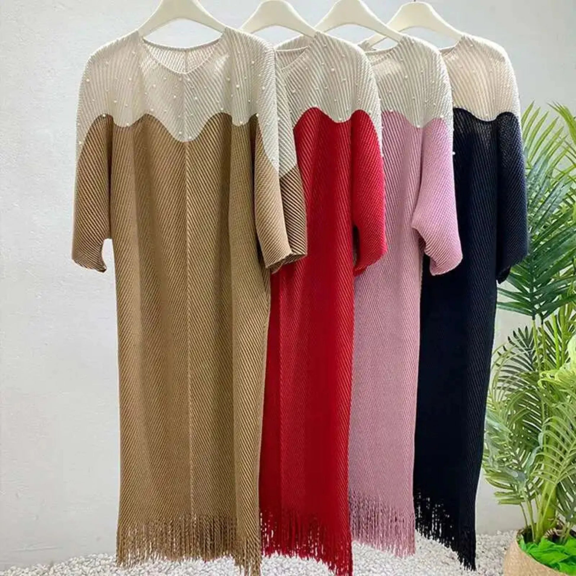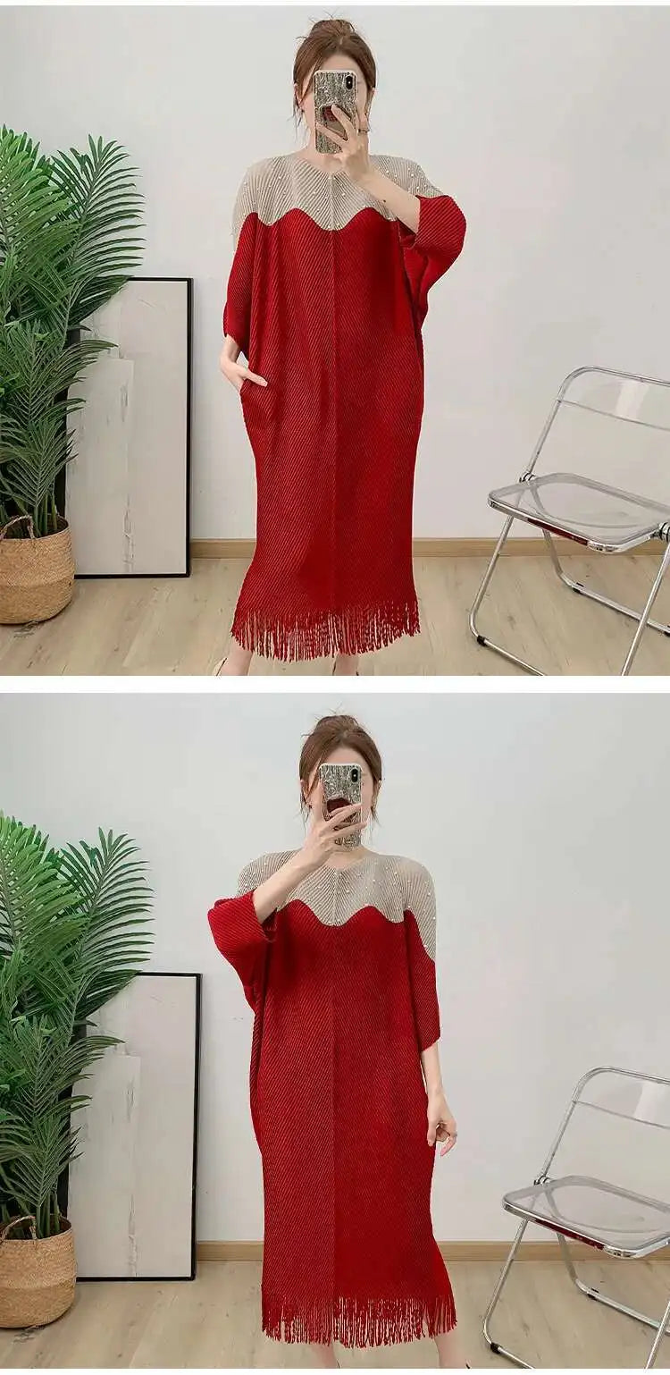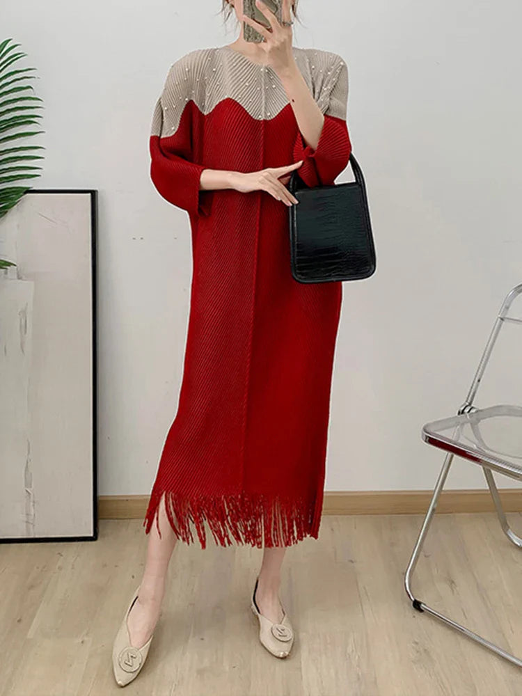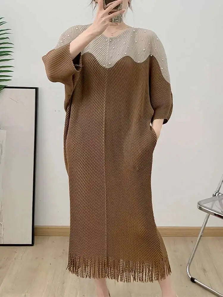 A Japanese plissé dress featuring 3/4 batwing sleeves, a playful tassel hem, midi length, and a relaxed loose fit for comfort.