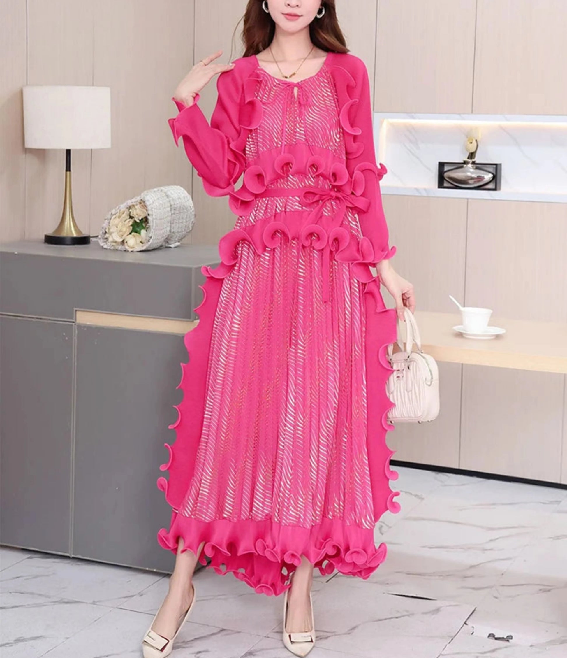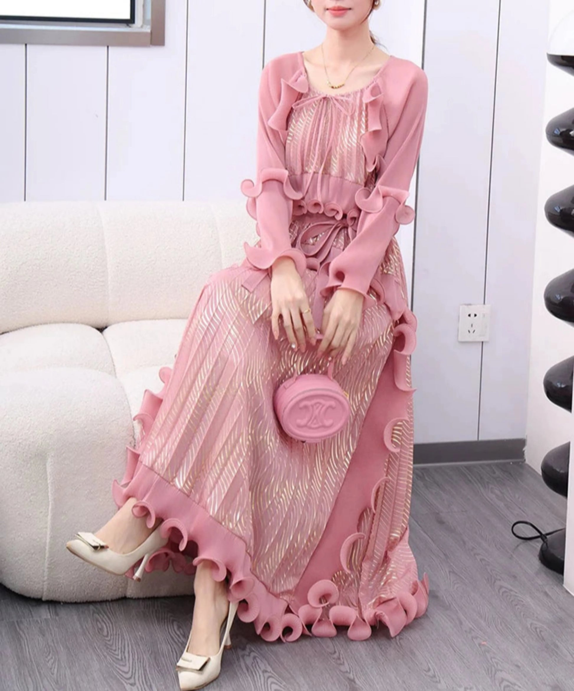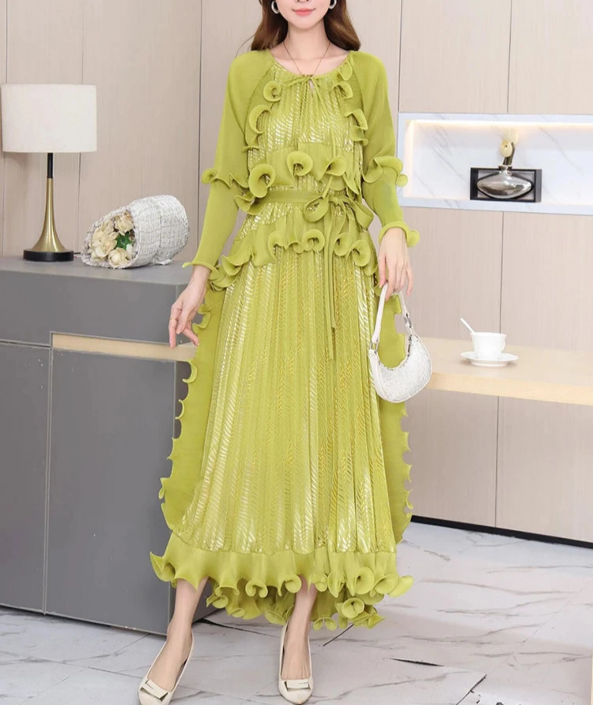 This Japanese pleated ruffled tiered midi dress brings a statement of luxury and comfort. Featuring soft pleats, flowing tiers, and long sleeves, it blends style with ease.