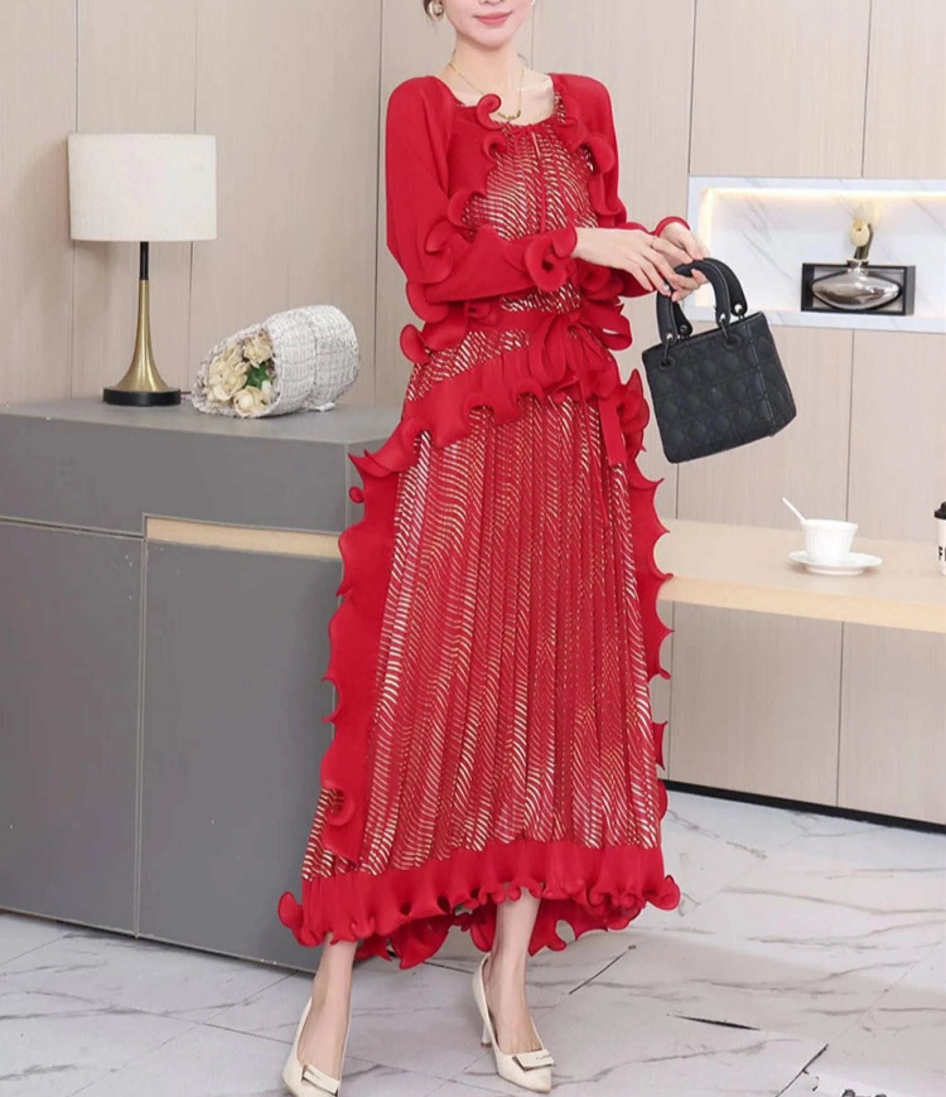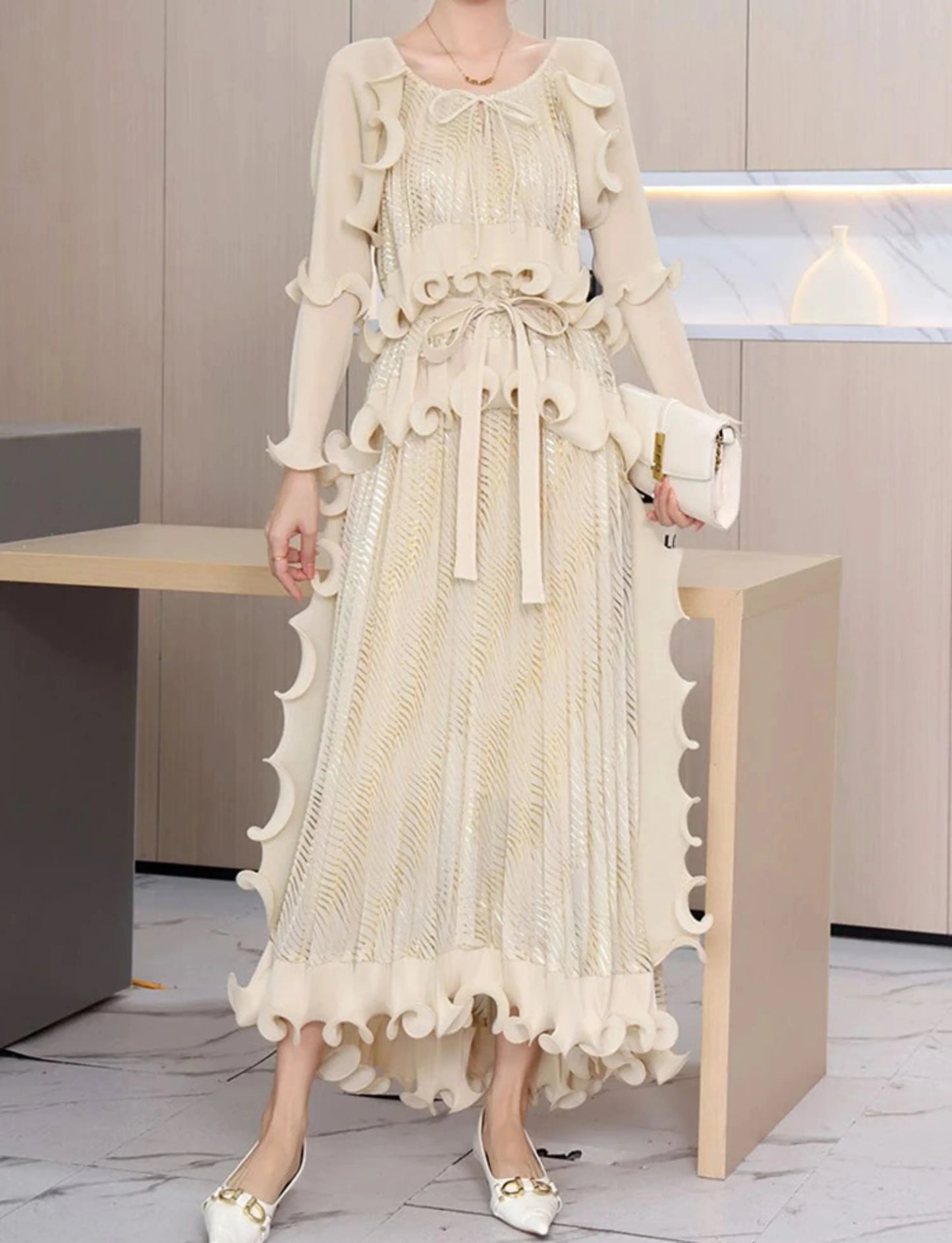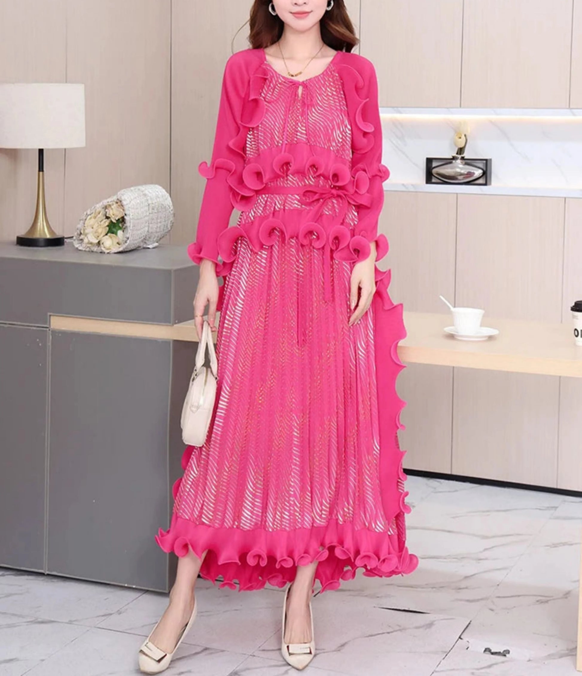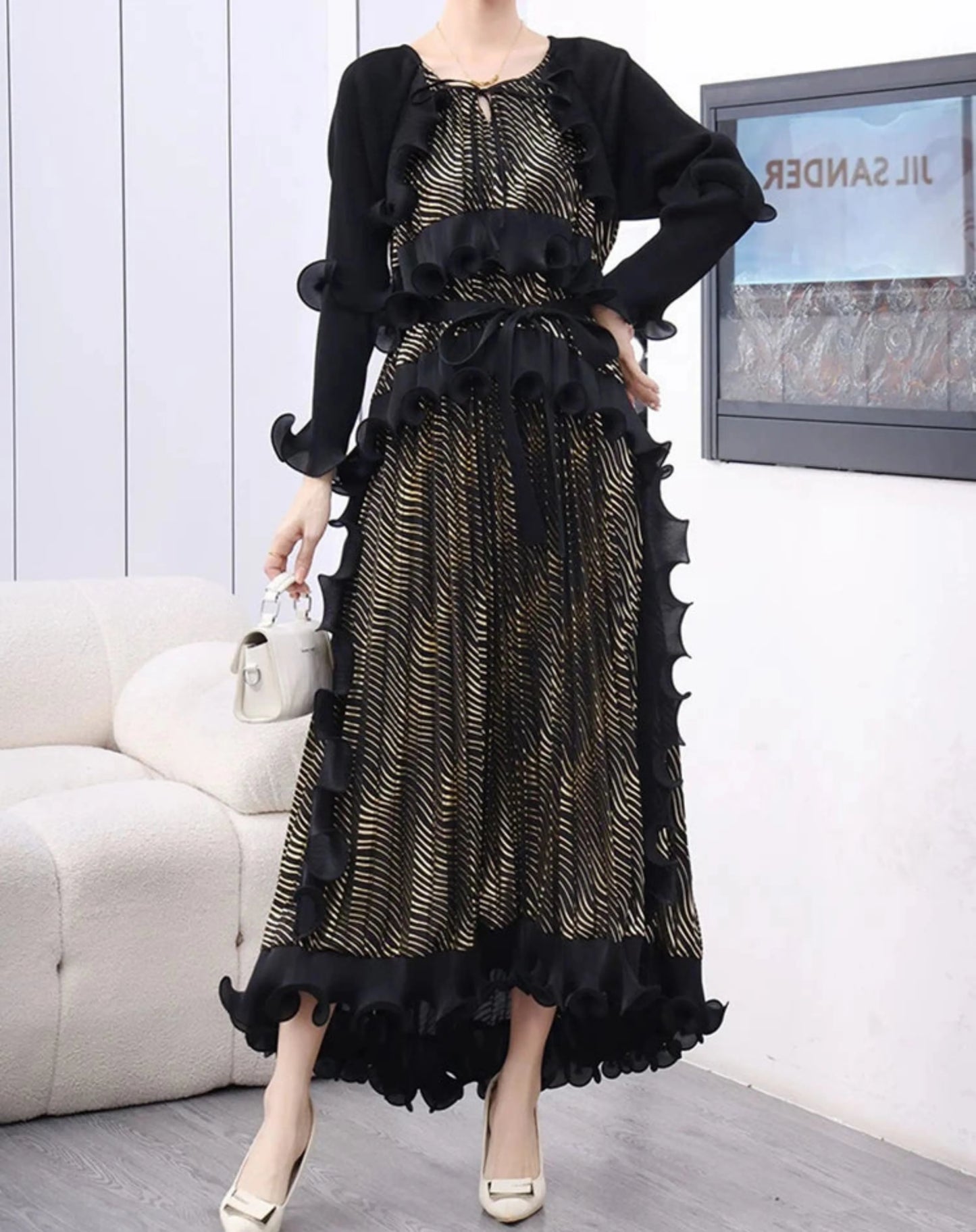 This Japanese pleated ruffled tiered midi dress brings a statement of luxury and comfort. Featuring soft pleats, flowing tiers, and long sleeves, it blends style with ease.