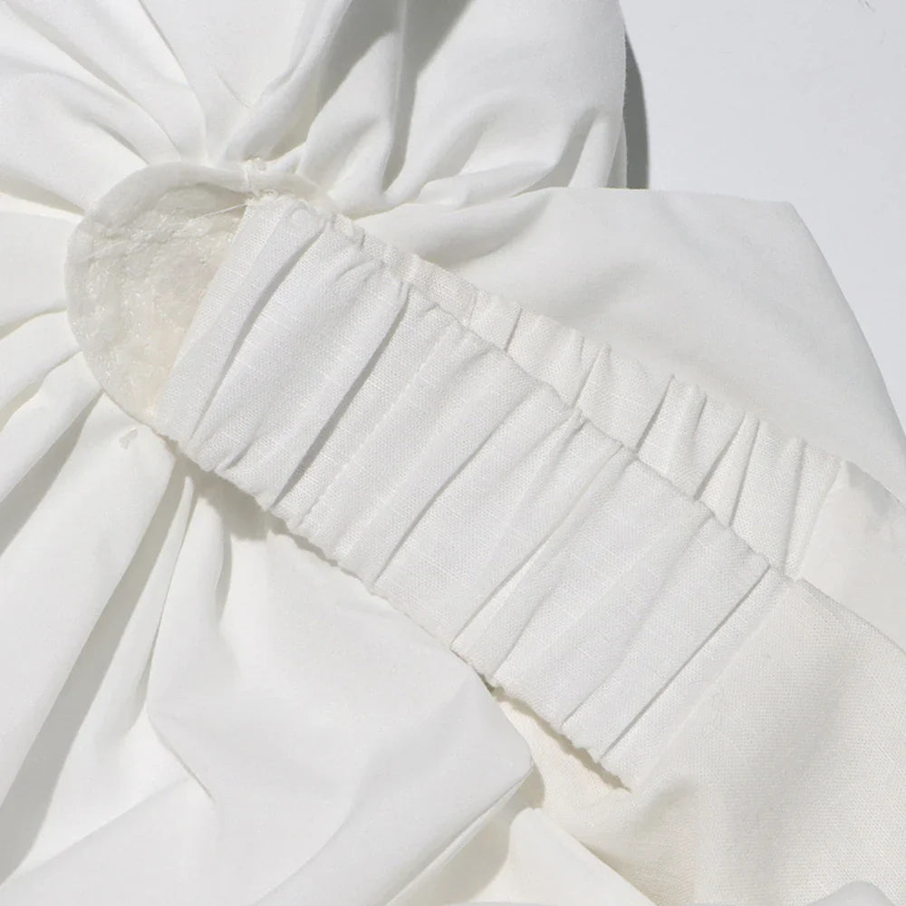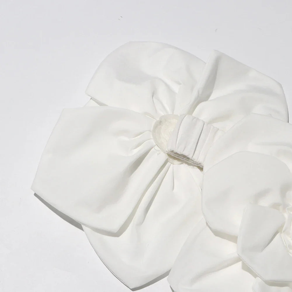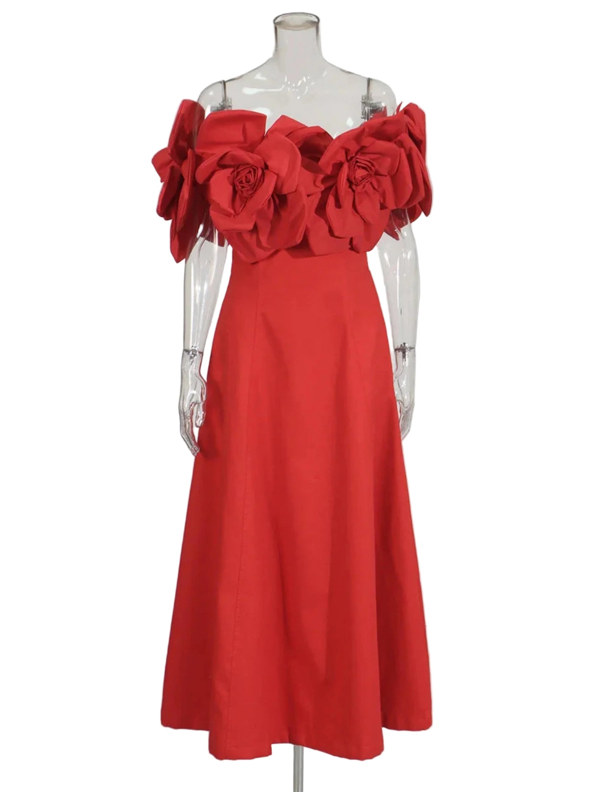 An off-shoulder midi dress featuring oversized 3D floral detailing for a bold, avant-garde look. The flowing silhouette drapes beautifully for a flattering fit, while the structured floral design adds dimension and texture.