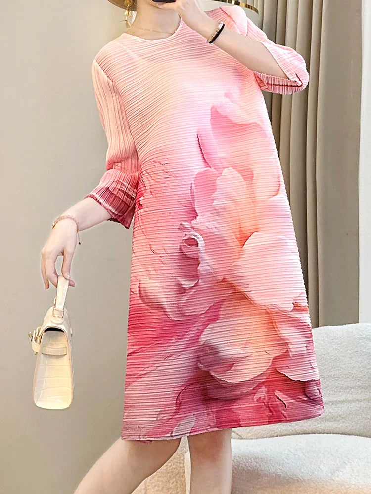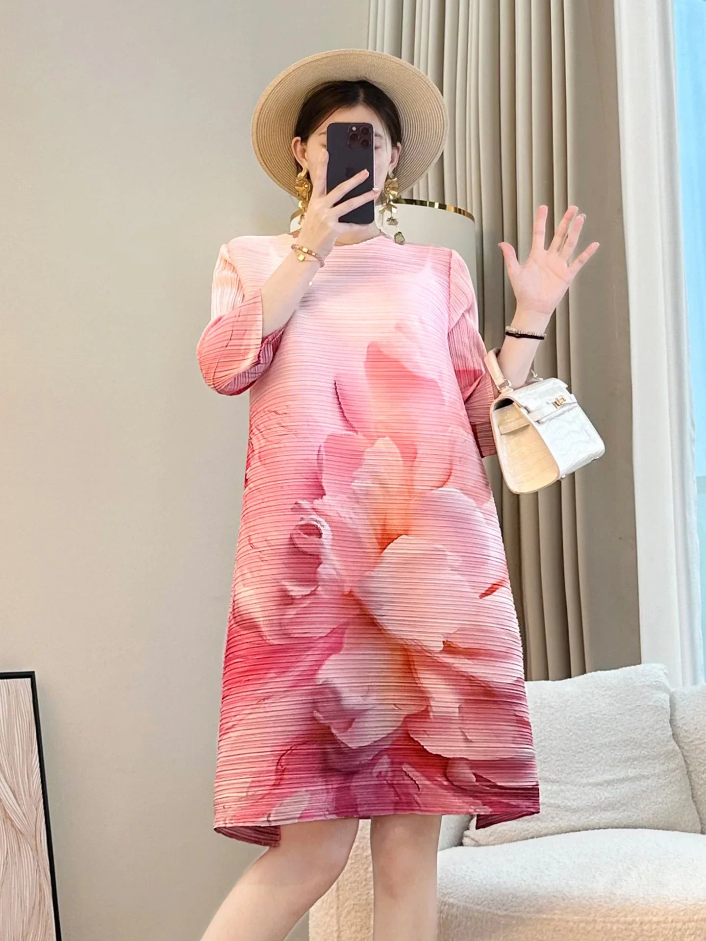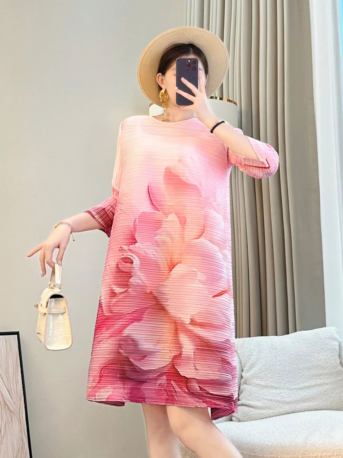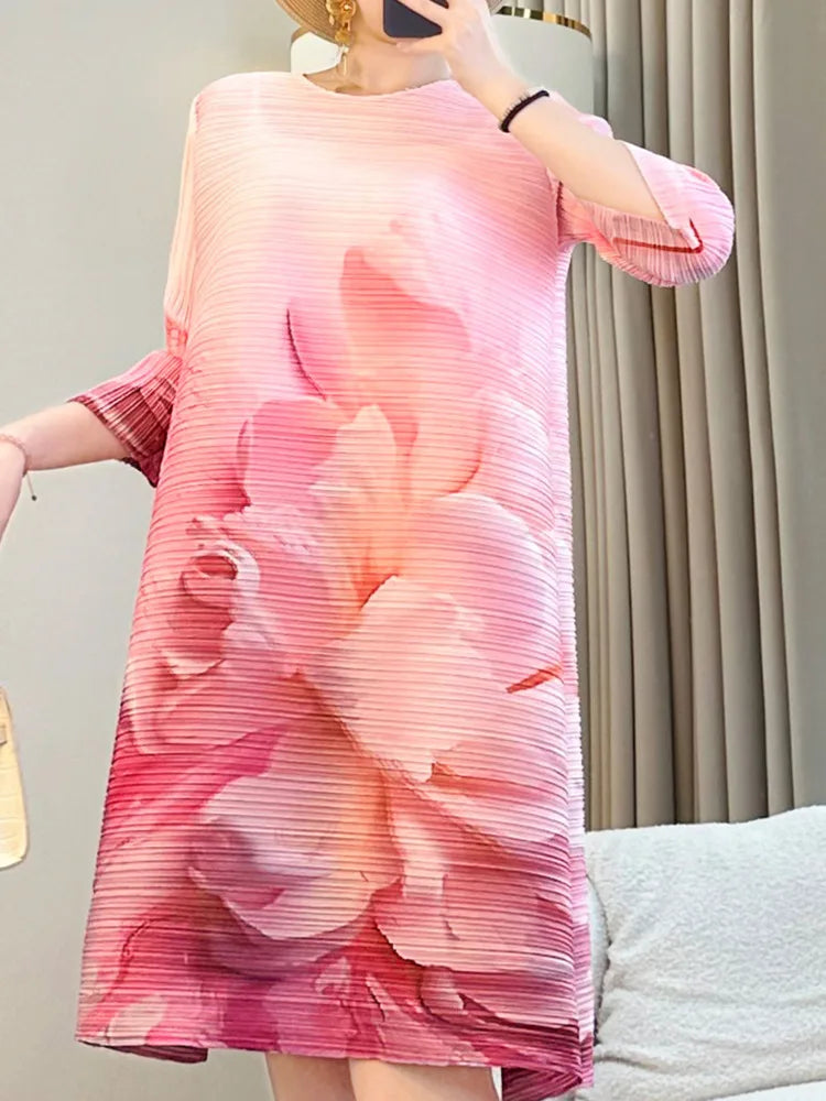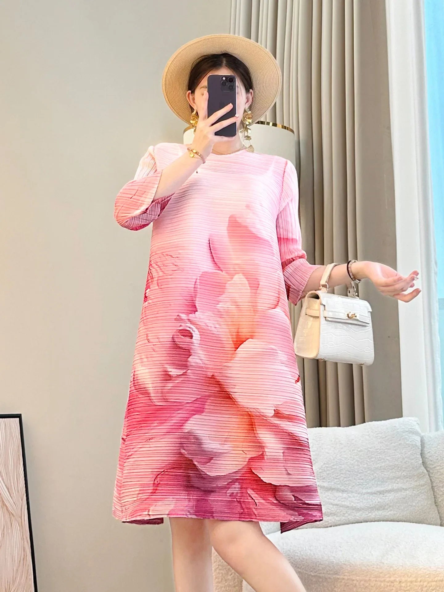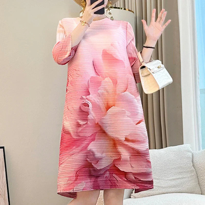 This luxury pleated midi dress exudes elegance with its floral design. Featuring delicate 3/4 sleeves and Japanese-inspired pleats, it’s perfect for special occasions.