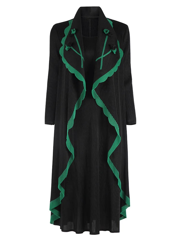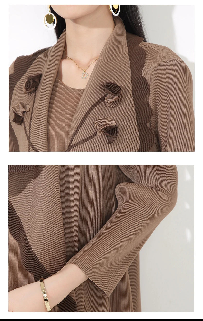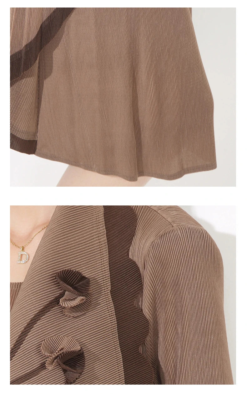 This midi-length dress features Japanese pleats with a floral collar for a timeless, elegant look. The stretchy, wrinkle-resistant fabric ensures comfort, while the flowing design keeps it stylish and luxurious.