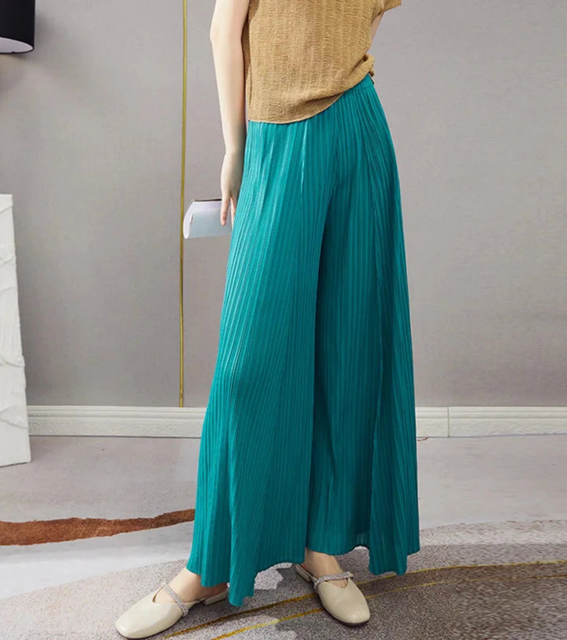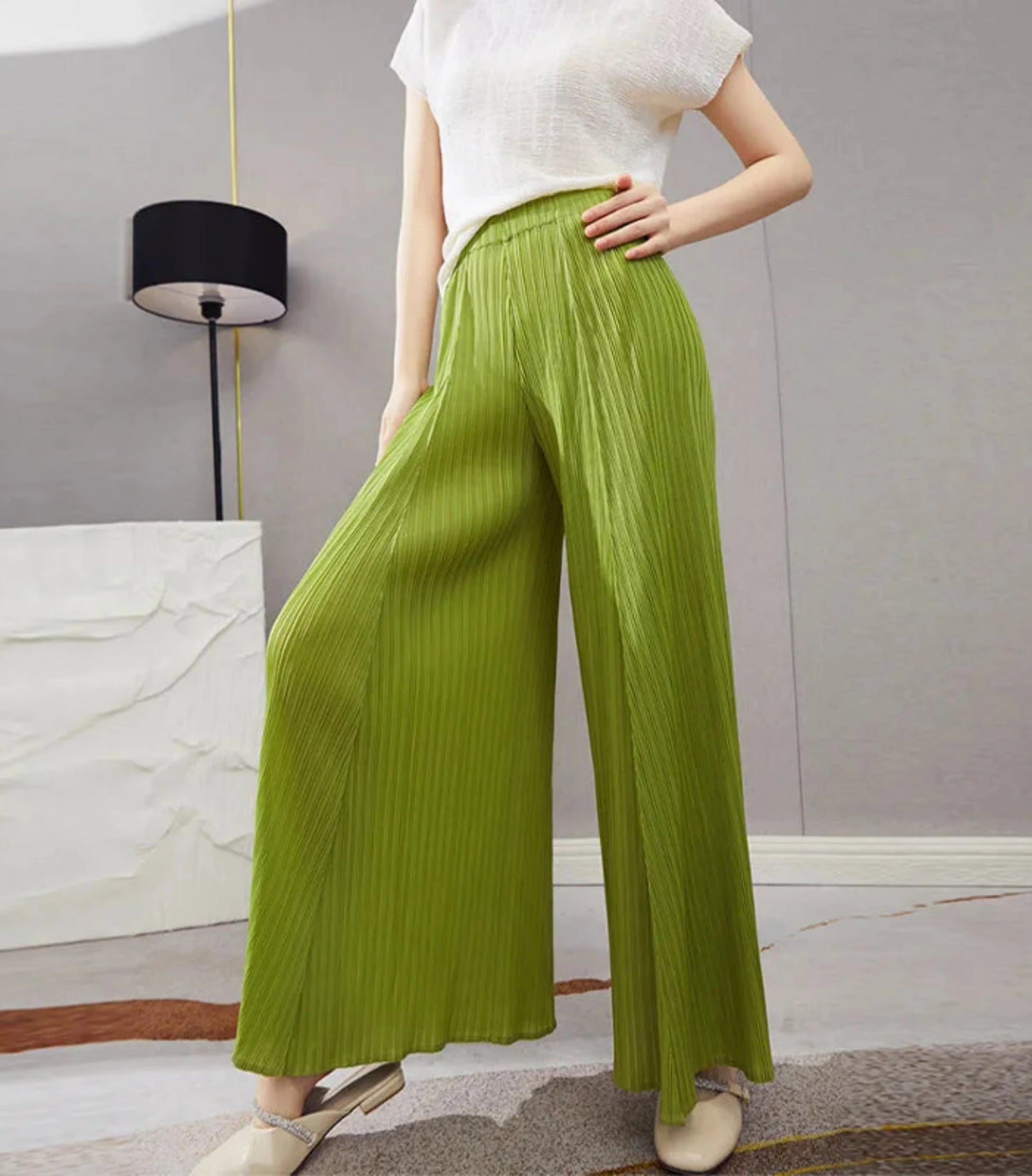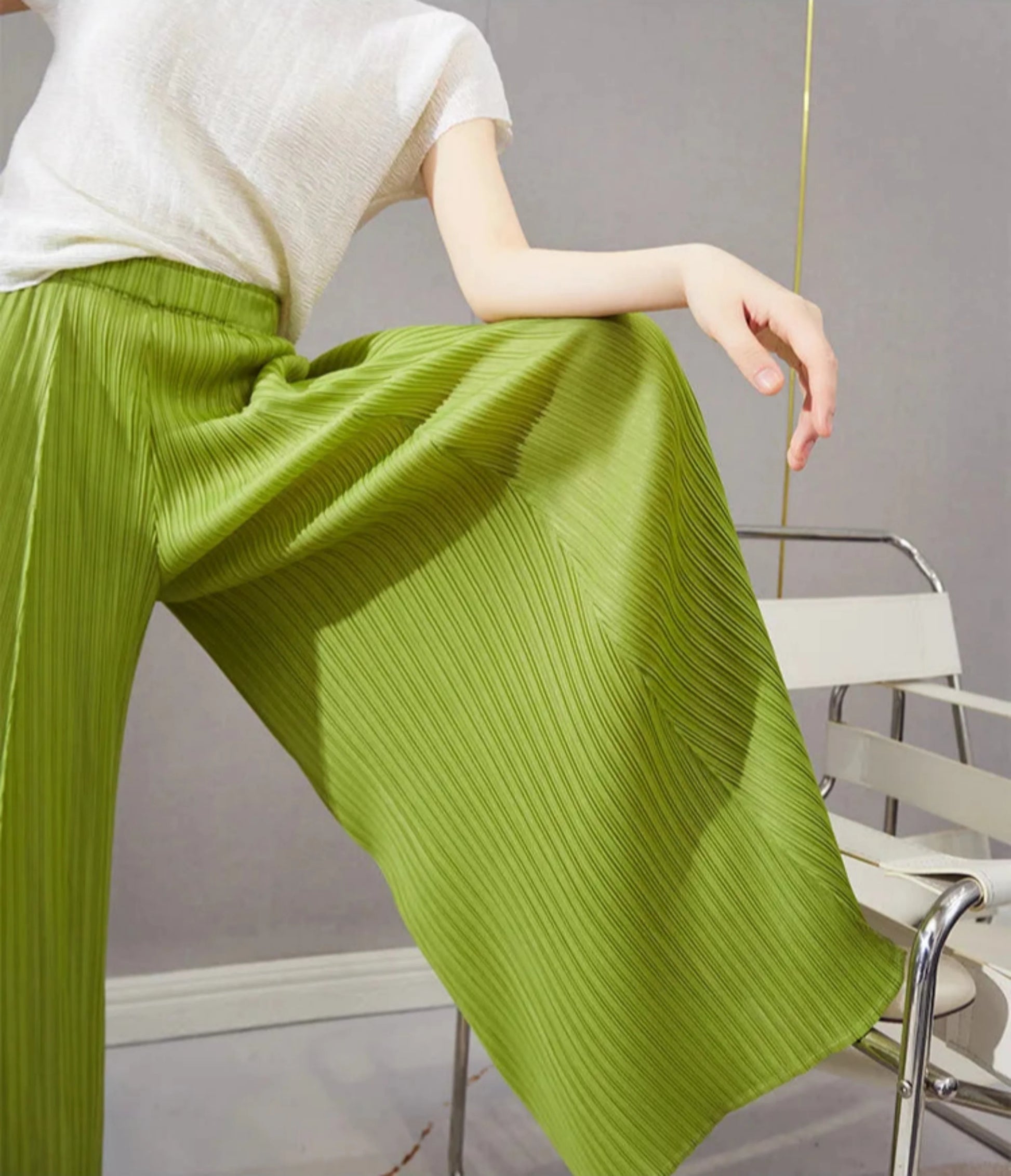 High-waisted wide-leg trousers made with authentic Japanese pleats. Features a pull-on elastic waistband and flowing silhouette. Lightweight, stretchy, and wrinkle-free—perfect for everyday wear, date nights, or formal occasions.