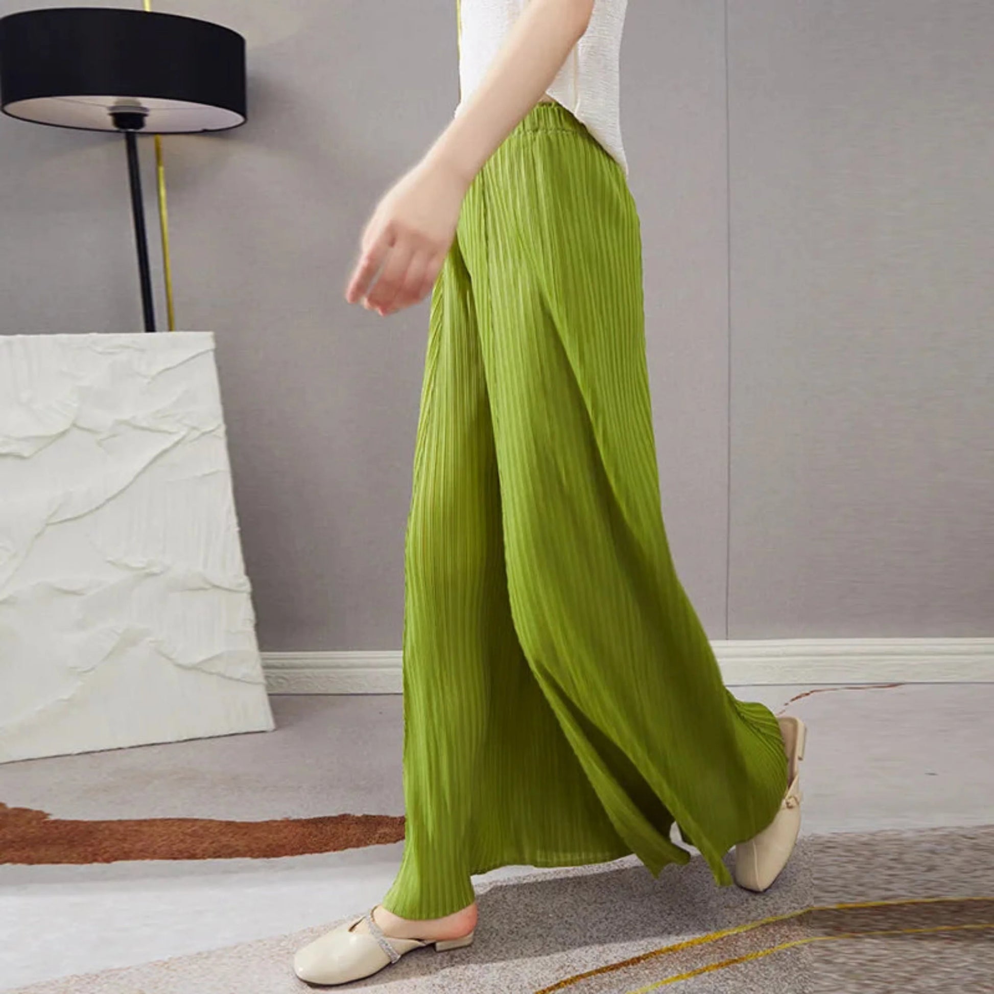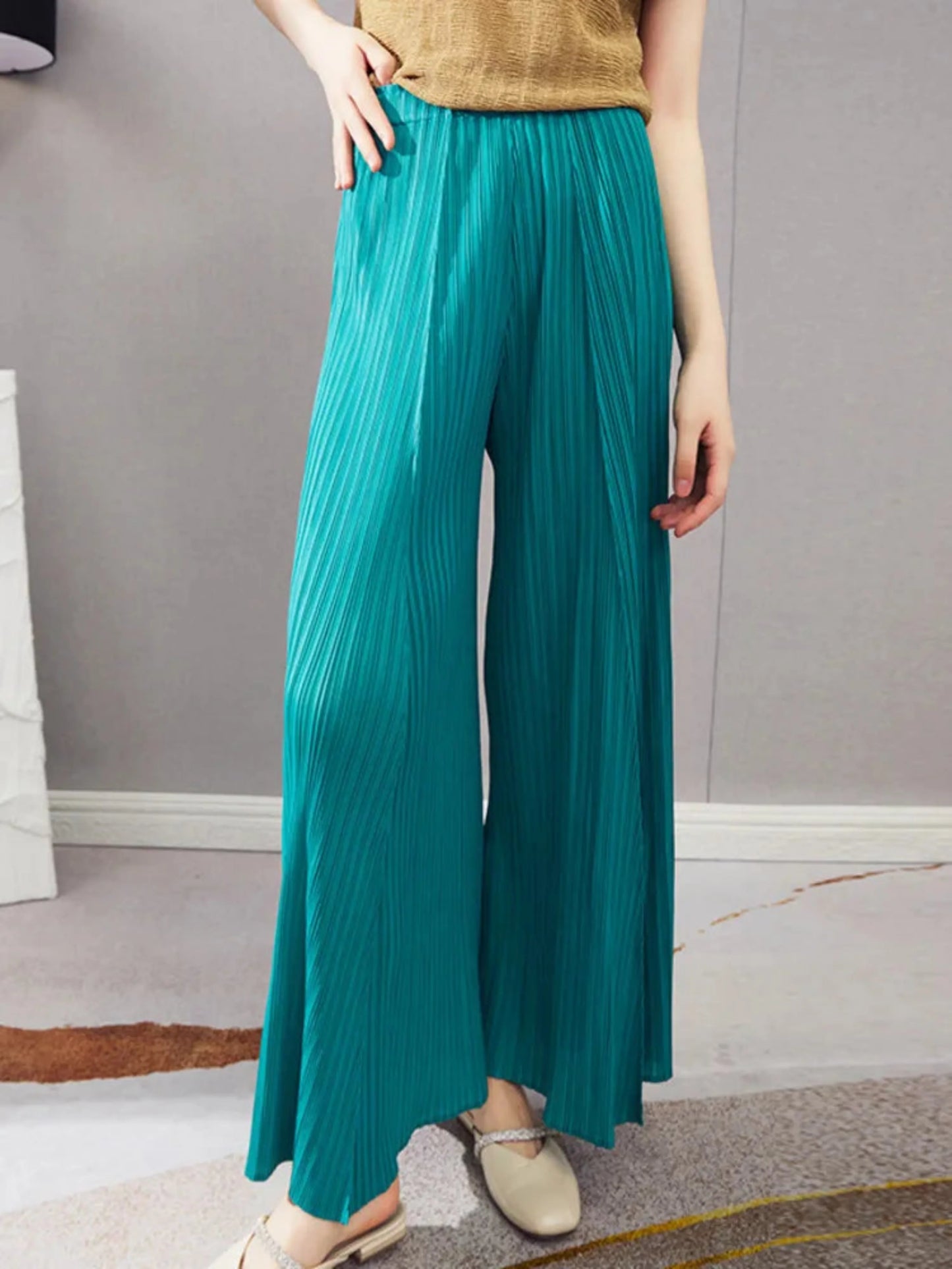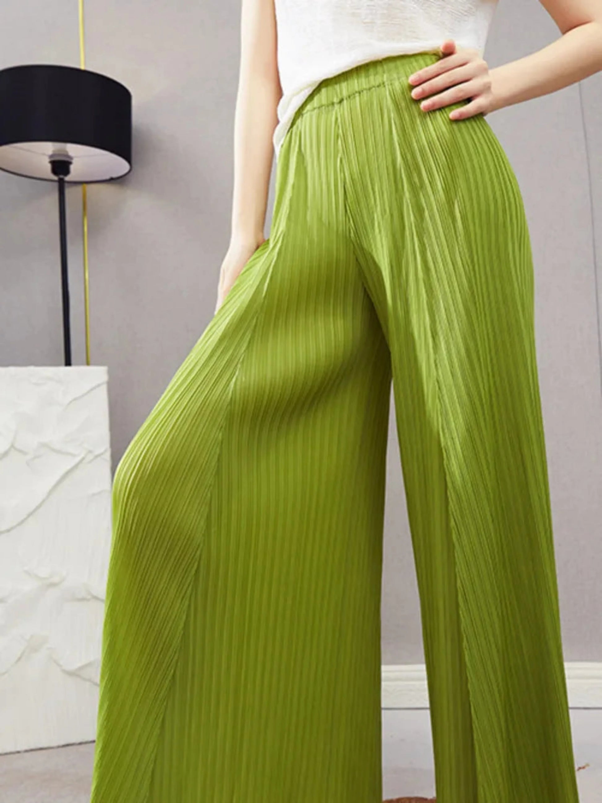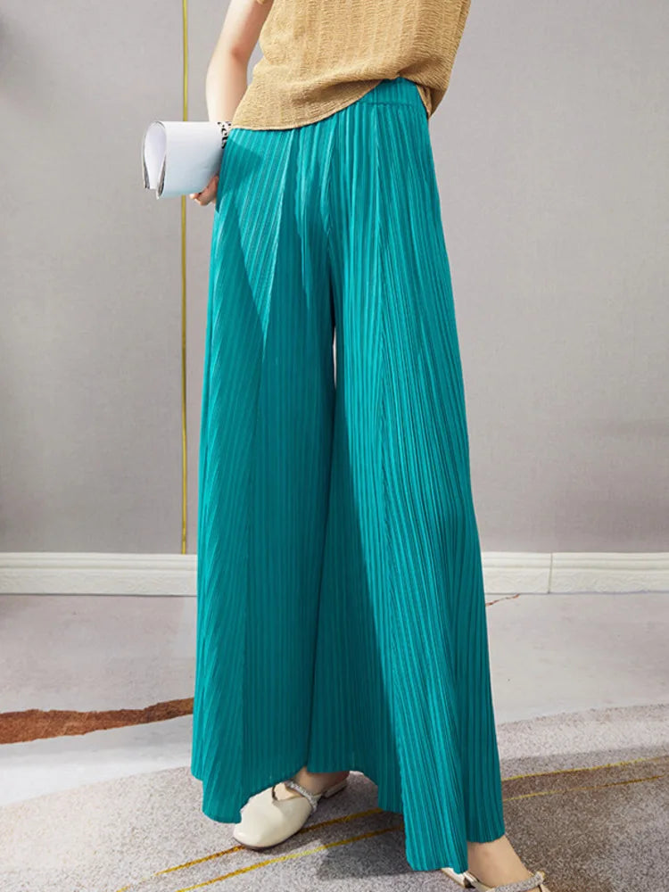 High-waisted wide-leg trousers made with authentic Japanese pleats. Features a pull-on elastic waistband and flowing silhouette. Lightweight, stretchy, and wrinkle-free—perfect for everyday wear, date nights, or formal occasions.