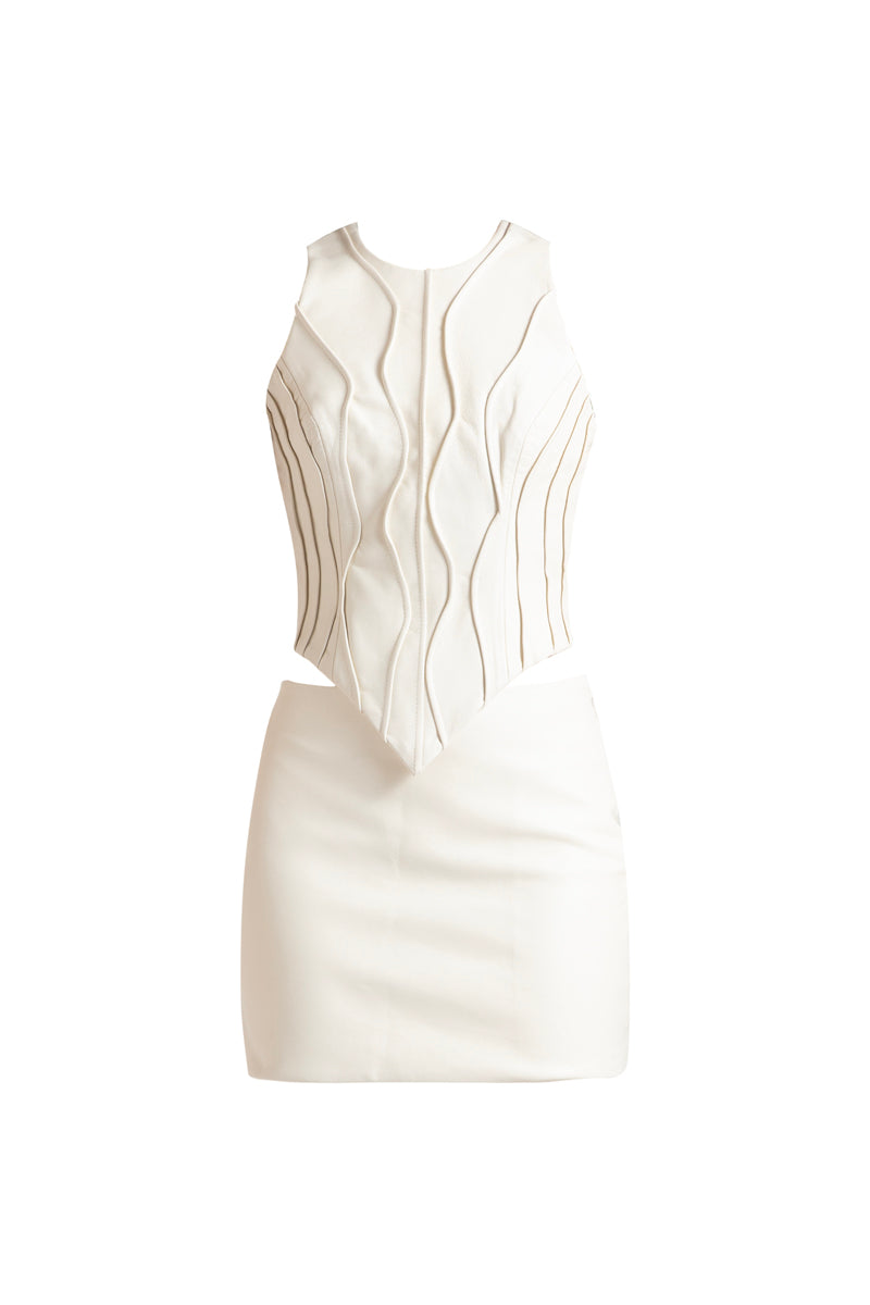 An off-white leather set featuring a surface manipulation top and a mini skirt, designed as a coordinated two-piece ensemble.