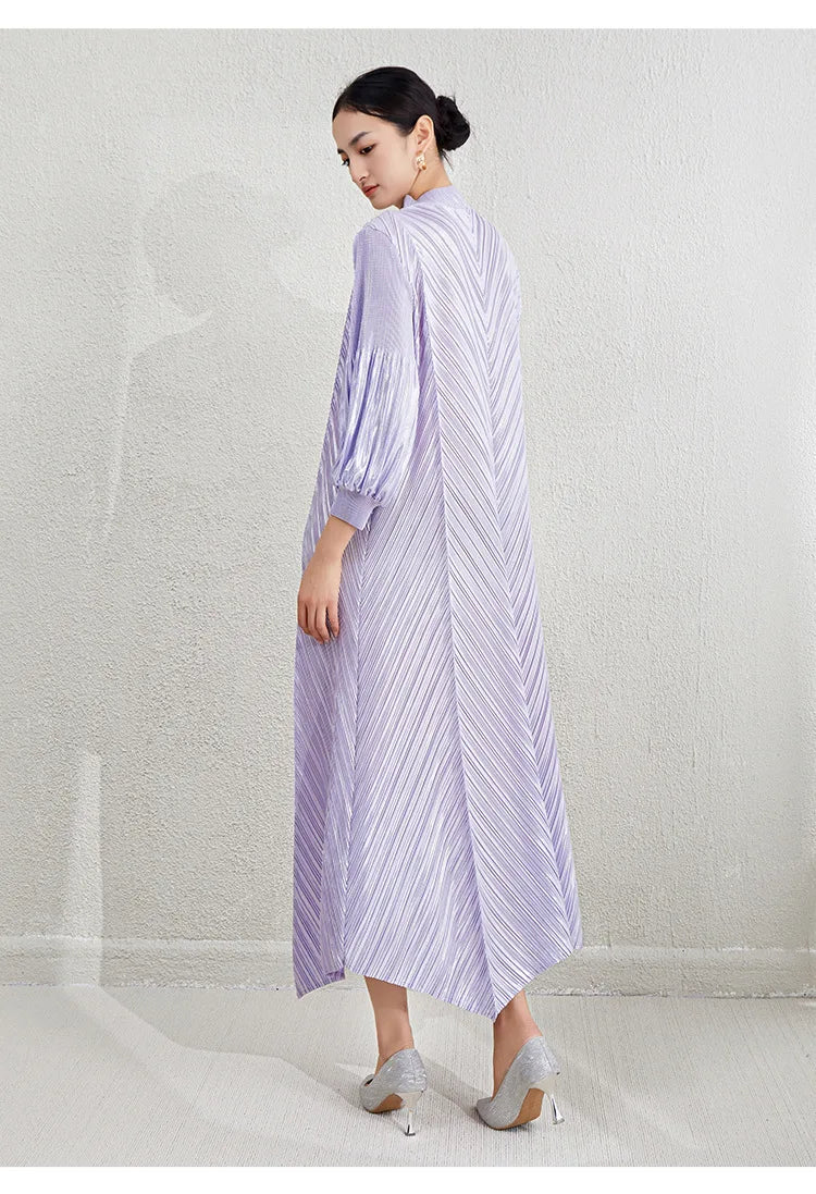 This metallic pleated midi dress offers a sophisticated, modern look with its mock neck and bishop sleeves. Perfect for formal events or evening occasions, it combines luxury and elegance.