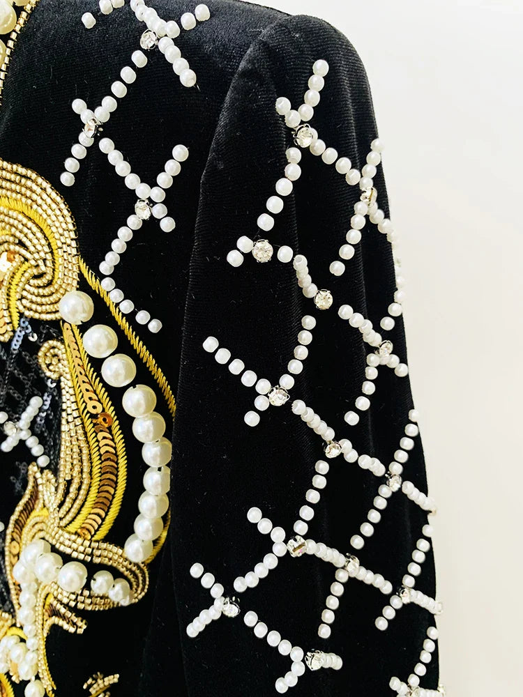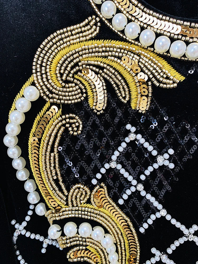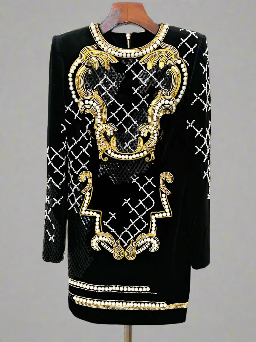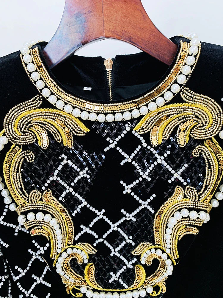 A masterpiece of luxury, this velvet mini dress is adorned with hand-stitched pearls and beads, creating an elegant and sophisticated design.