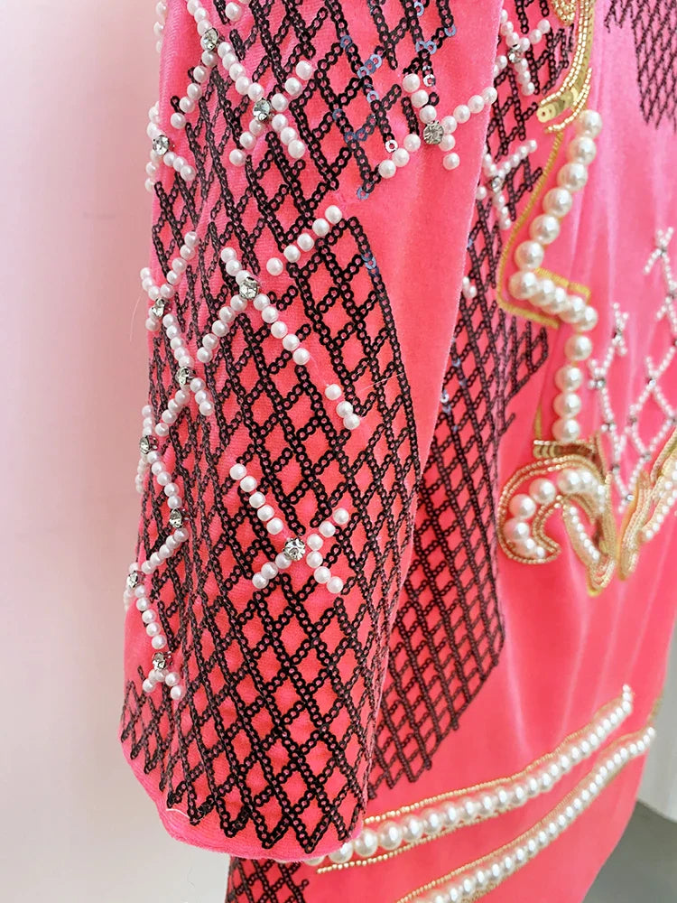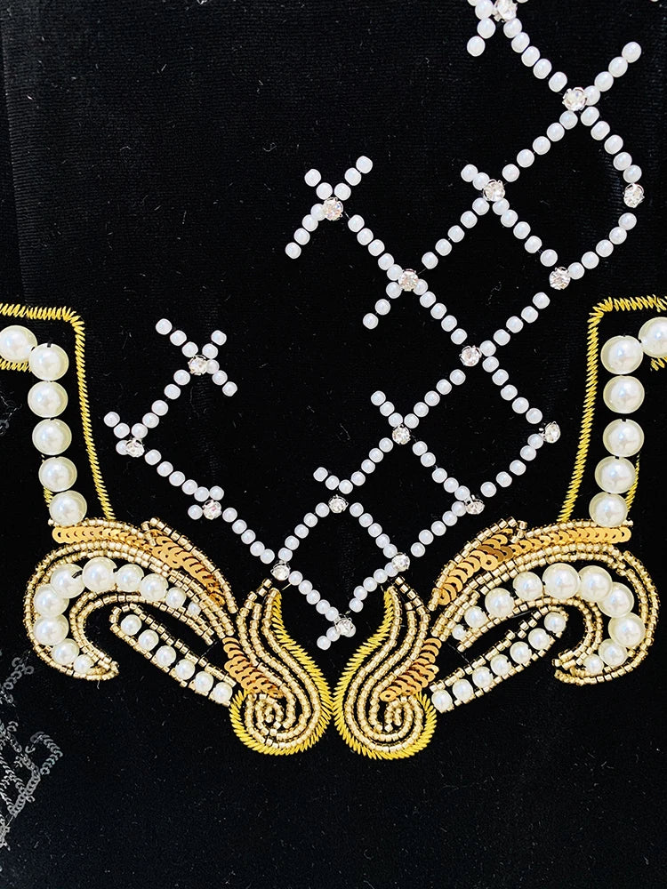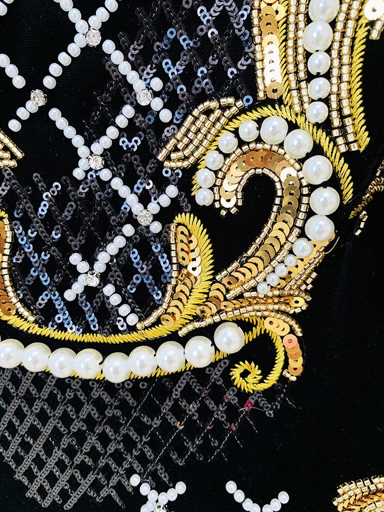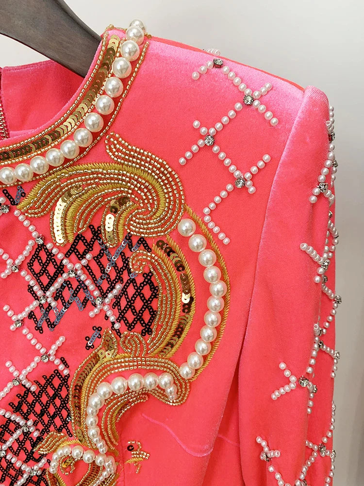 A masterpiece of luxury, this velvet mini dress is adorned with hand-stitched pearls and beads, creating an elegant and sophisticated design.