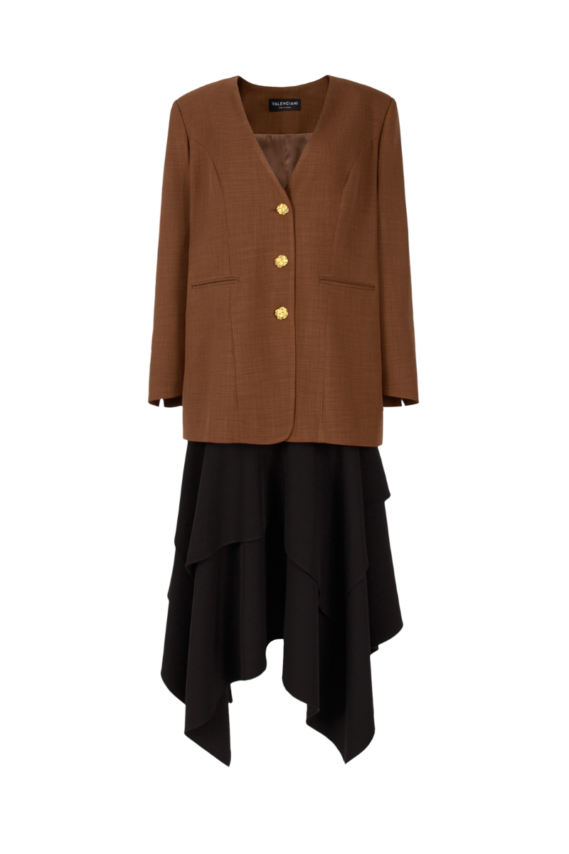 Exude luxury with this set featuring a loose-fit blazer with a V-neck and adorned with three metal buttons. The hip-length blazer is perfectly paired with a skirt featuring a 2 layered asymmetrical hem.