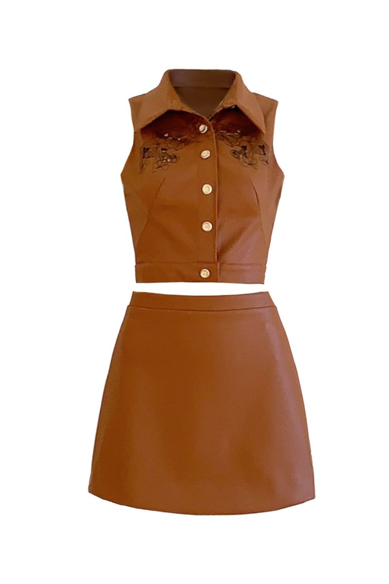 Leather top and short skirt set with exclusive laser cut and engraved motifs