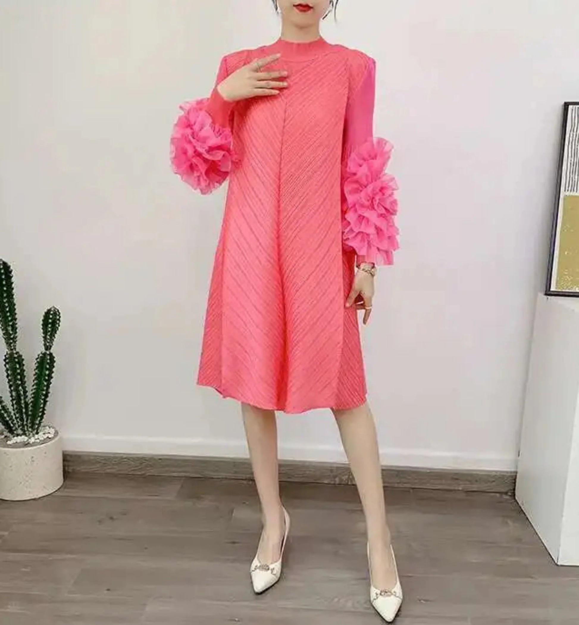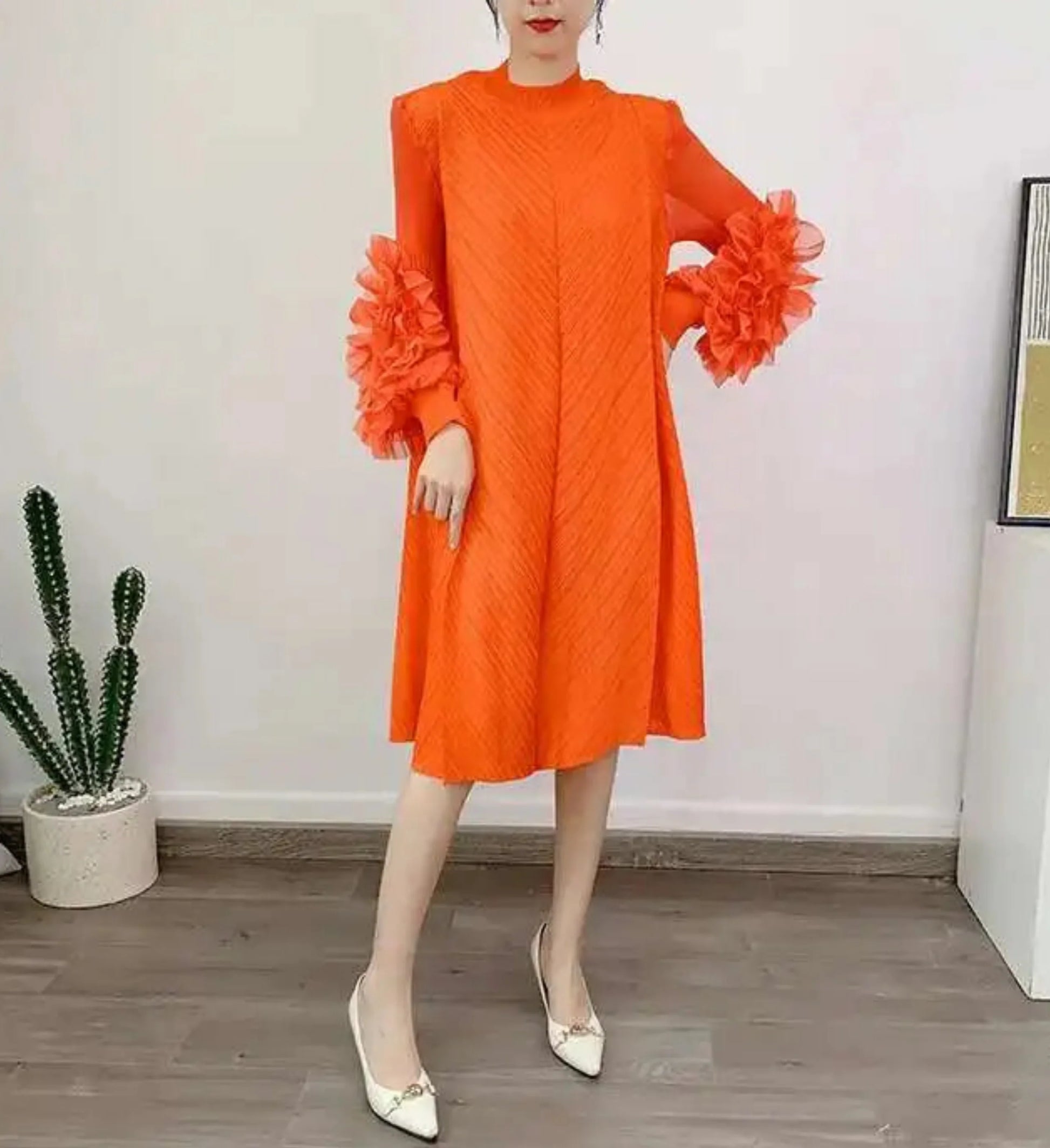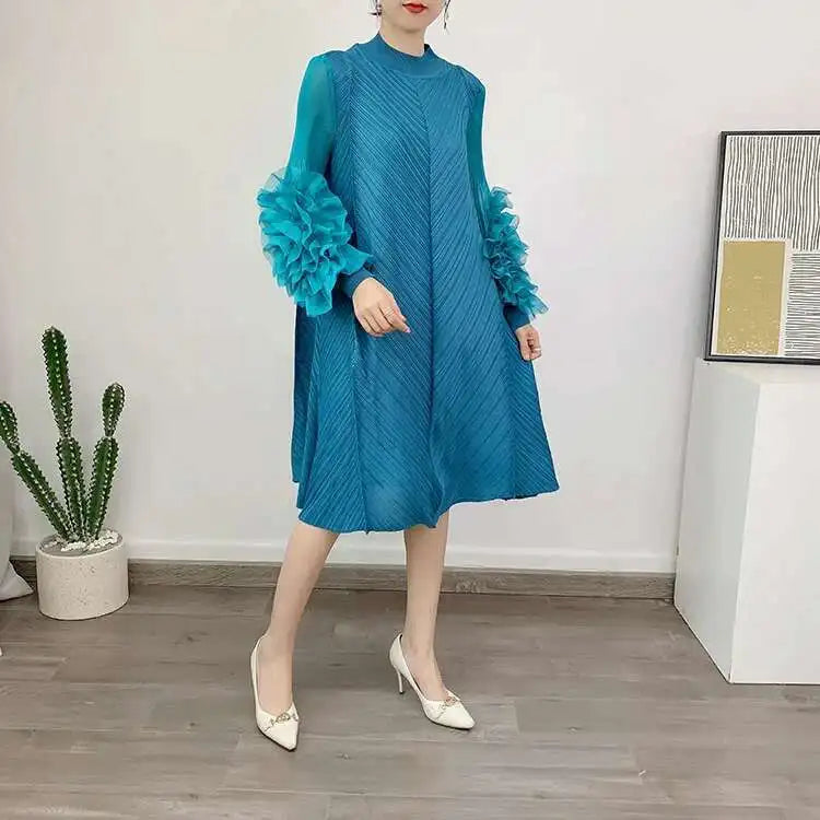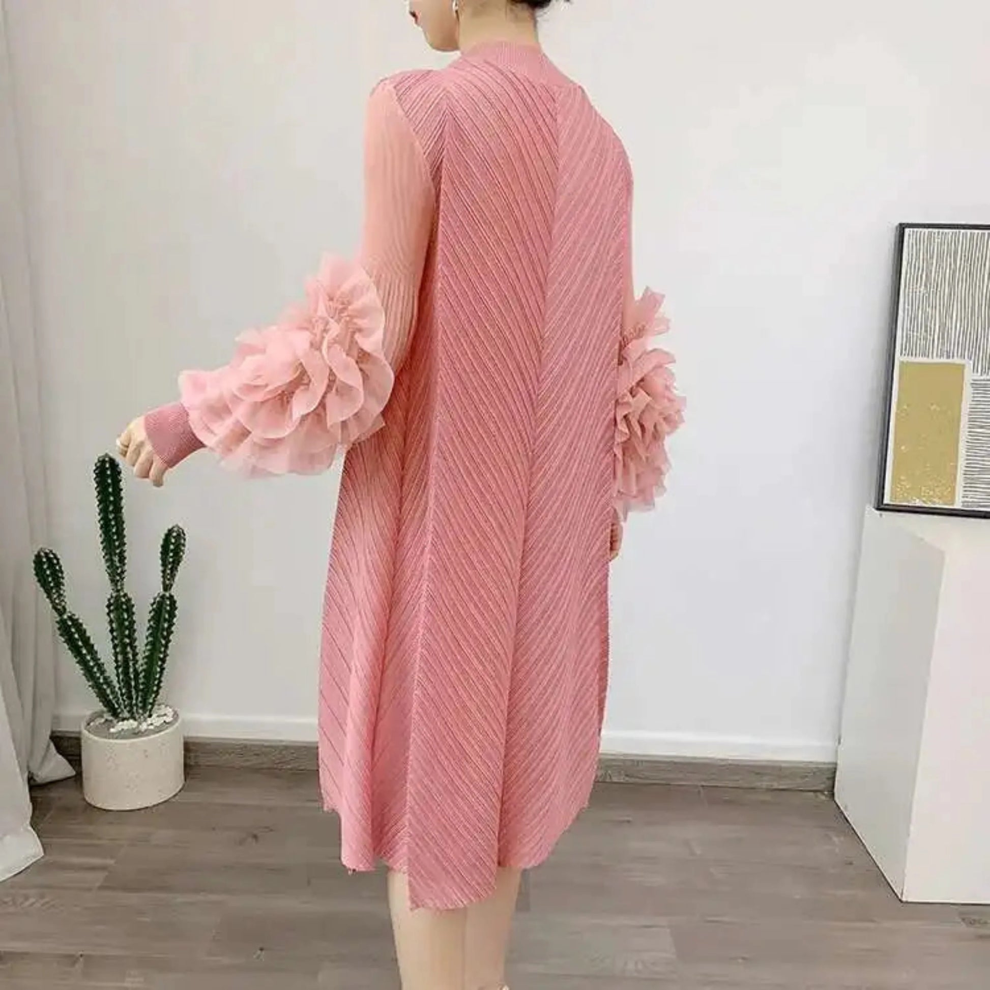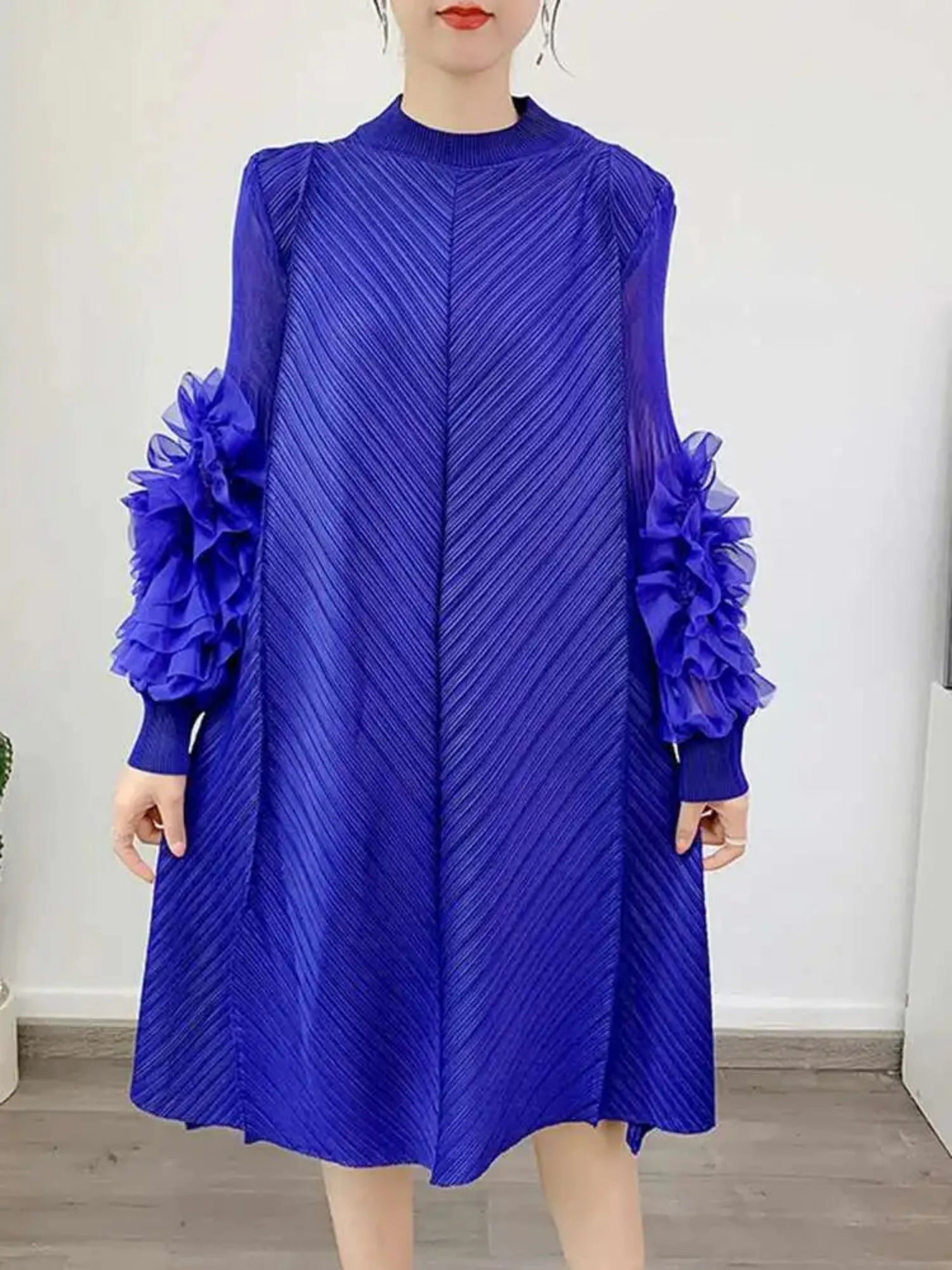 A petite-friendly dress featuring Japanese pleats and floral ruffle sleeves. Above-the-knee length and loose-fit design provide comfort and ease, while stretchy fabric ensures movement.