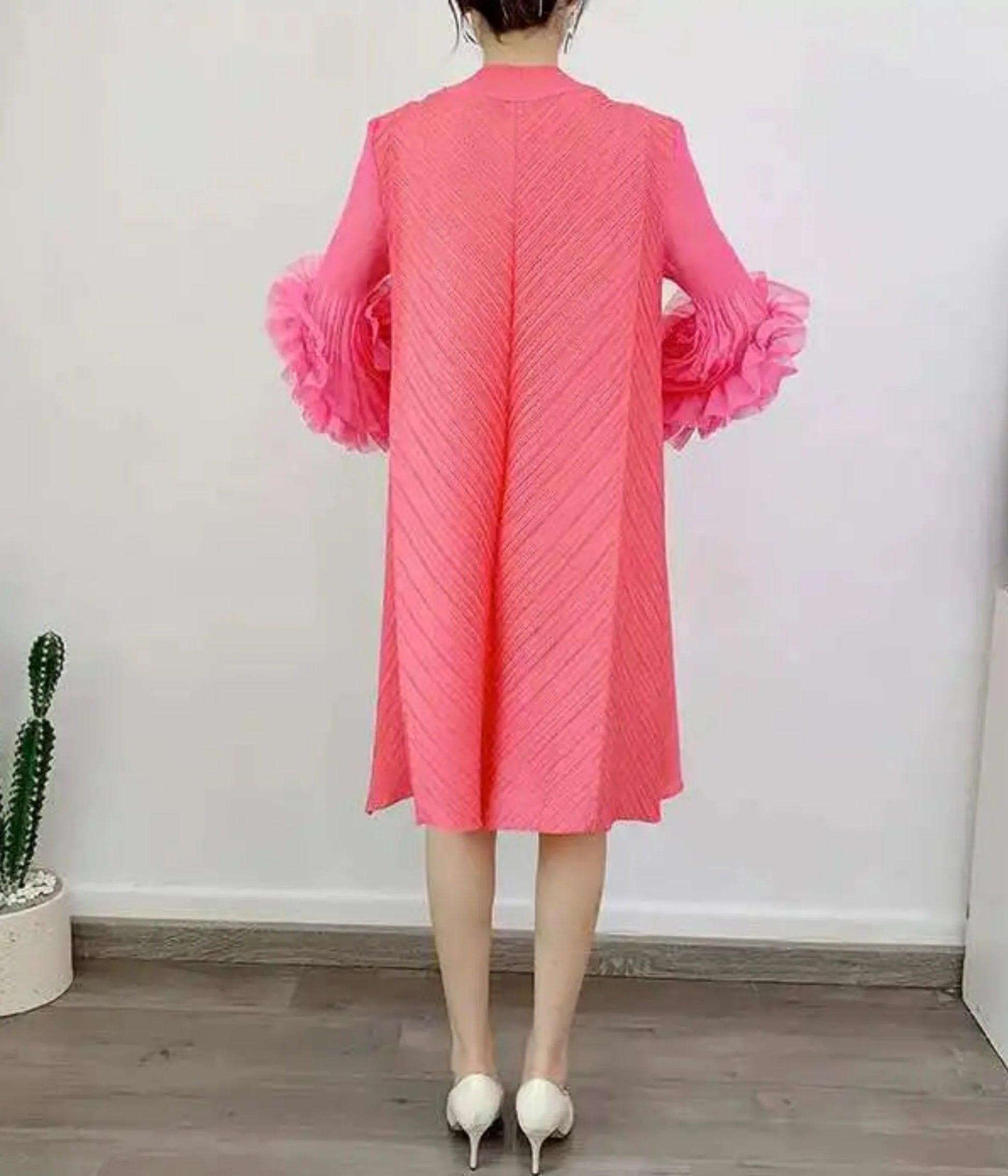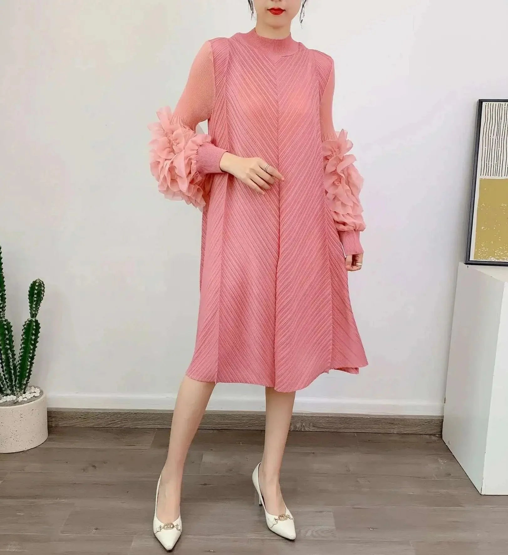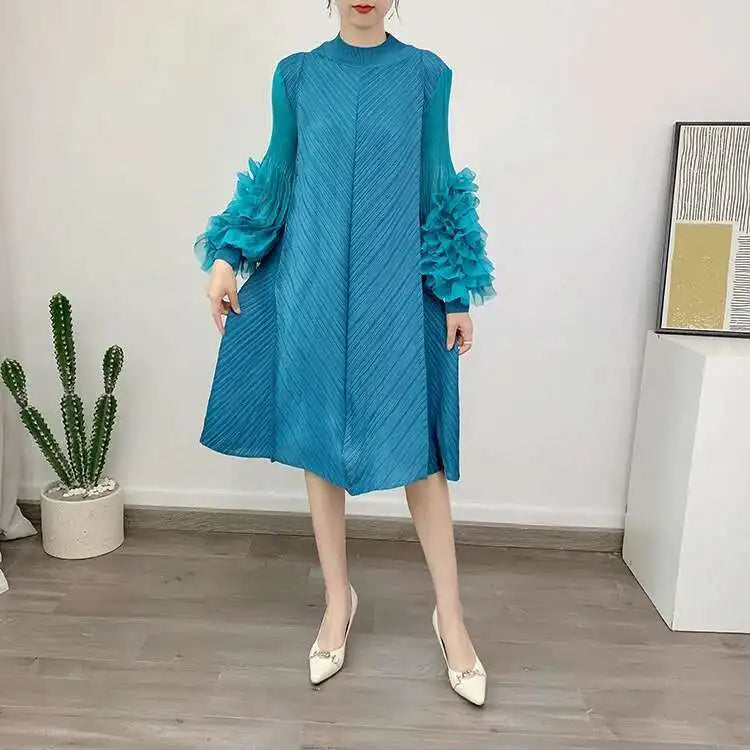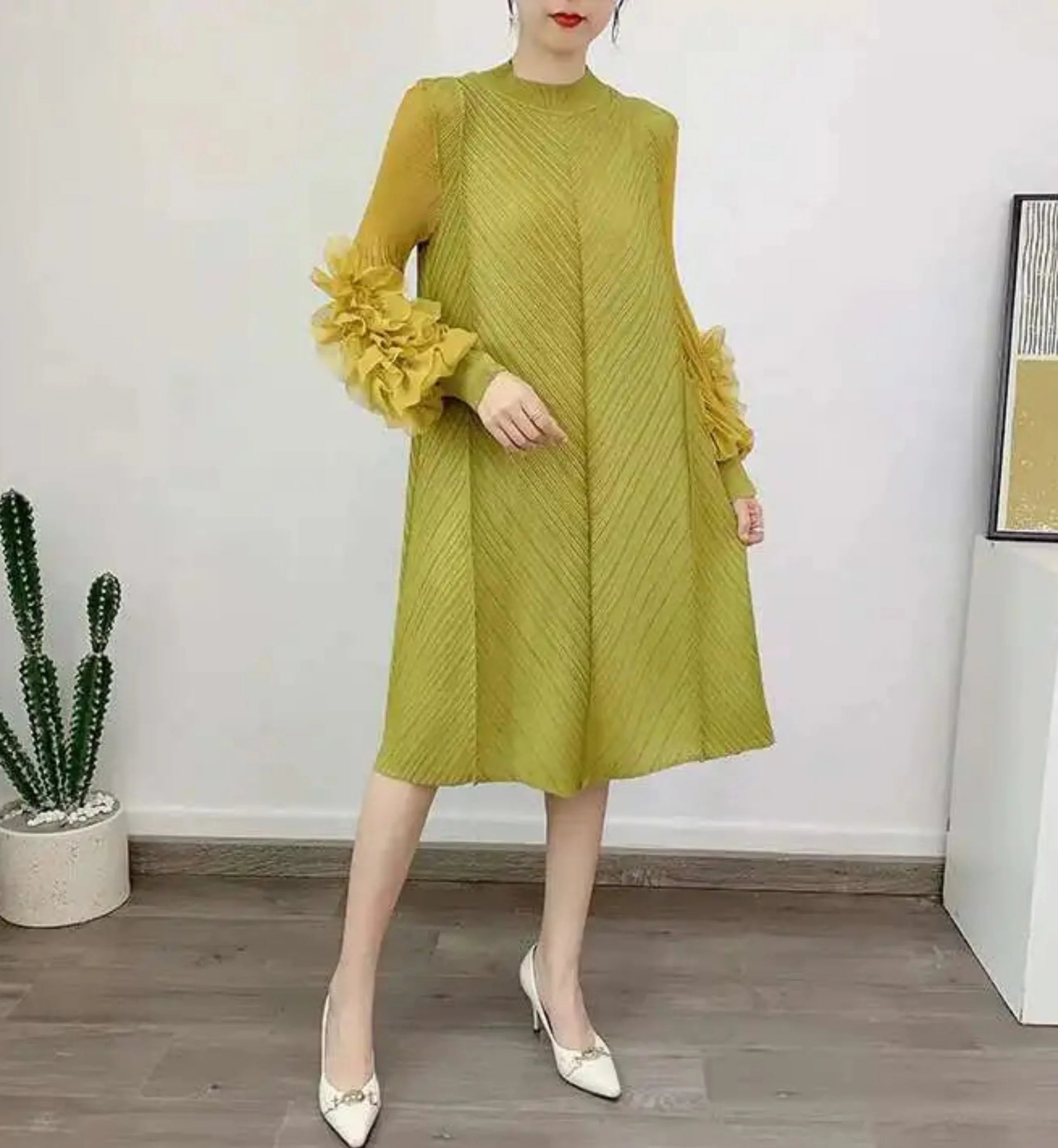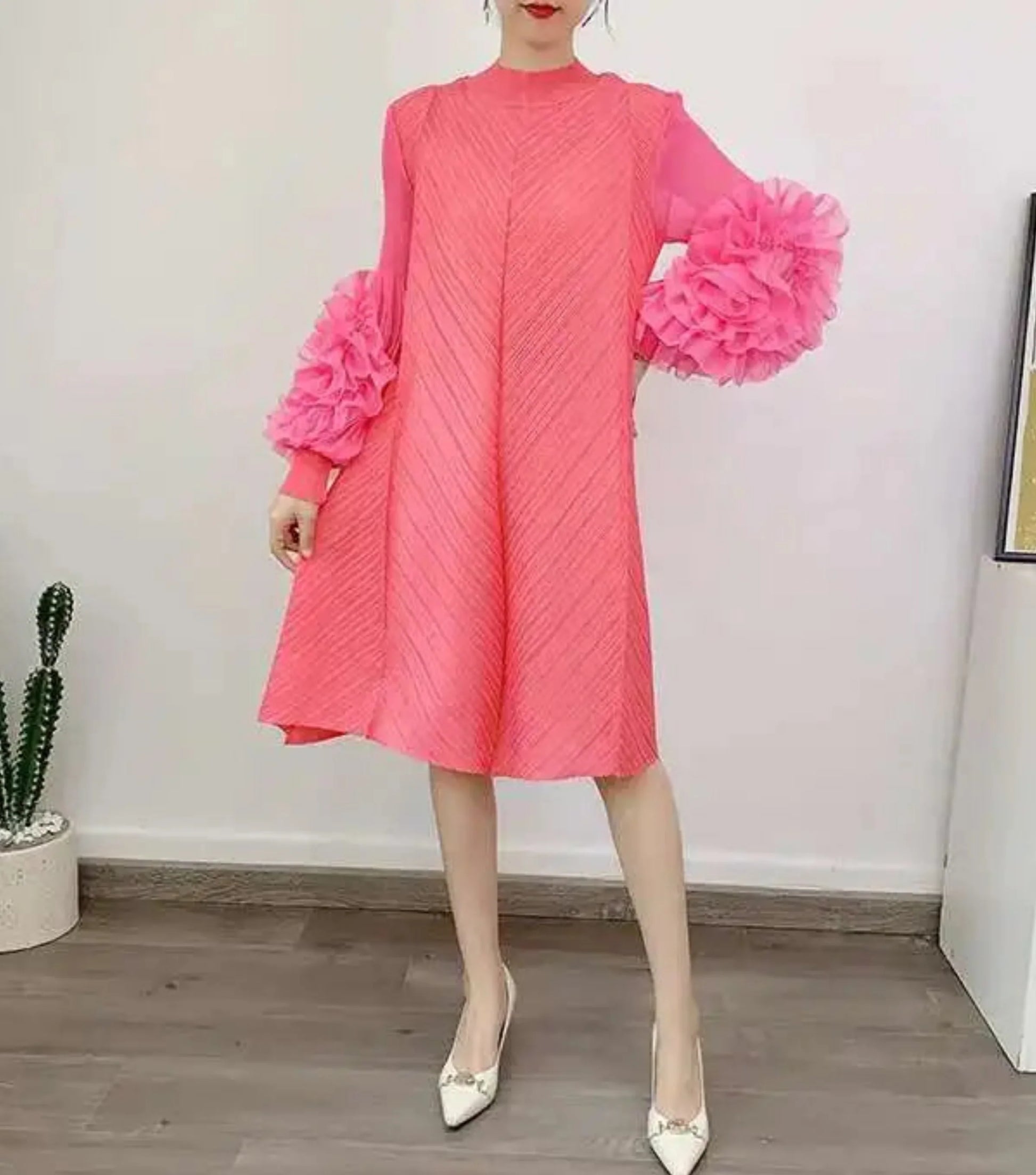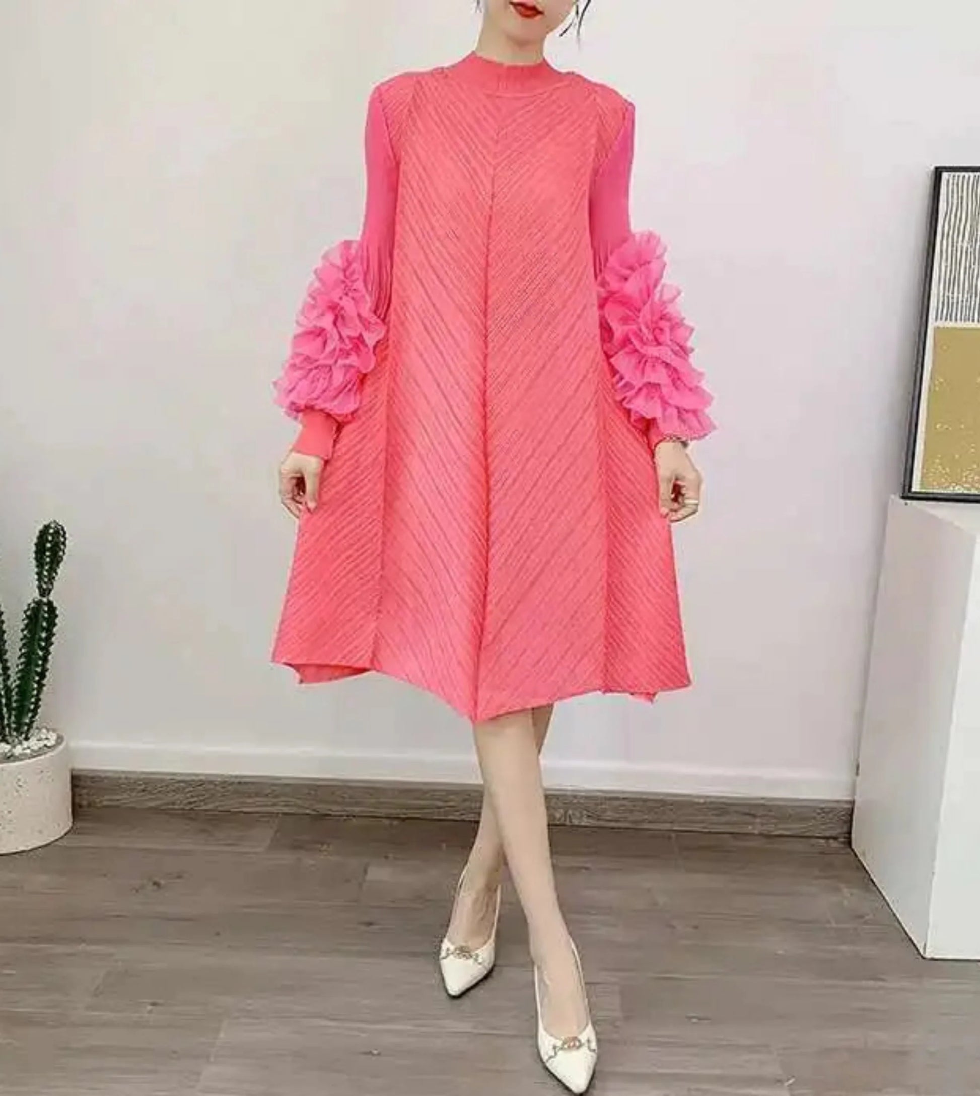 A petite-friendly dress featuring Japanese pleats and floral ruffle sleeves. Above-the-knee length and loose-fit design provide comfort and ease, while stretchy fabric ensures movement.