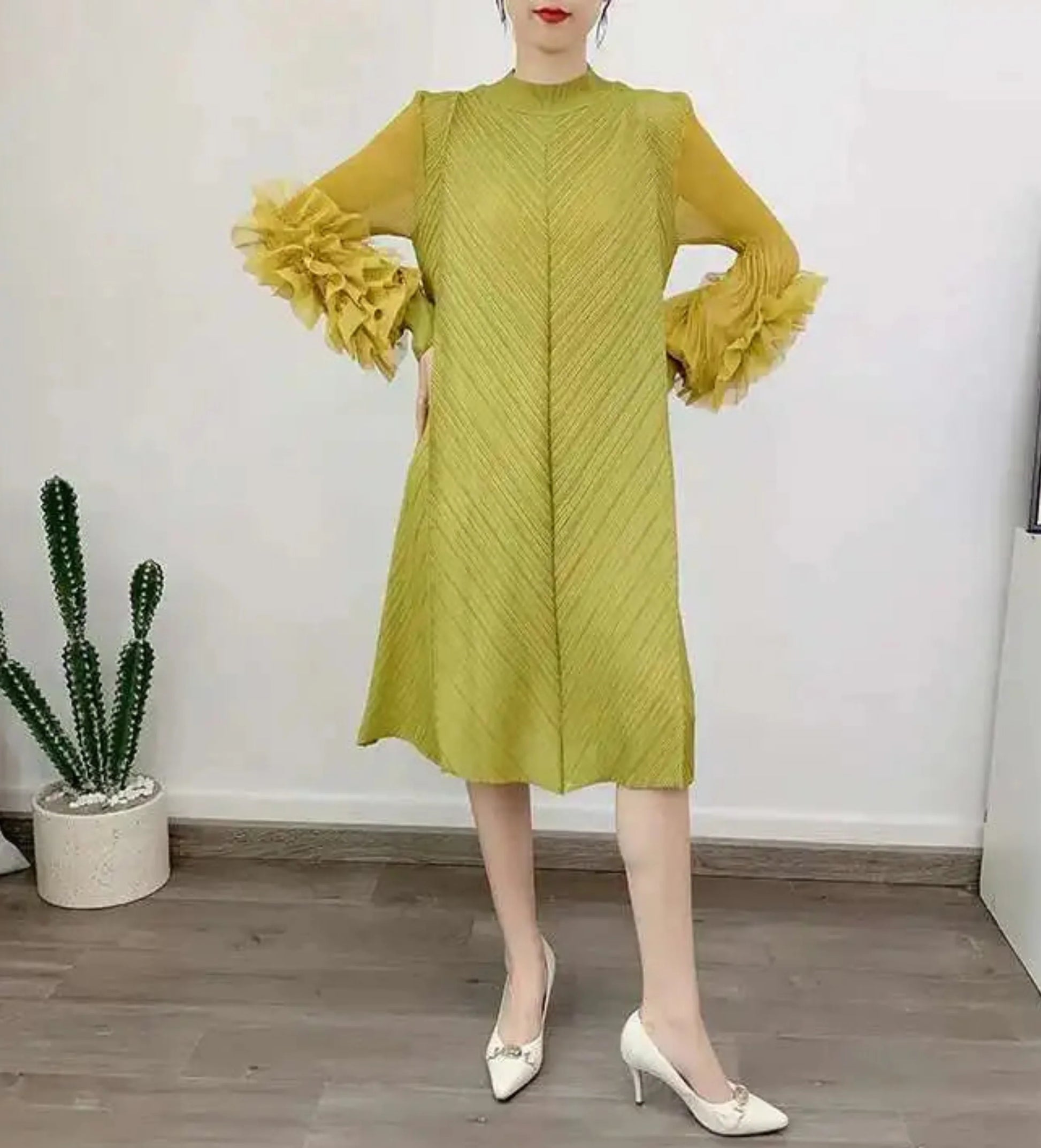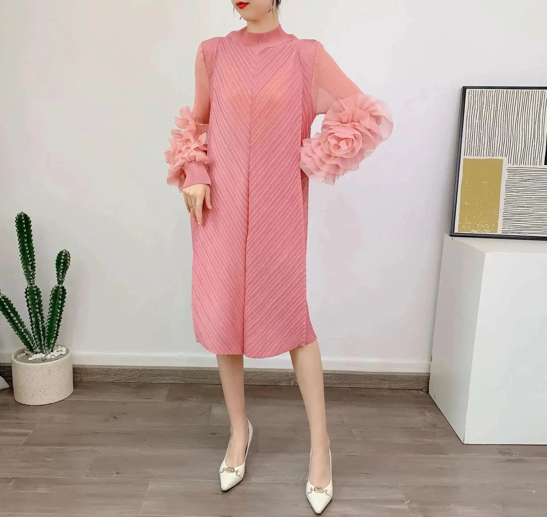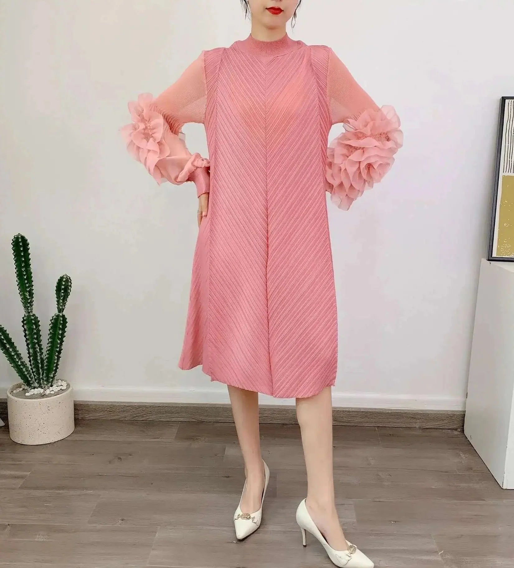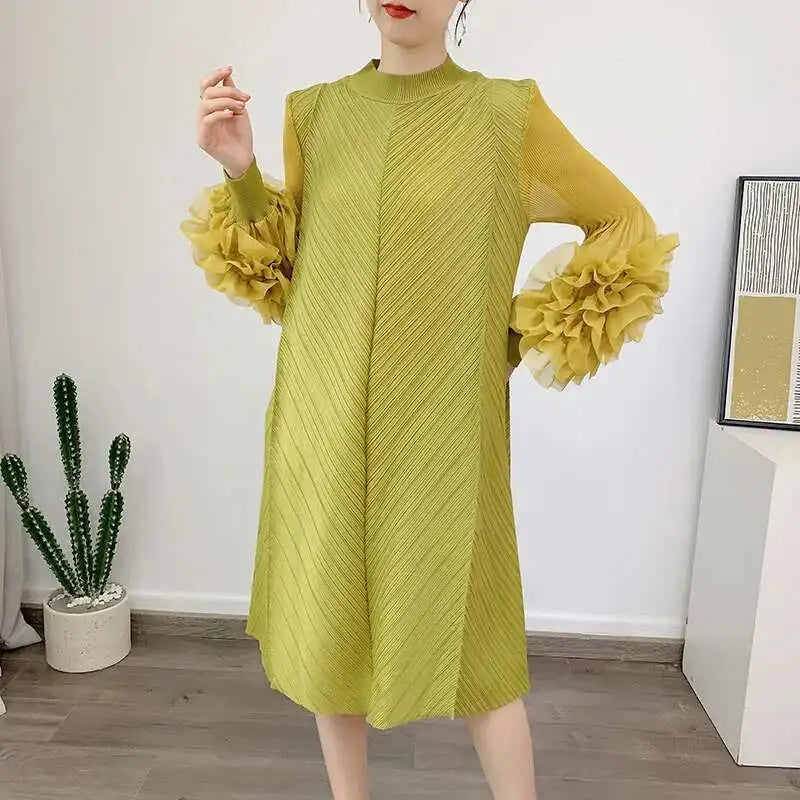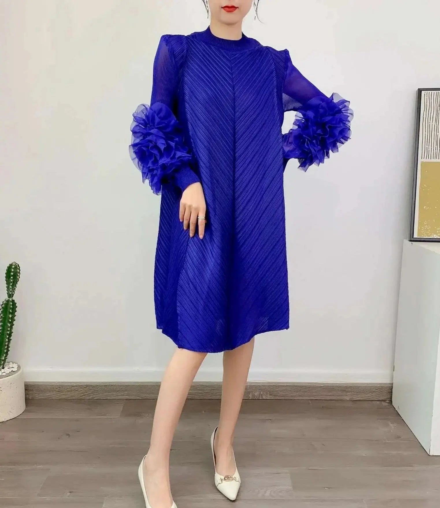 A petite-friendly dress featuring Japanese pleats and floral ruffle sleeves. Above-the-knee length and loose-fit design provide comfort and ease, while stretchy fabric ensures movement.