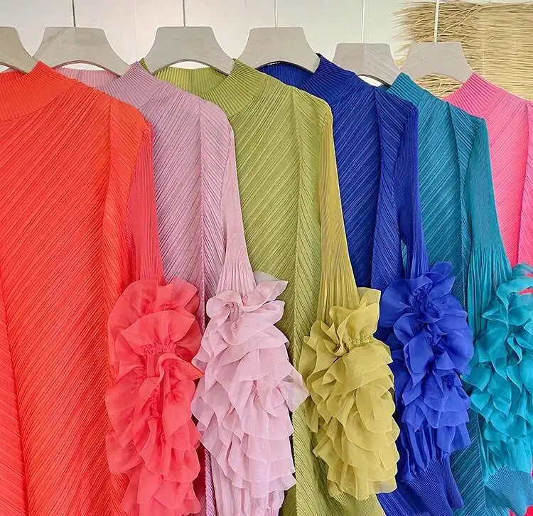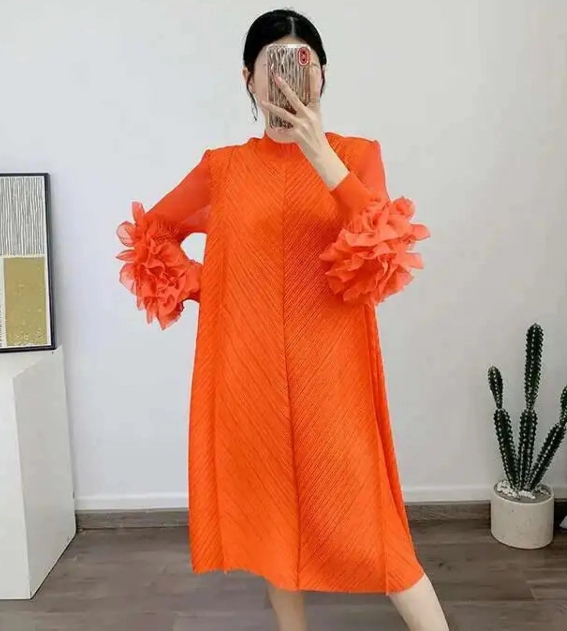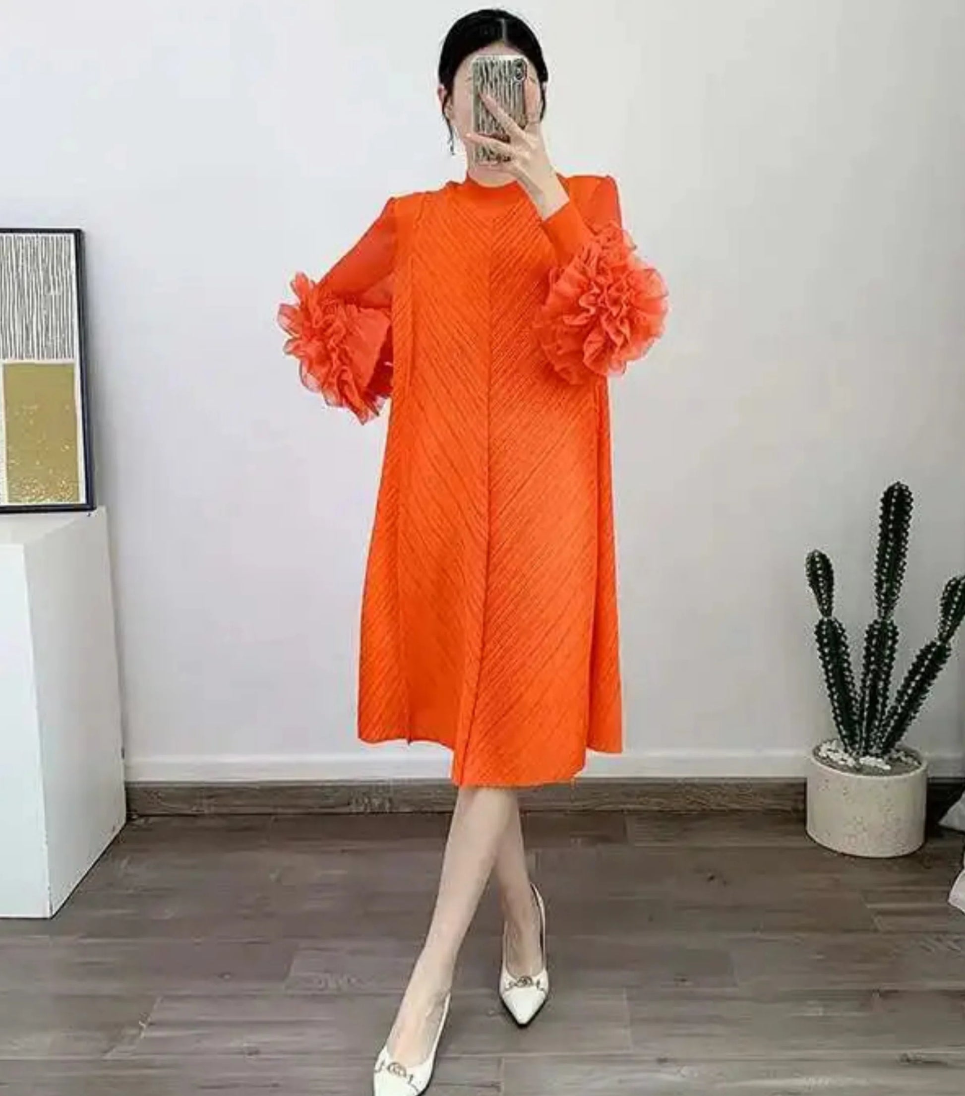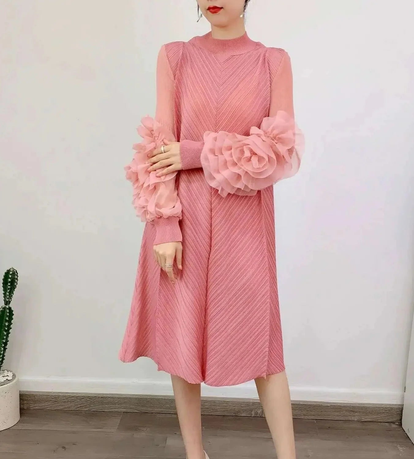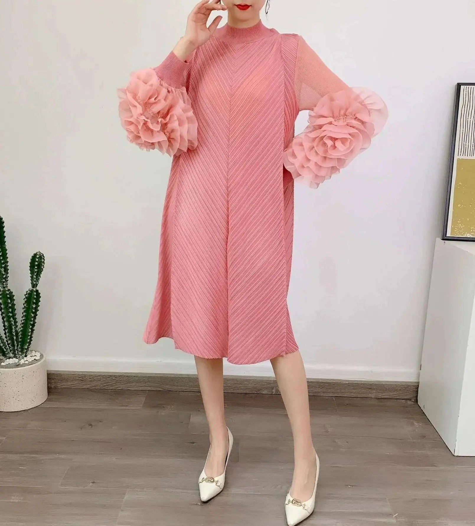 A petite-friendly dress featuring Japanese pleats and floral ruffle sleeves. Above-the-knee length and loose-fit design provide comfort and ease, while stretchy fabric ensures movement.