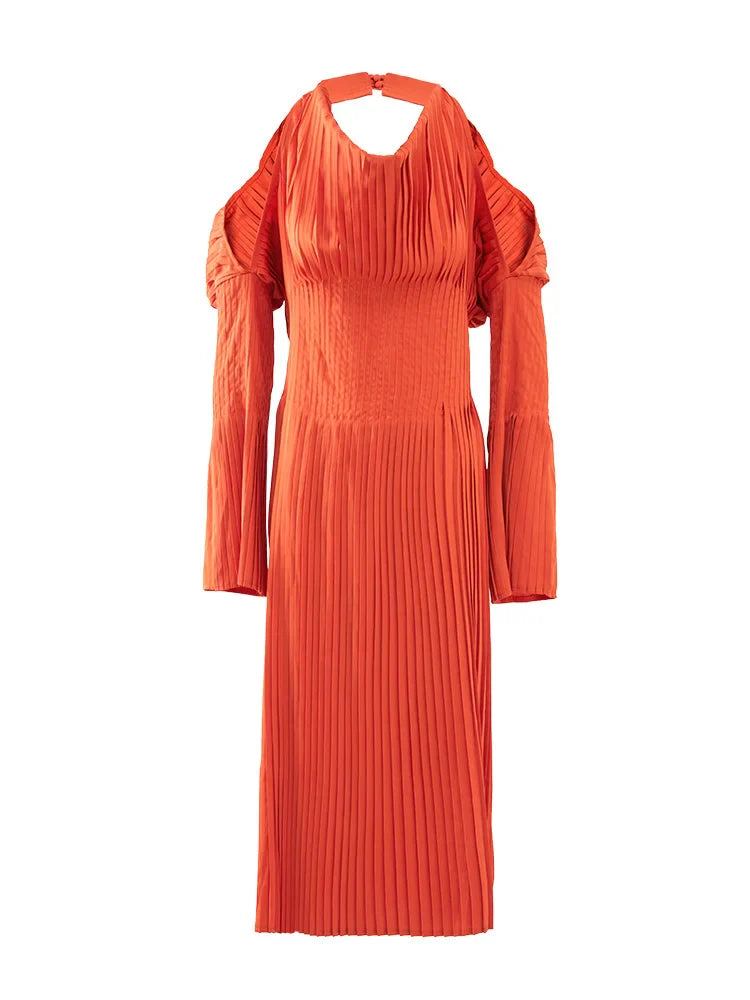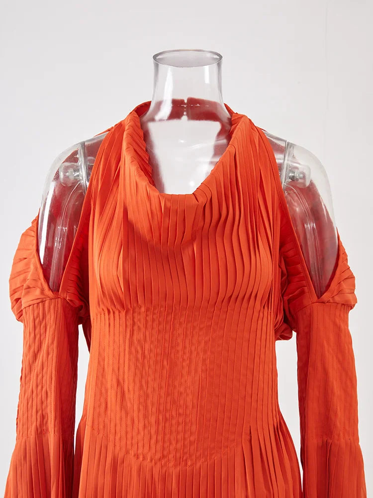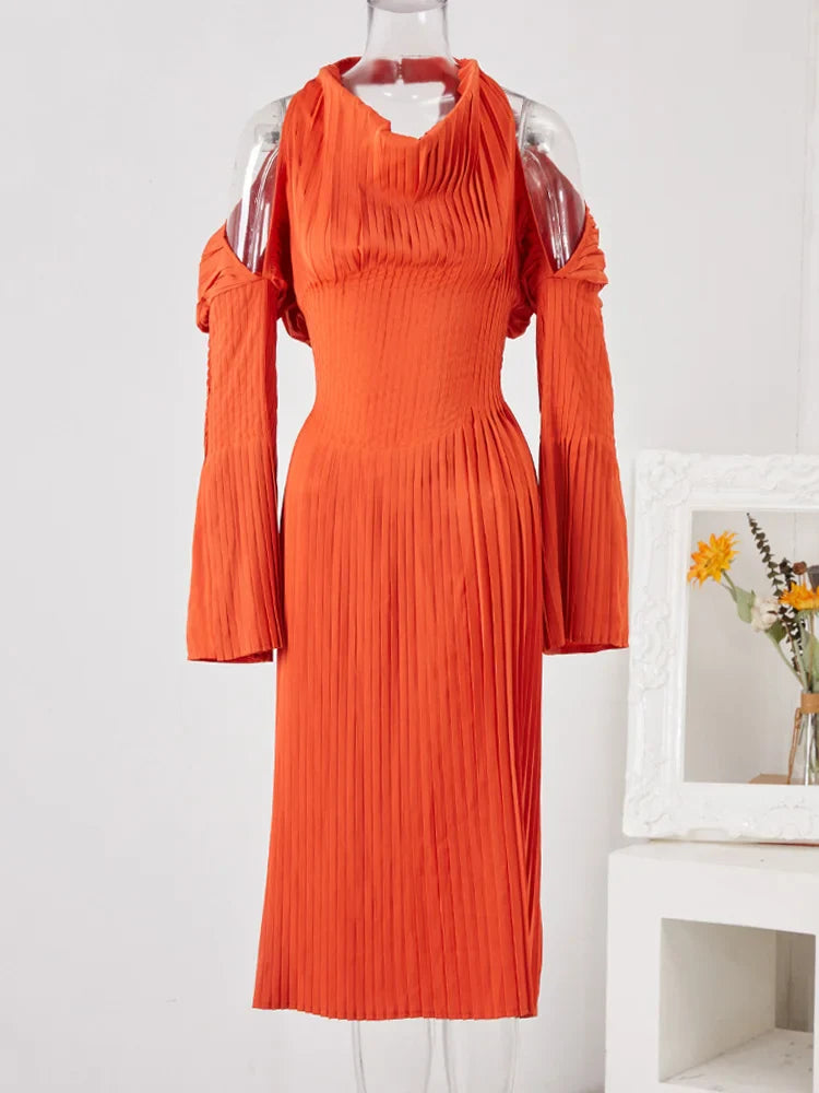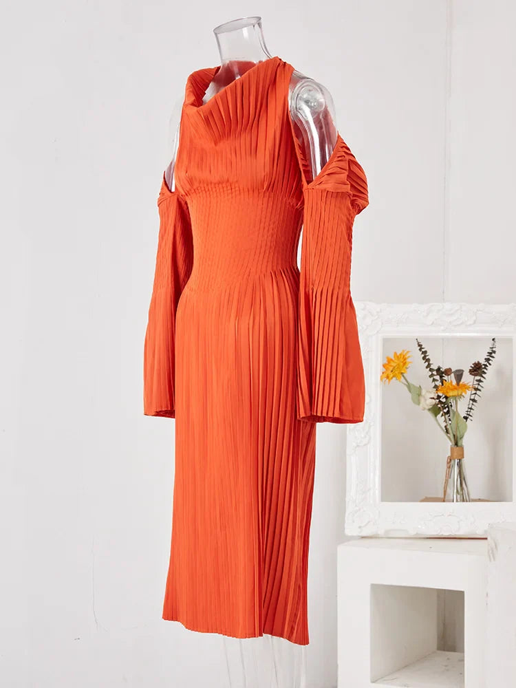Bold and elegant. This luxurious orange dress features chunky pleats, an off-shoulder halter top, and a flattering midi length for a flirty, feminine touch.