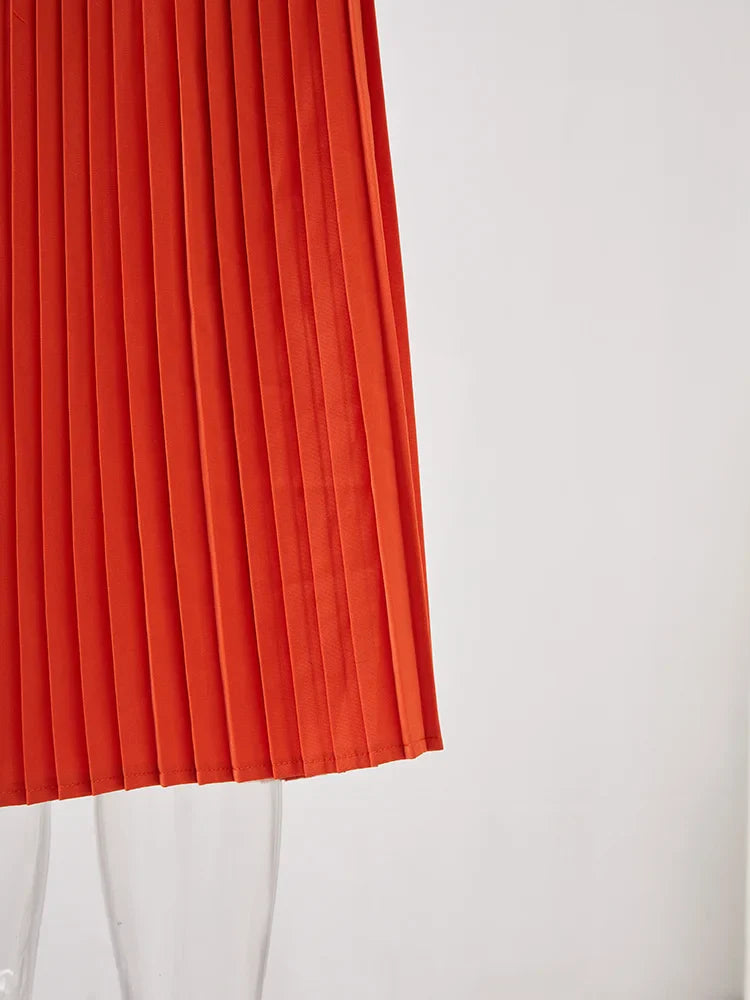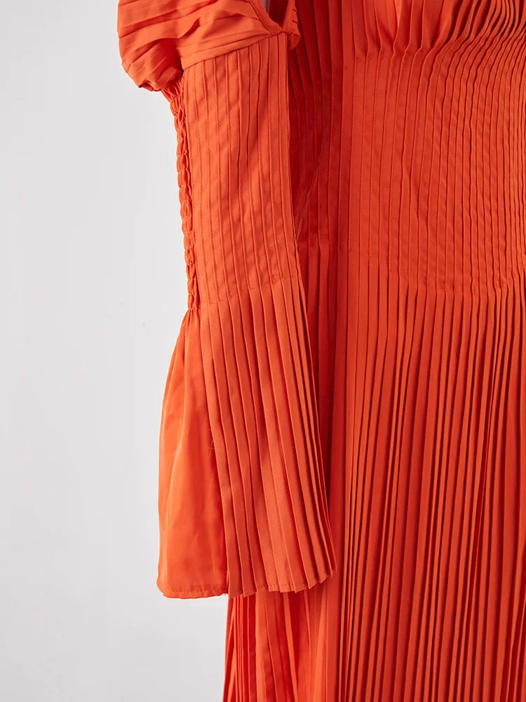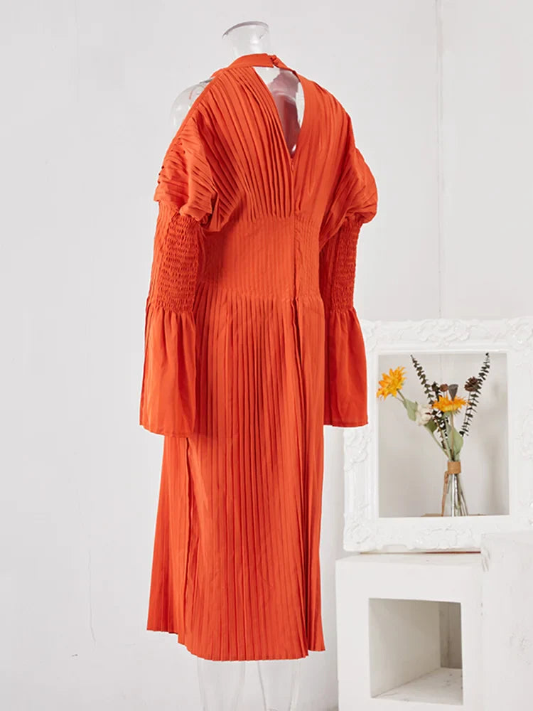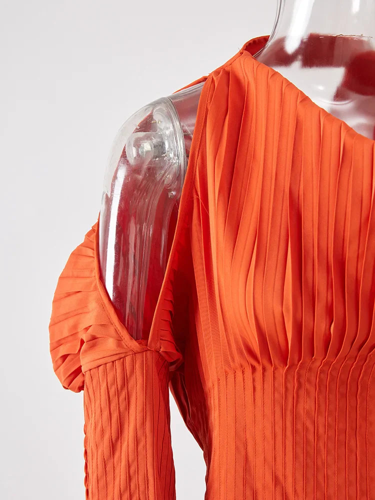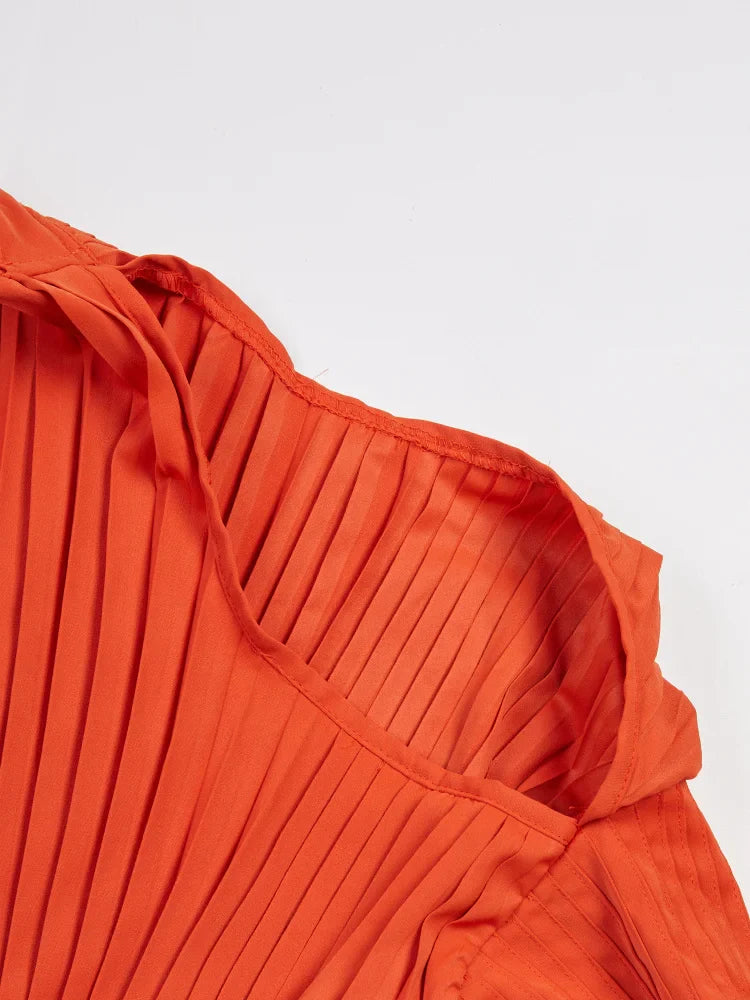 Bold and elegant. This luxurious orange dress features chunky pleats, an off-shoulder halter top, and a flattering midi length for a flirty, feminine touch.