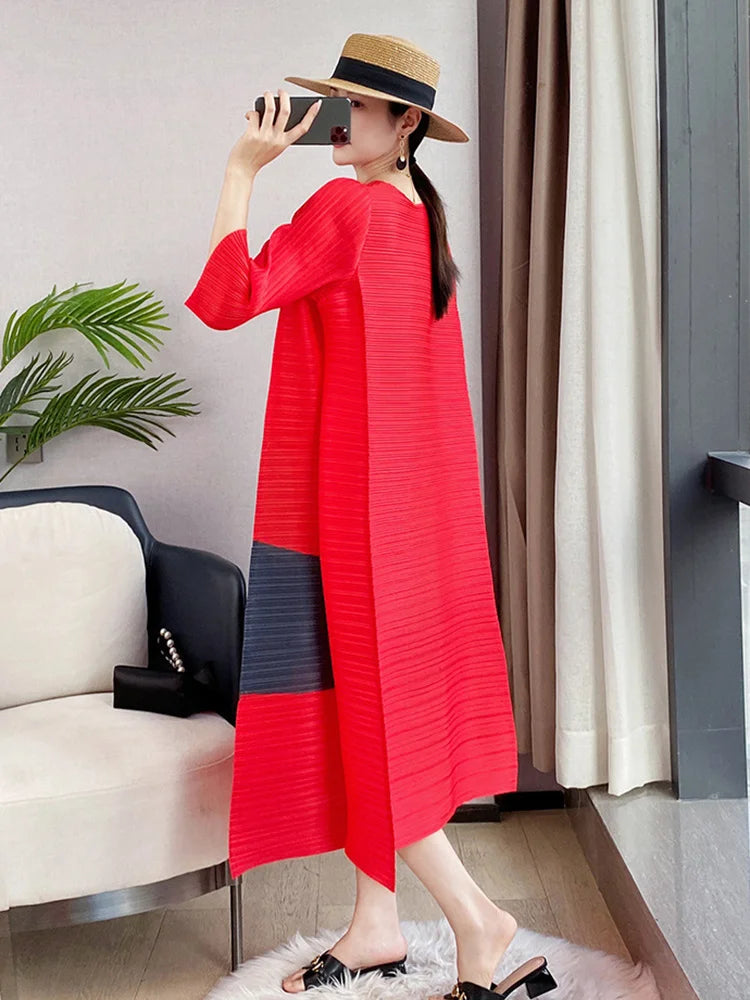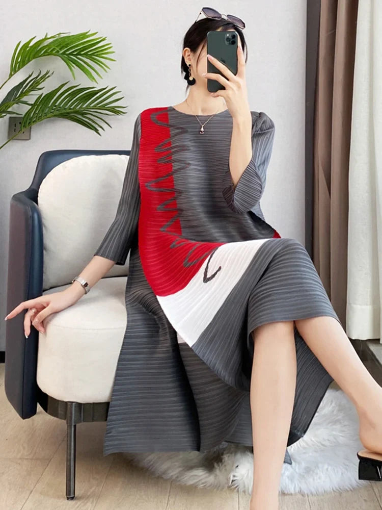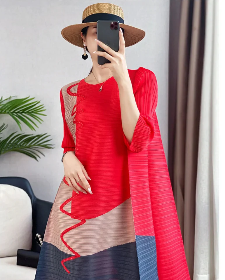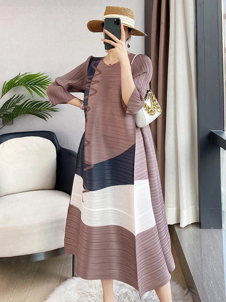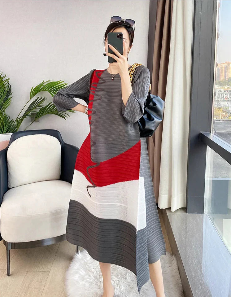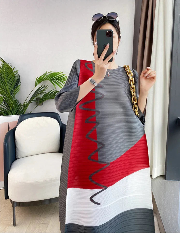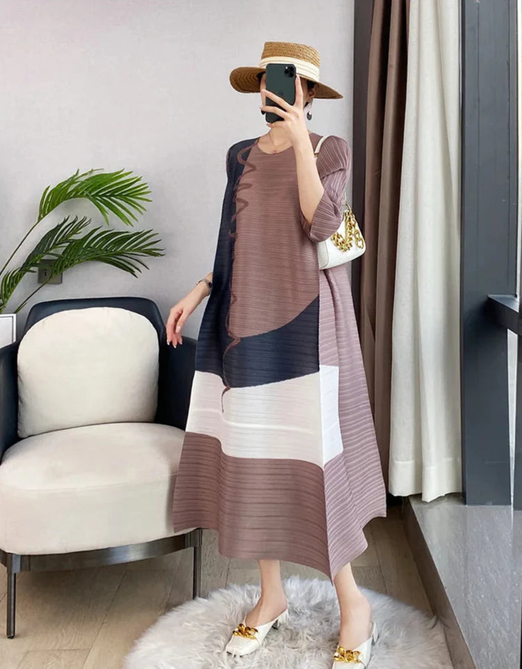 This dress embodies effortless elegance. With its premium pleats, 3/4 sleeves, and elegant patterns, it offers a relaxed silhouette that balances sophistication with comfort