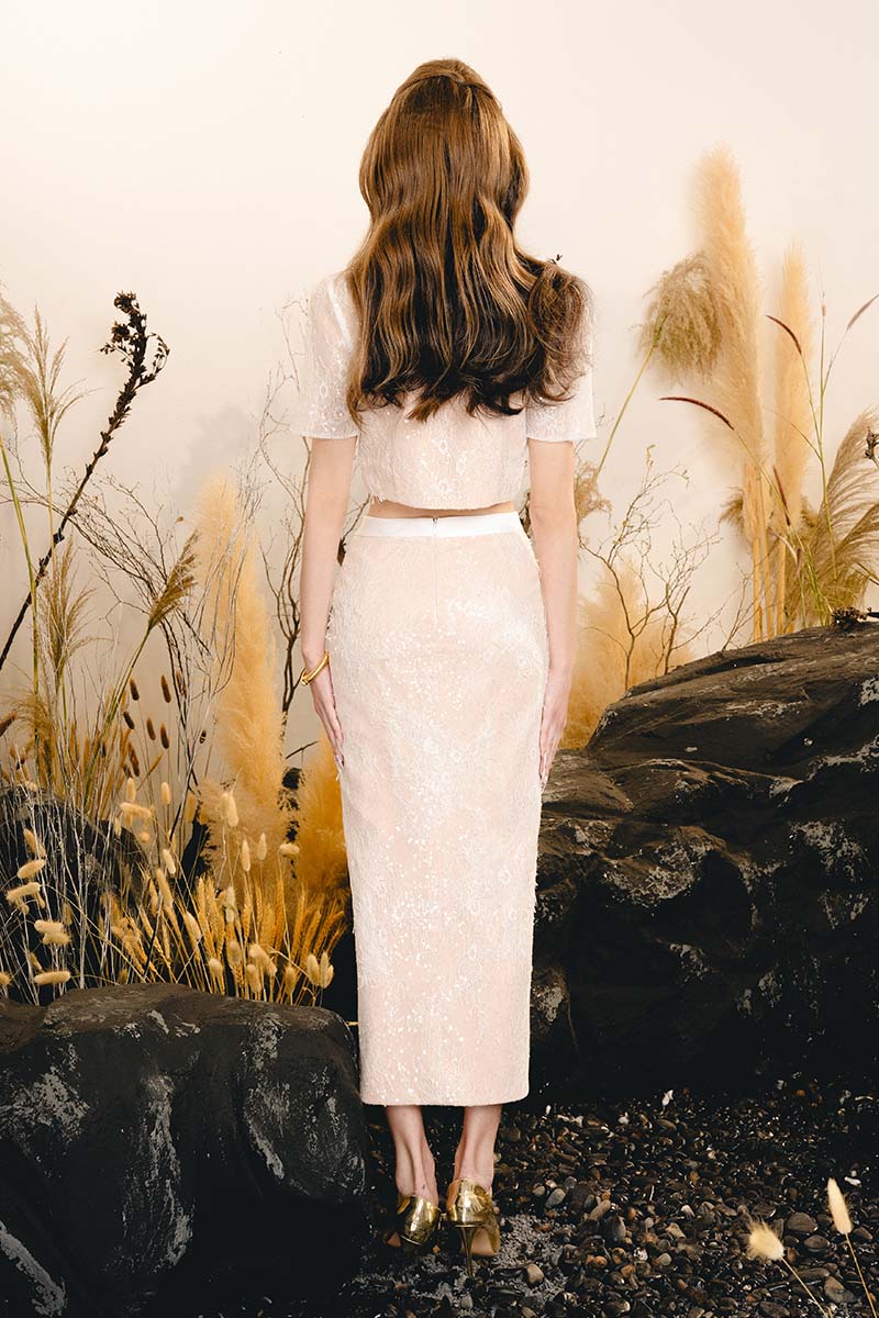 More choices for girls who are looking for elegant, modern beauty but not too ostentatious with the design launched in Do Long’s The Exquisite collection. The croptop shirt style with exposed waist shows off the figure combined with a pencil skirt using lace material with motifs combined with cotton fabric and metal buttons to create a new and unique highlight.