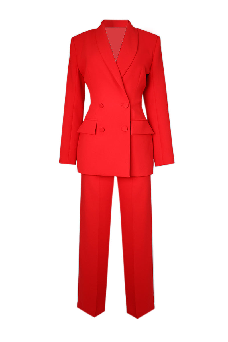The Red Hourglass Suit presents the epitome of contemporary sophistication with its Red Hourglass Blazer, boasting refined details for a distinguished aesthetic. The blazer, adorned with four exquisite front buttons and a classic lapel collar, commands attention with its hourglass silhouette tailored to accentuate the wearer's figure. Complete with full sleeves and subtle shoulder pads, this ensemble exudes confidence and refinement