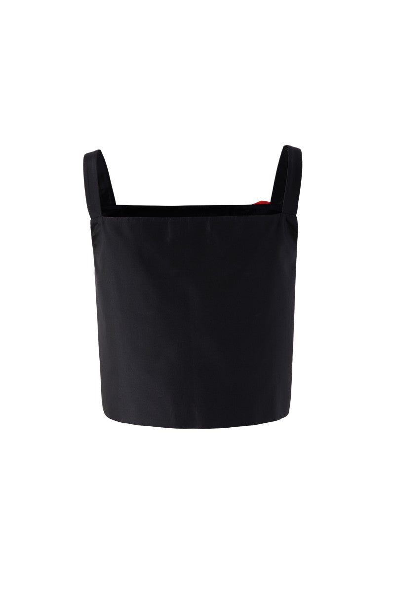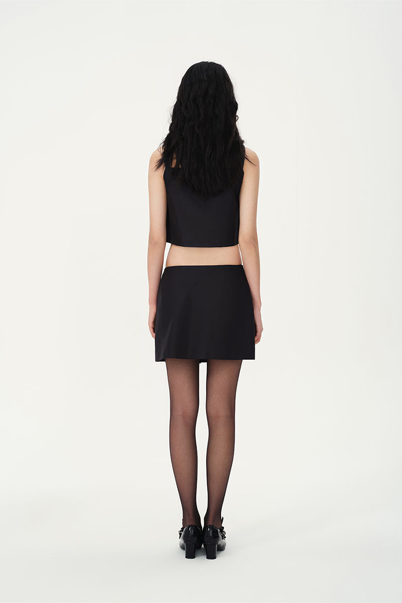 - The cropped top features shoulder straps with matching mini skirt
